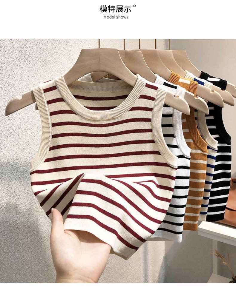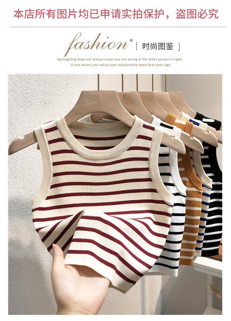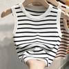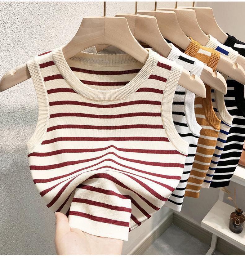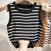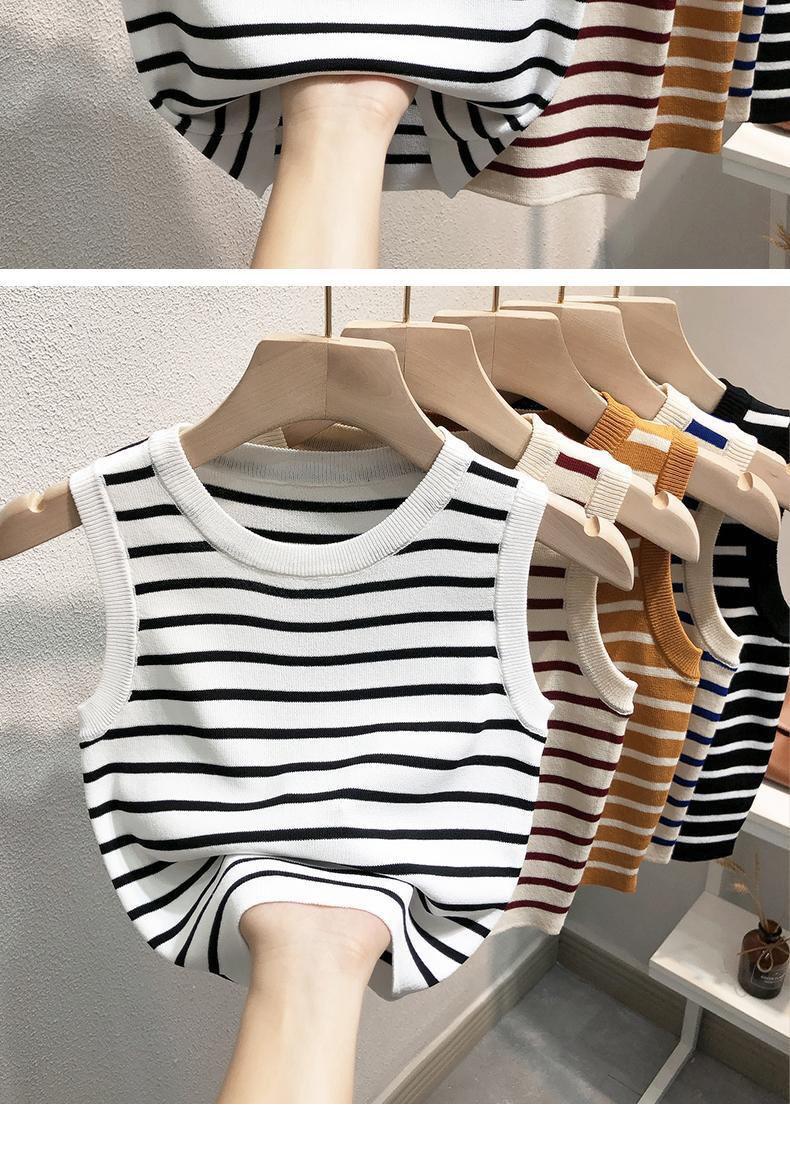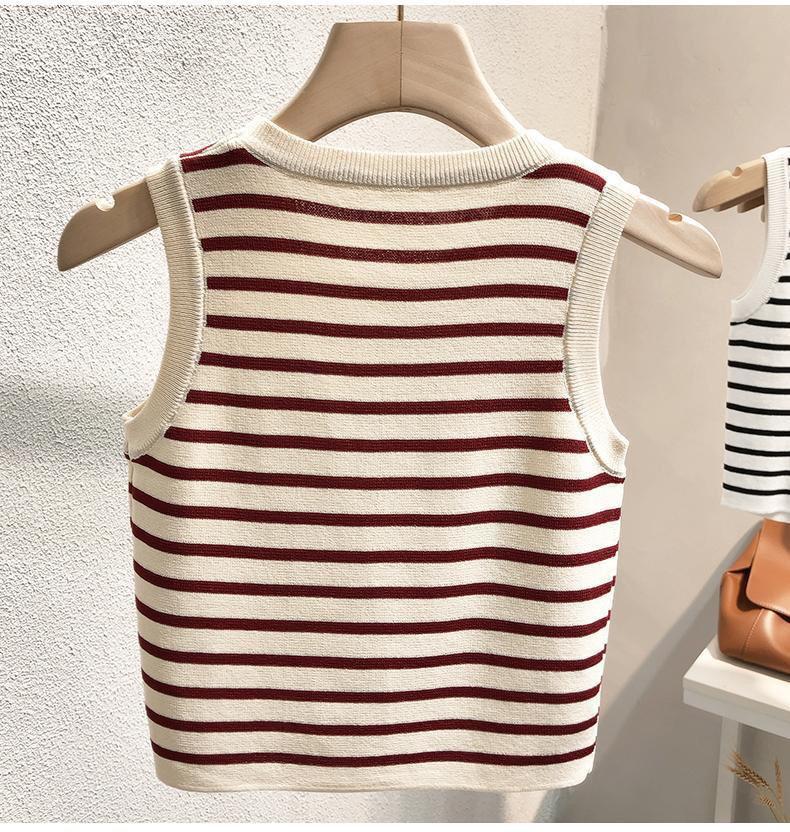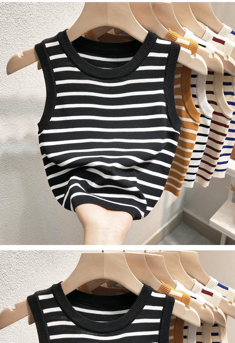 Camisola de seda de hielo para mujer, camiseta interior de verano, para uso interior y exterior, año nuevo, top de punto corto a rayas negro
