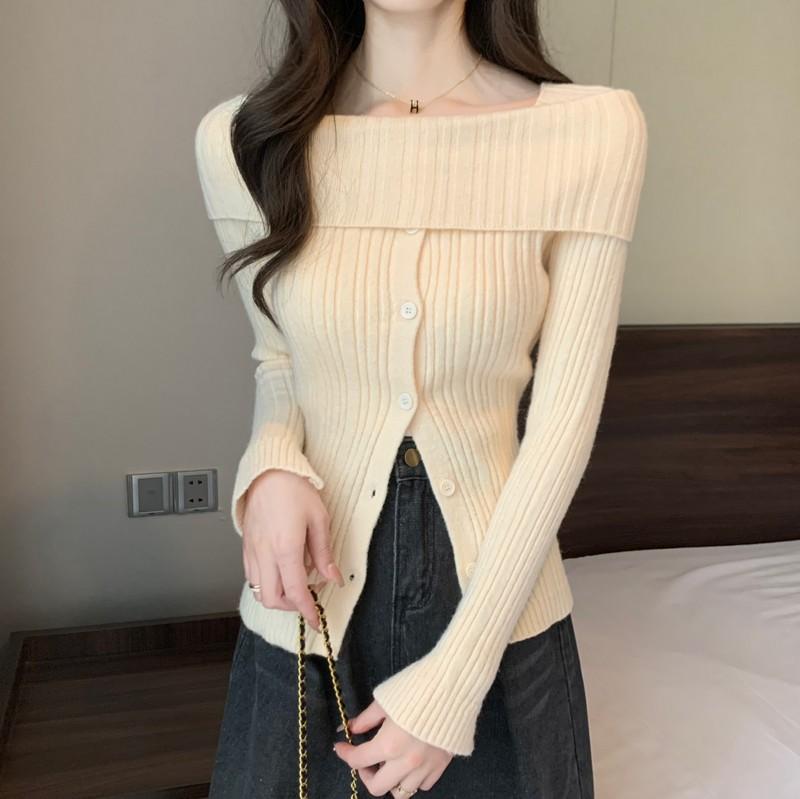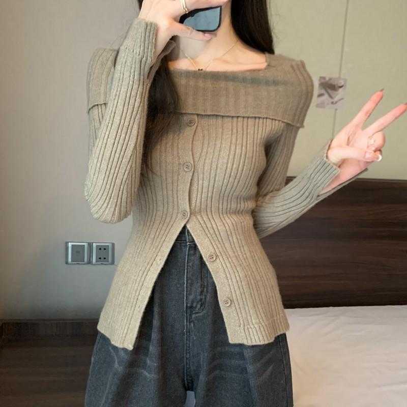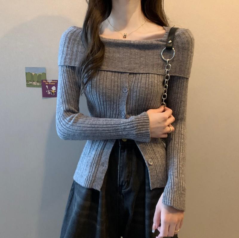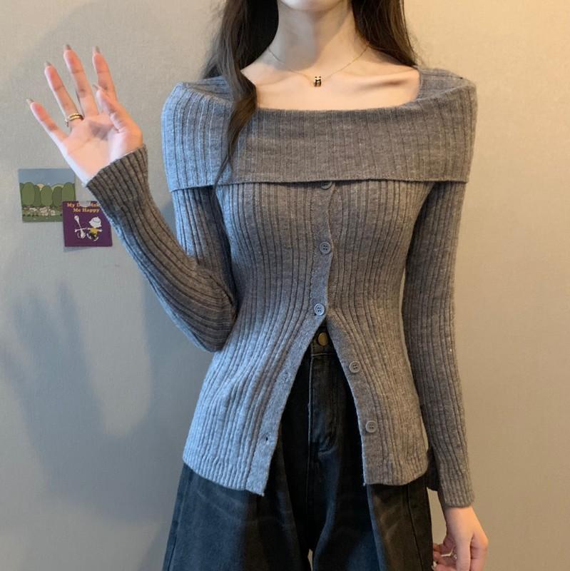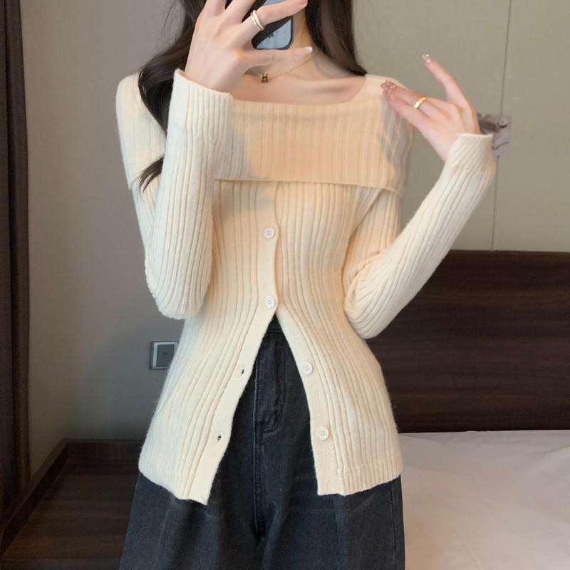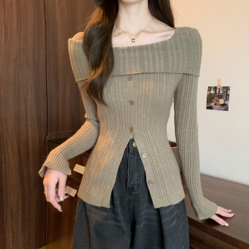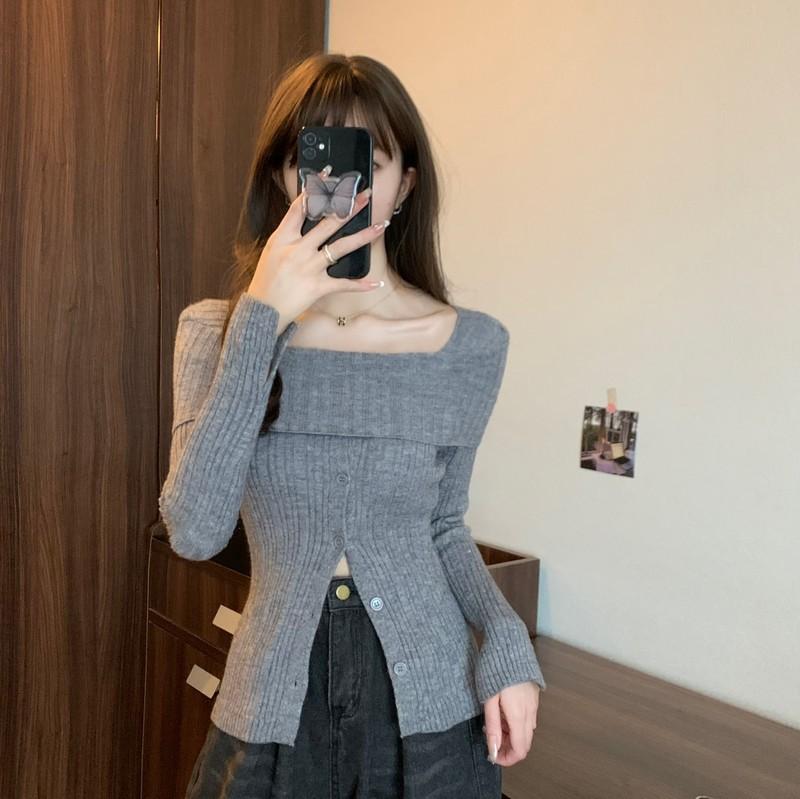 Suéter de cuello cuadrado dividido con diseño de estilo coreano de estilo suave para mujer, nueva moda elegante de otoño, top adelgazante ajustado