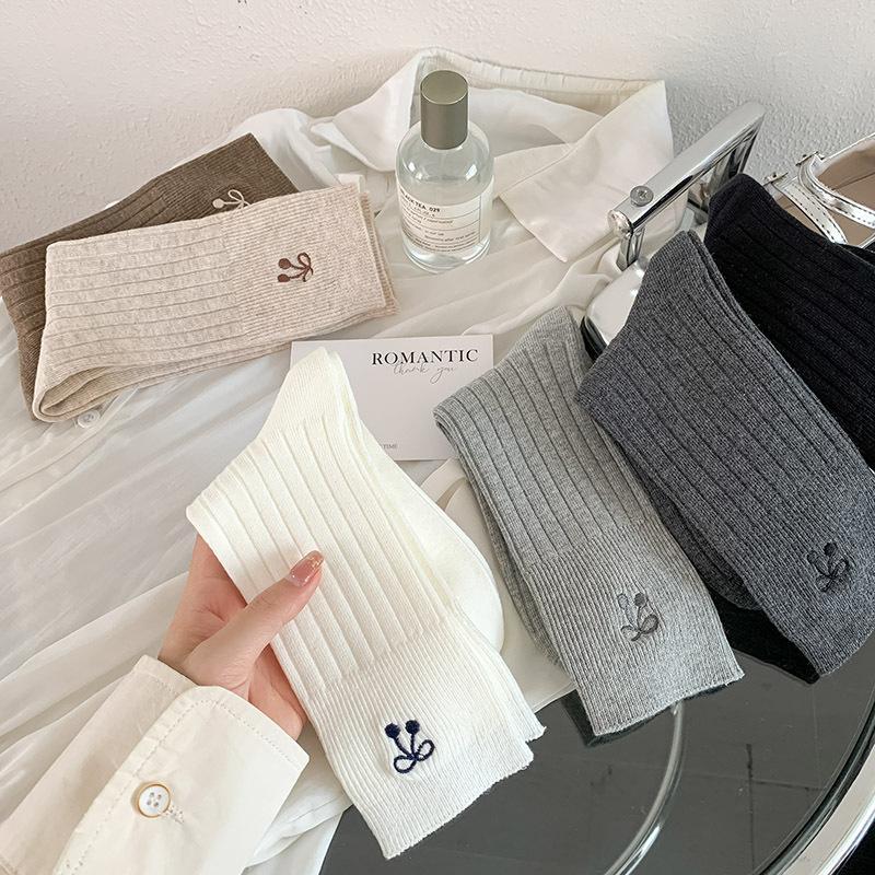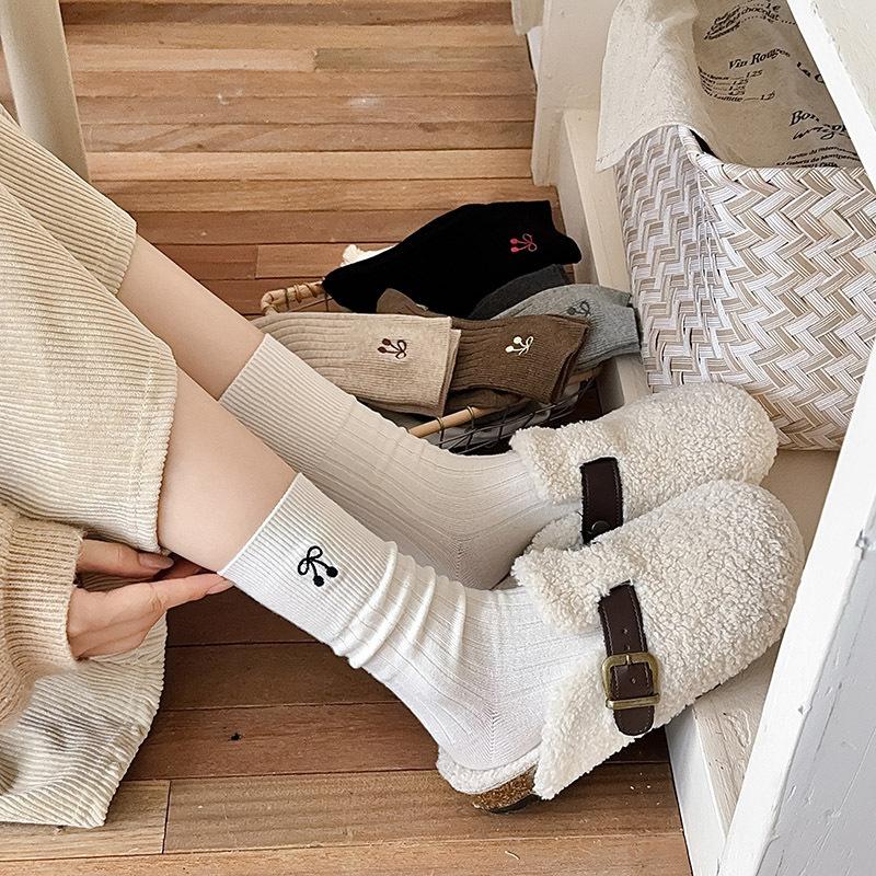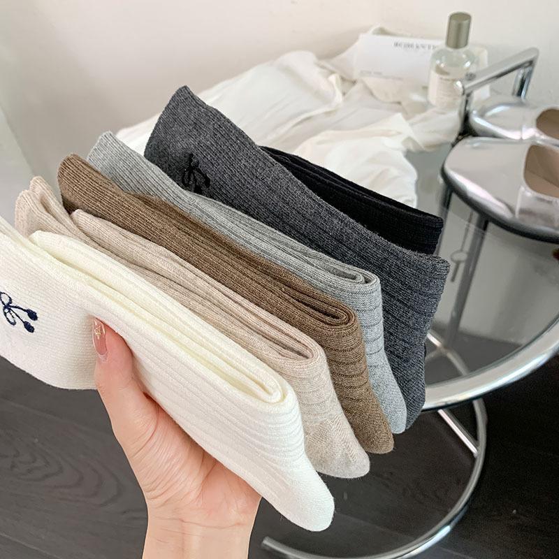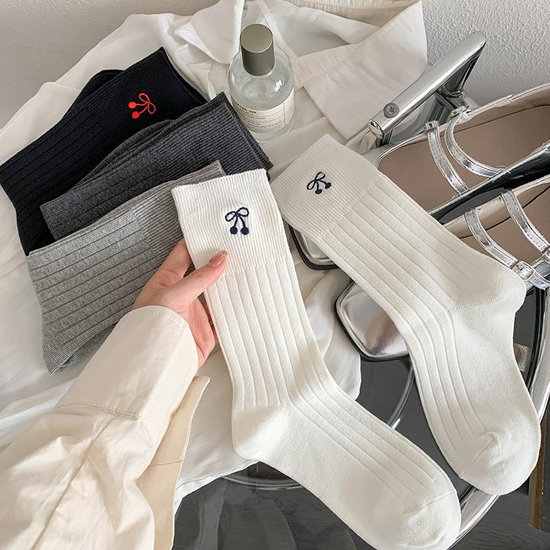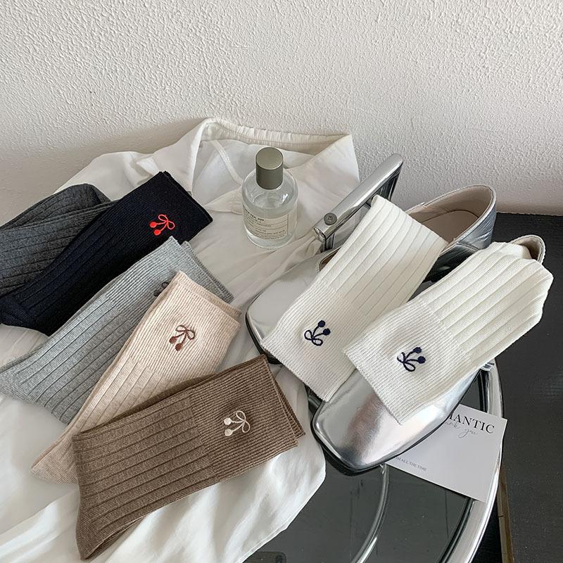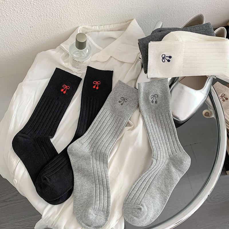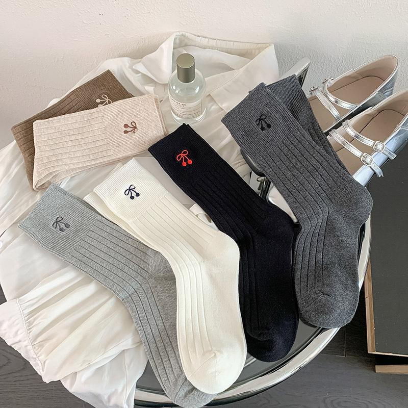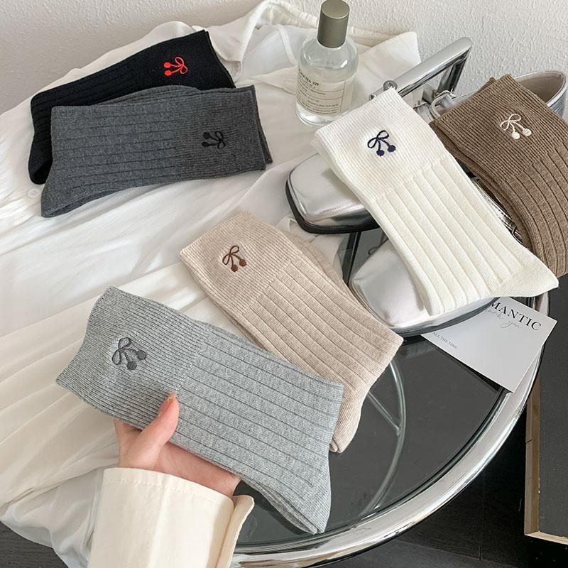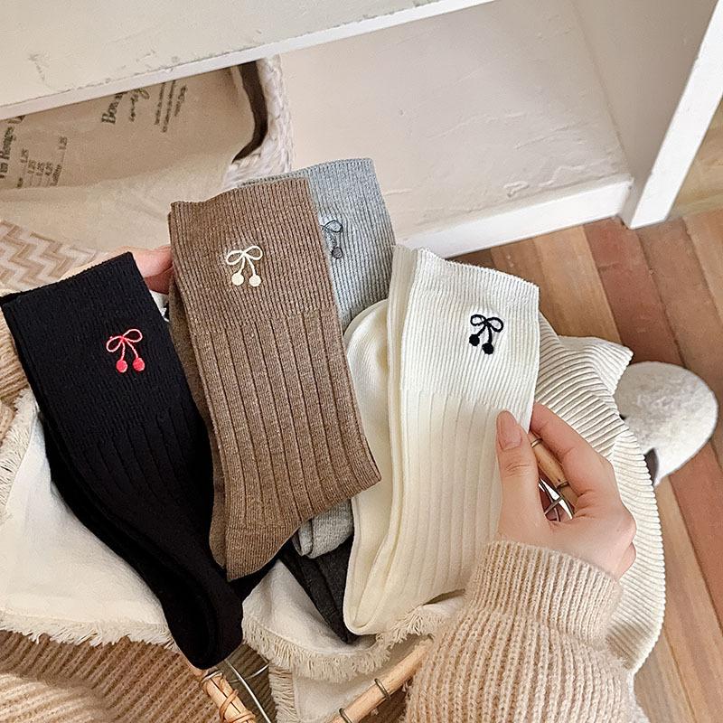 Medias japonesas con bordado de cerezas de colores para niños, calcetines de mujer, cajones, calcetines apilados de moda de otoño e invierno, algodón, venta al por mayor, embalaje independiente