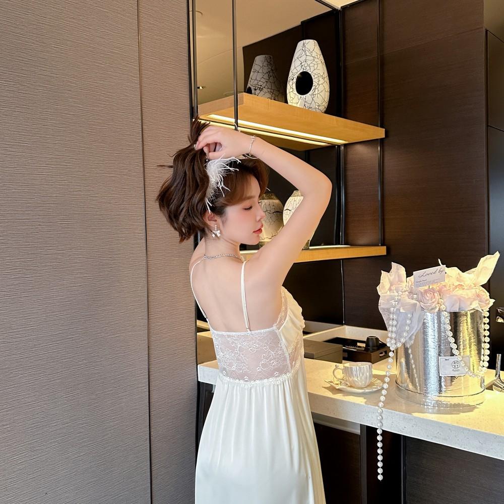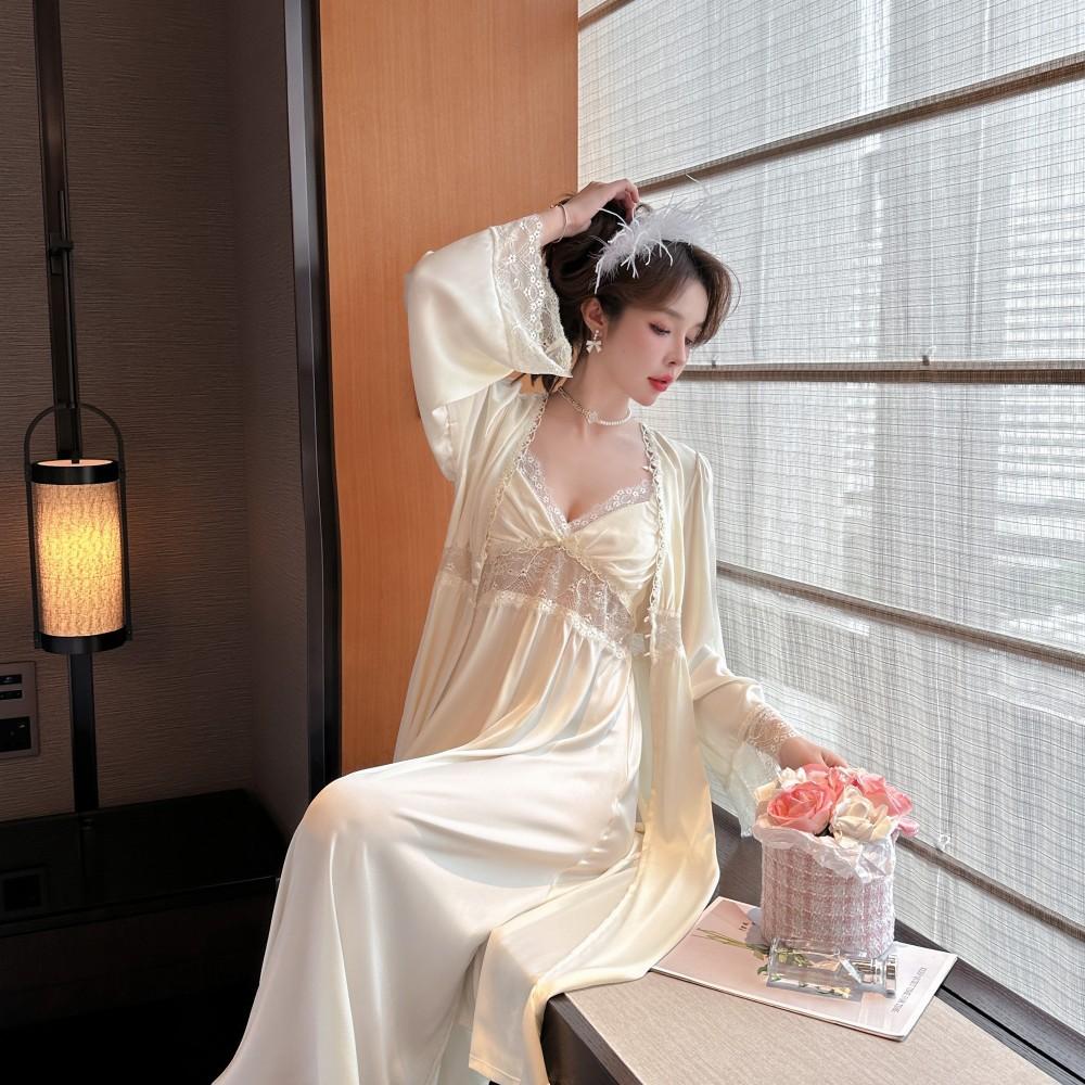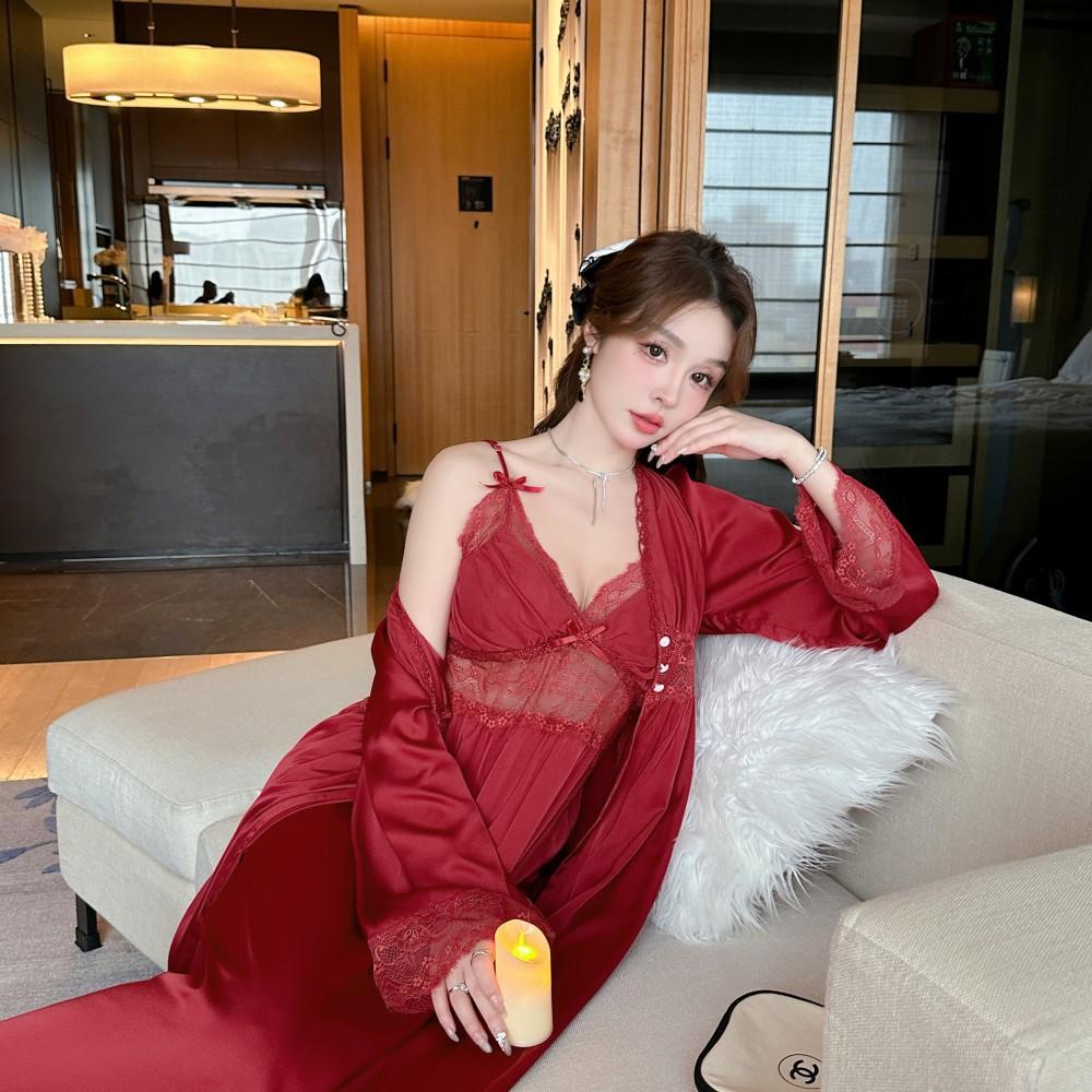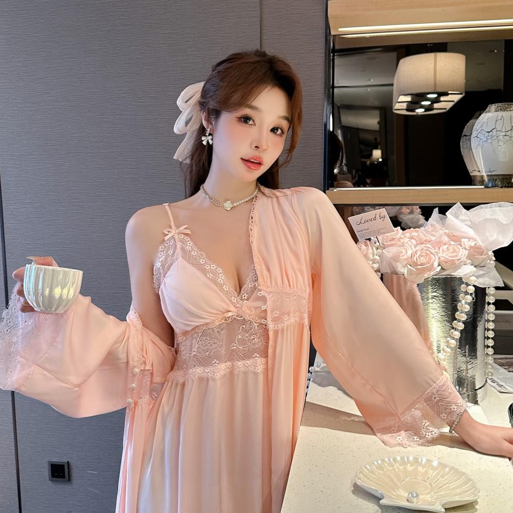 Pijama francés de primavera y otoño para mujer, camisón sexy de dos piezas de encaje de seda helada con tirantes y almohadilla para el pecho, ropa para el hogar
