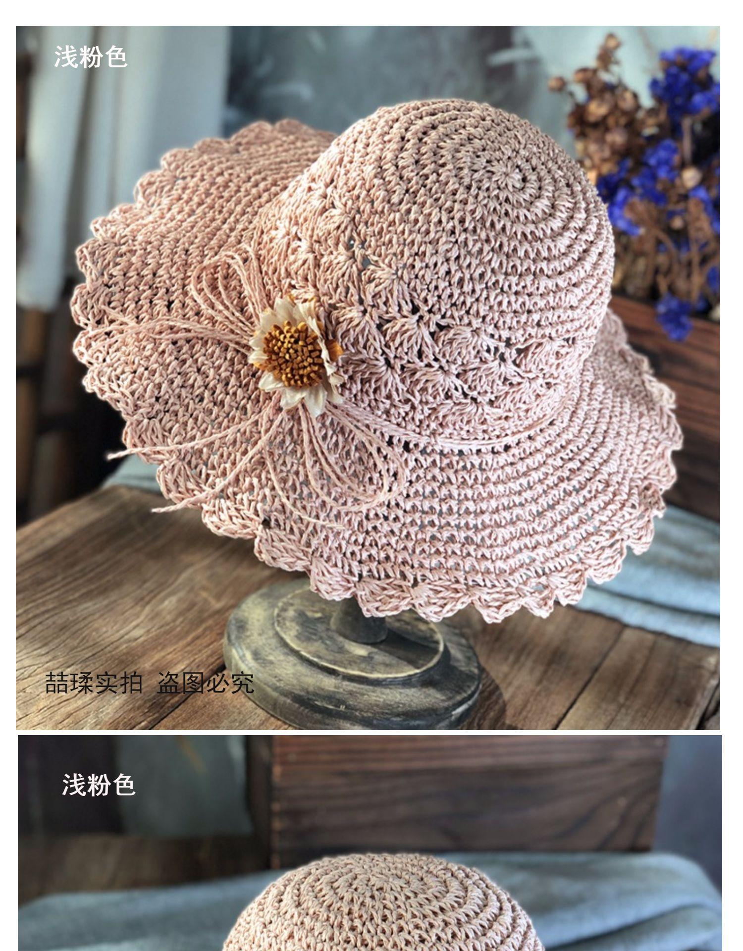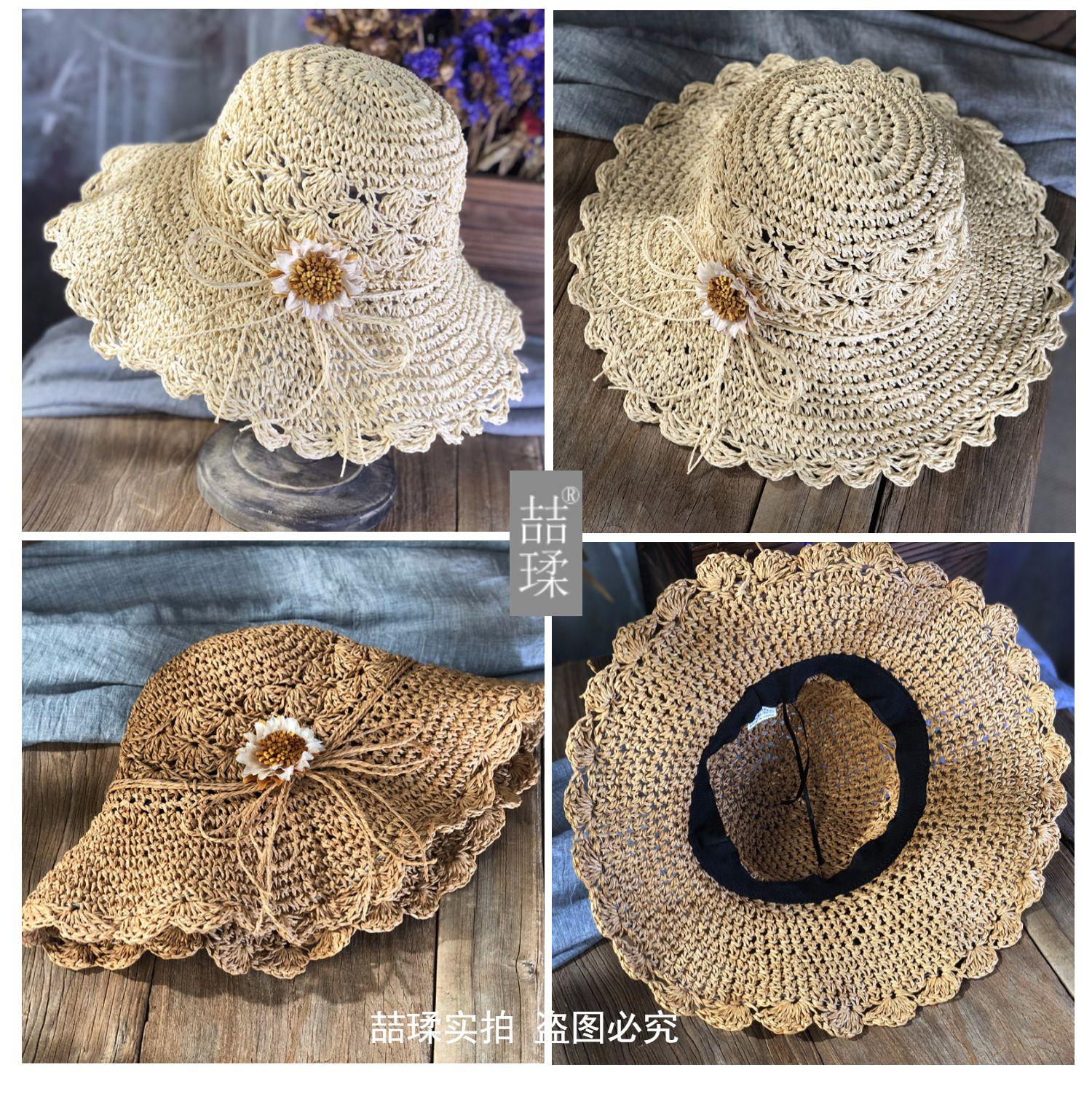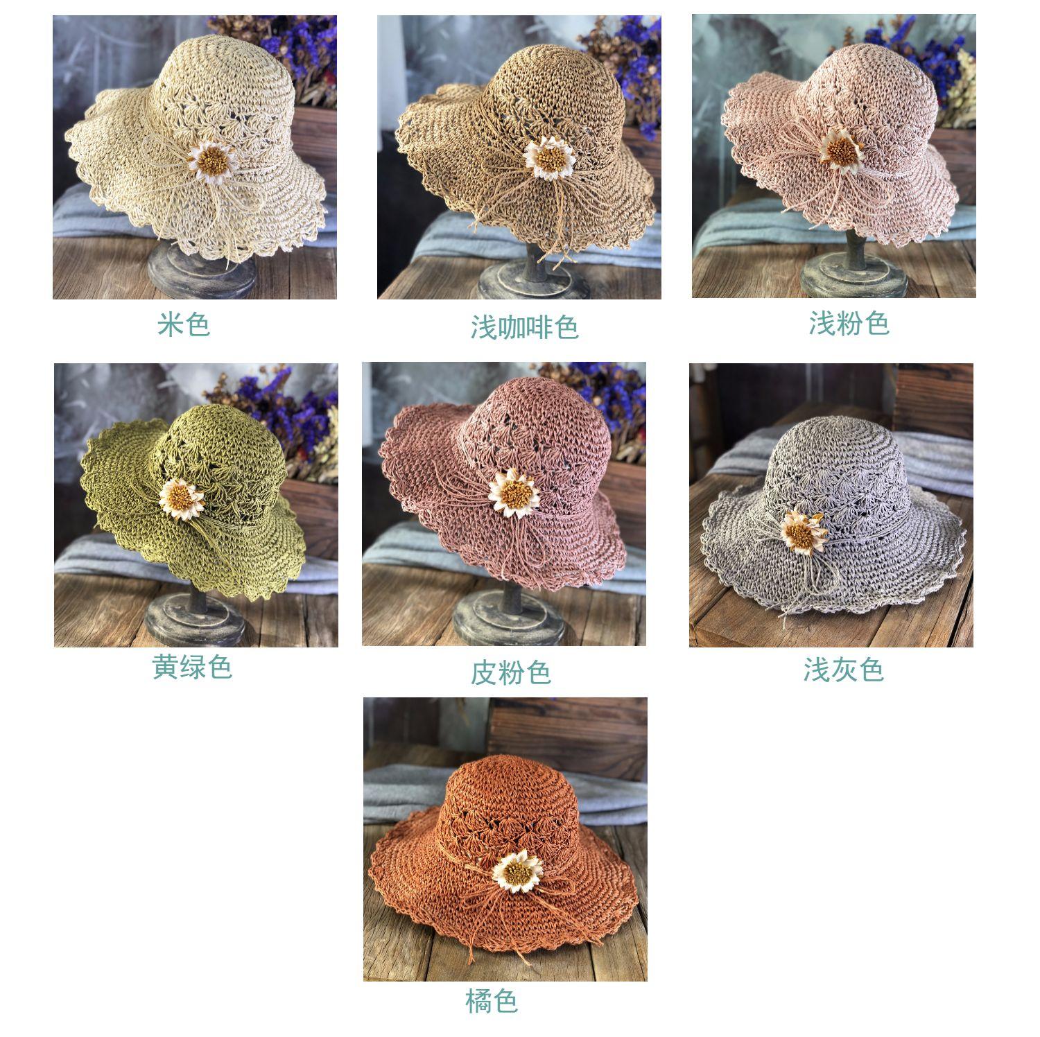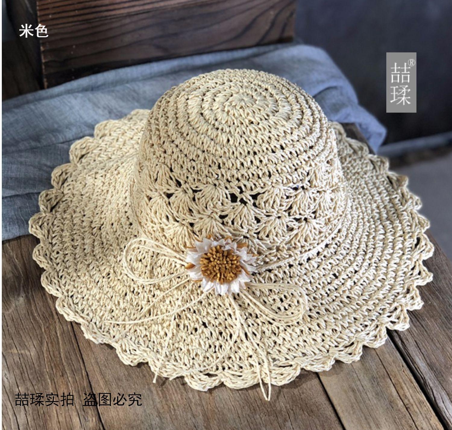Fan-shaped crocheted yellow heart sunflower edge straw hat beige MDCM-001, Fan-shaped crocheted yellow heart s...