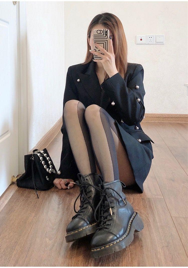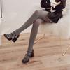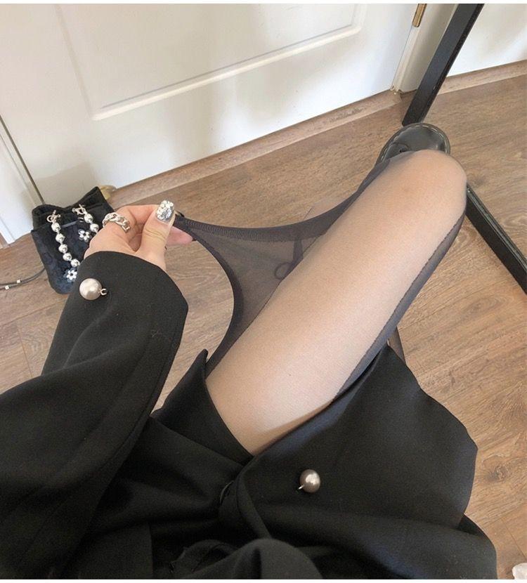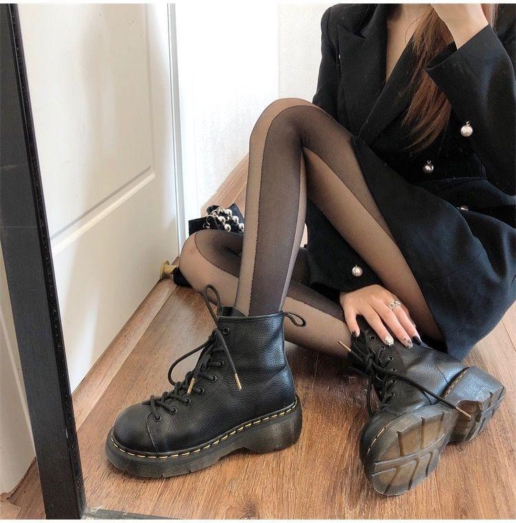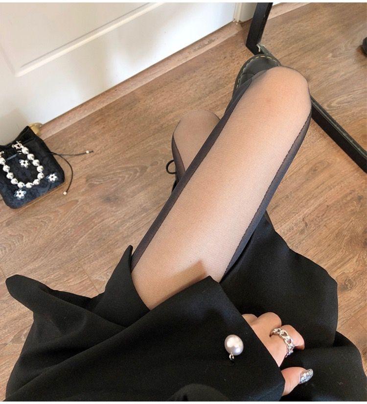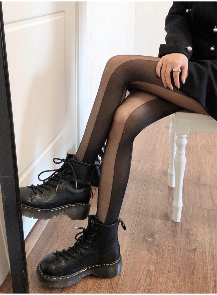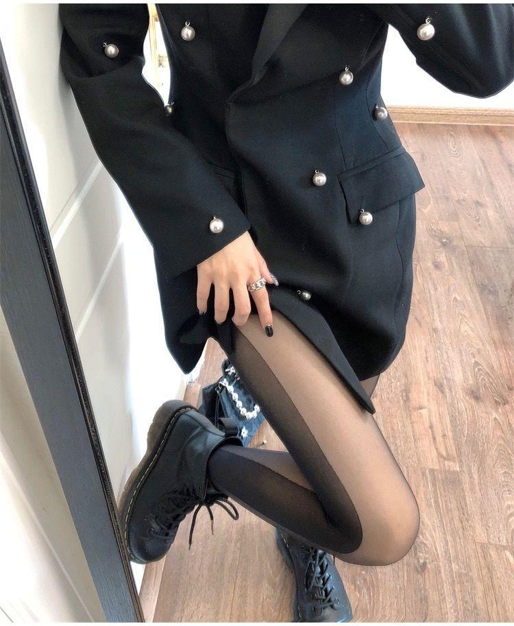 Medias adelgazantes de estilo similar a las de celebridades de Internet, con rayas verticales laterales y costuras, de seda negra, con efecto sombra.