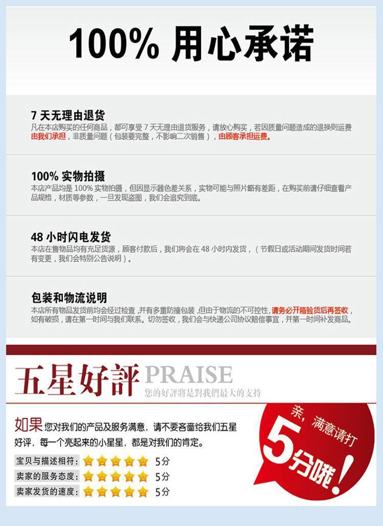 4. Sobre las devoluciones:Nos dedicamos al negocio mayorista de producción en masa, no al menudeo, y no podemos garantizar que cada producto sea perfecto. Si hay algún problema de calidad, por favor contacte al servicio al cliente para la devolución, y la tarifa de envío de la devolución correrá a cargo del comprador.