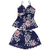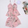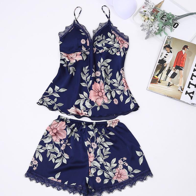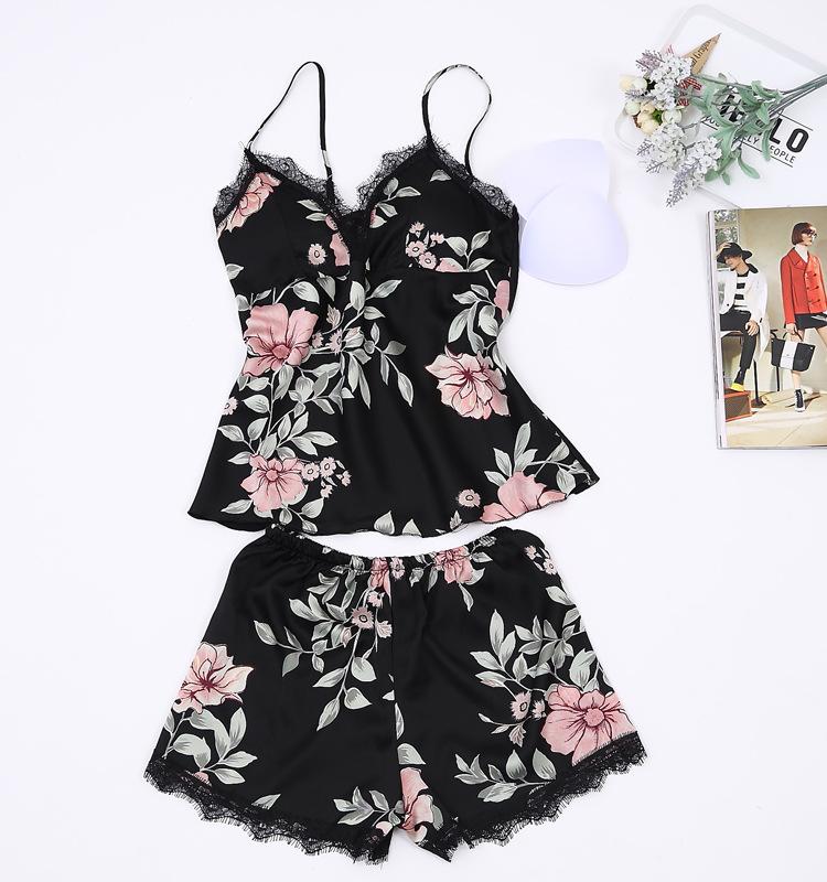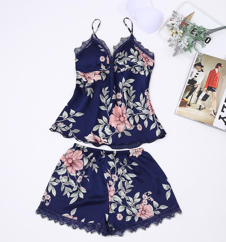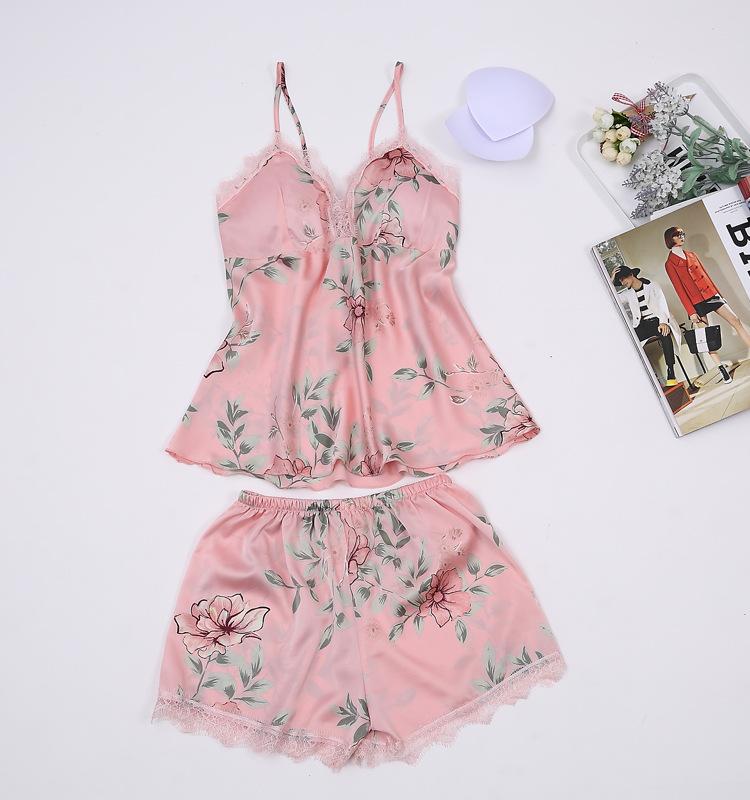 Conjunto de dos piezas de pijama sexy de seda con tirantes de verano para mujer, con almohadilla para el pecho y pantalones cortos de tirantes de color.