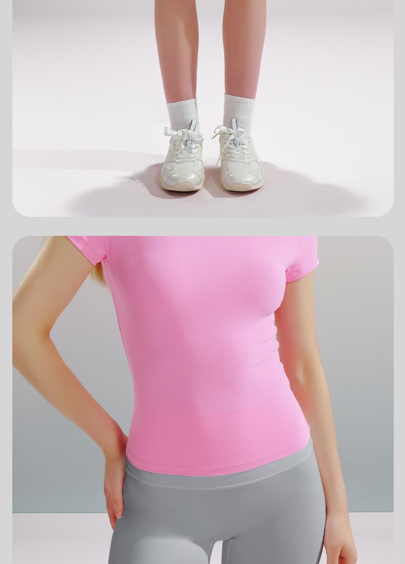 Shuangshi - Ropa de yoga sin costuras para primavera y verano, para mujer, color piel, corte ajustado, para correr, fitness, cuello redondo, alta elasticidad, mangas cortas