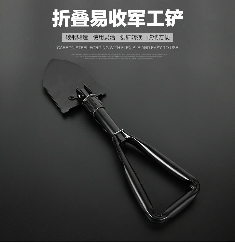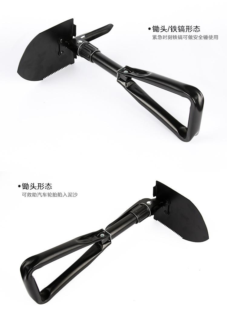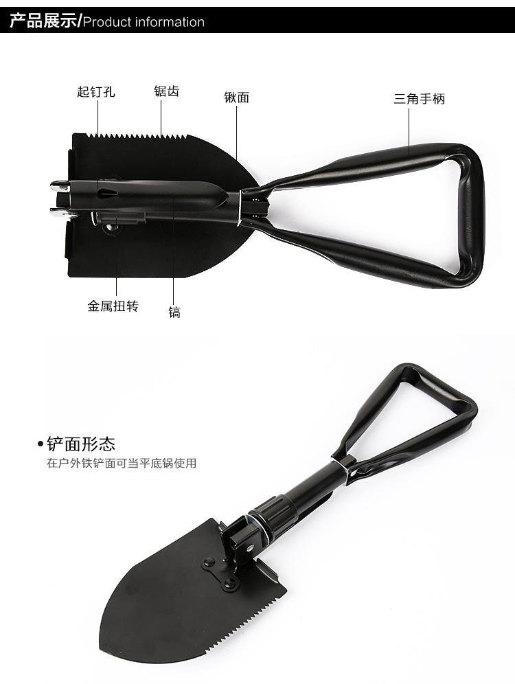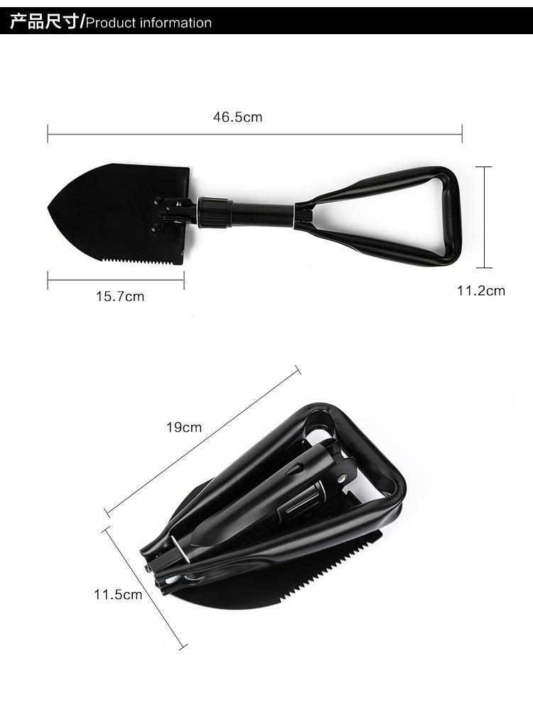 2. Este producto es una pala militar plegable. Cuando está en uso, solo necesita aflojar la cubierta del mango para liberar la pala y ajustarla a varios estados de uso. Cuando no está en uso, solo afloje la cubierta y pliéguela en tres secciones. No ocupa espacio y es fácil de transportar y almacenar.