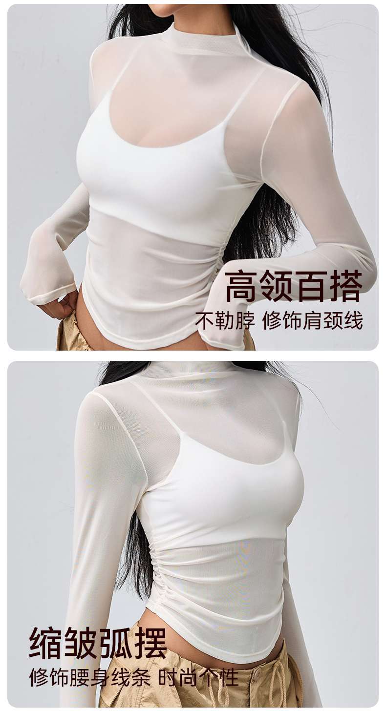 Traje de yoga deportivo de secado rápido y cuello alto para mujer, de malla, manga larga, blusa arrugada, cintura ajustada, para correr y fitness