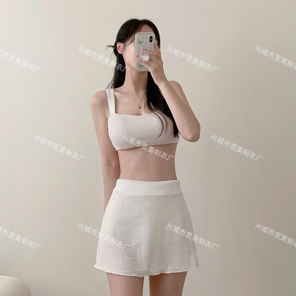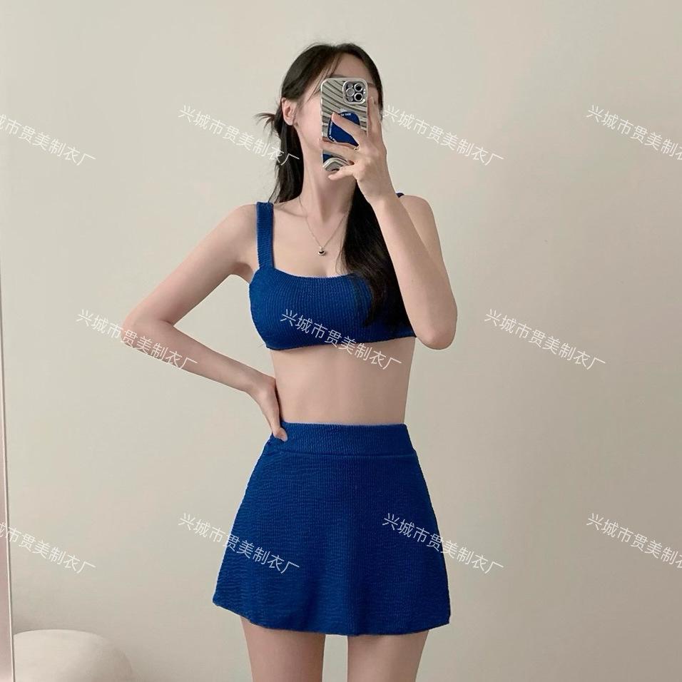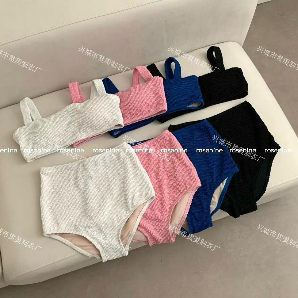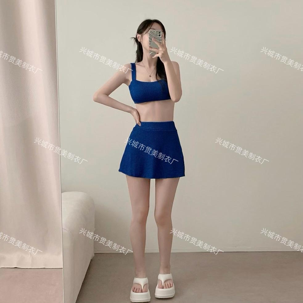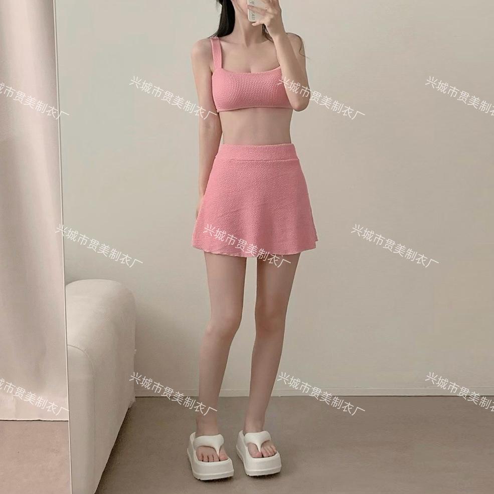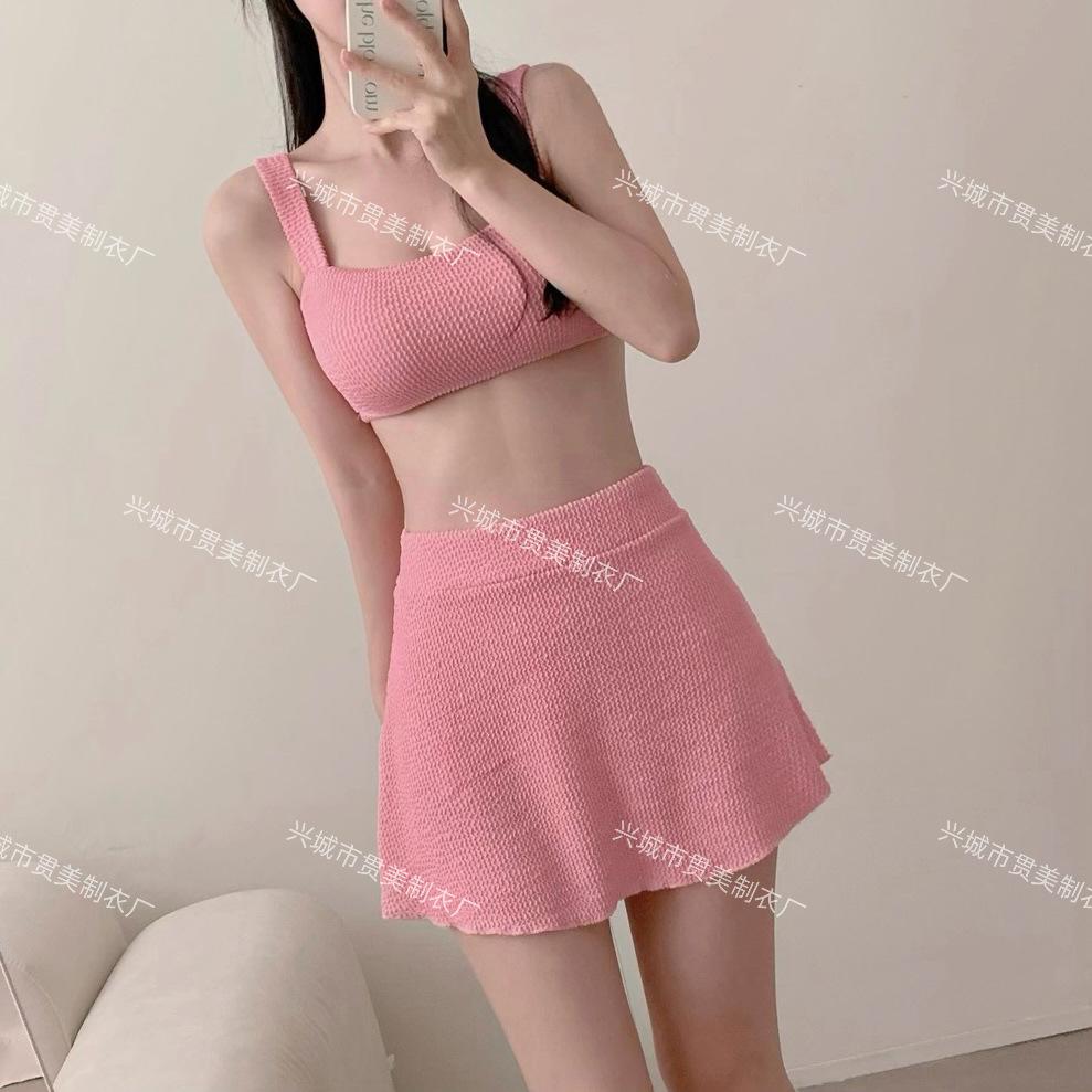 [4 colores] Traje de baño de tres piezas estilo retro sencillo de color caramelo para niña, bikini para playa