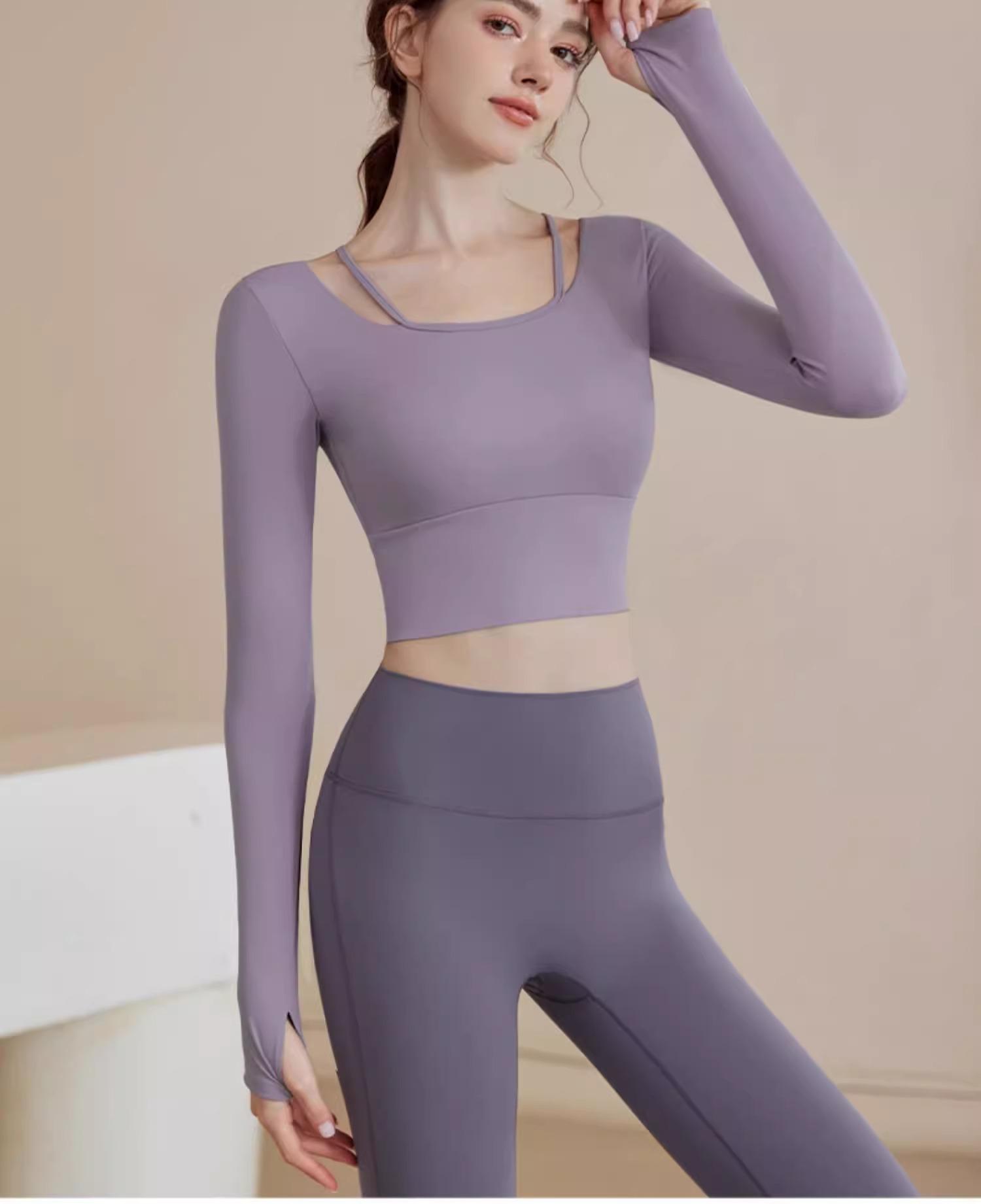 Purple top + gray and purple yoga pants