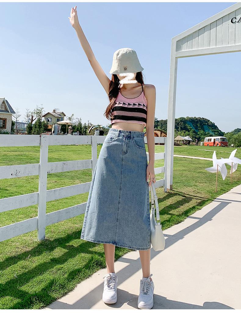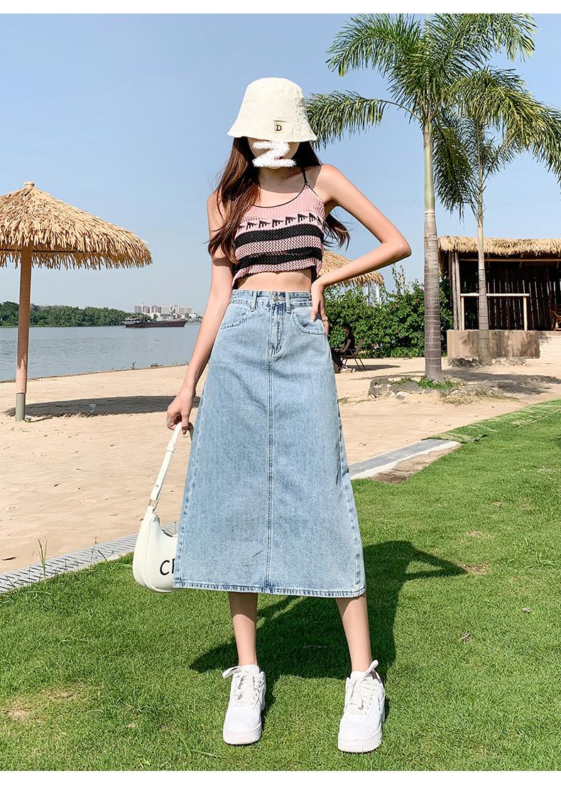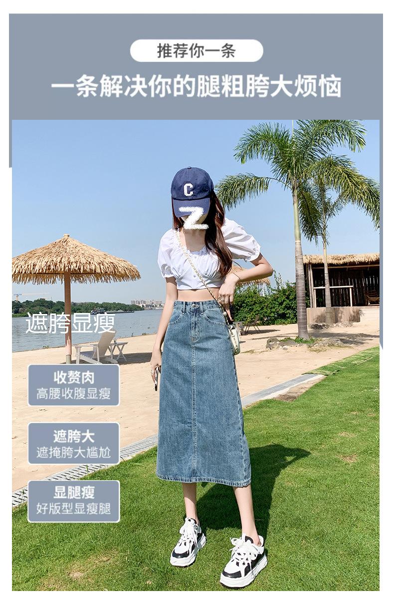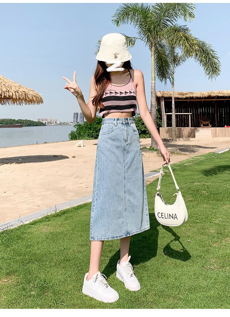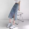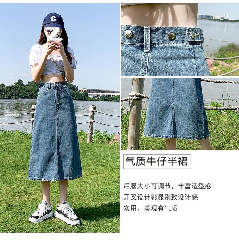 Falda de Mezclilla con Abertura para Mujer de Largo Medio 2024 Verano Nuevo Estilo Línea A Versátil Cintura Alta Ajustada a la Cadera