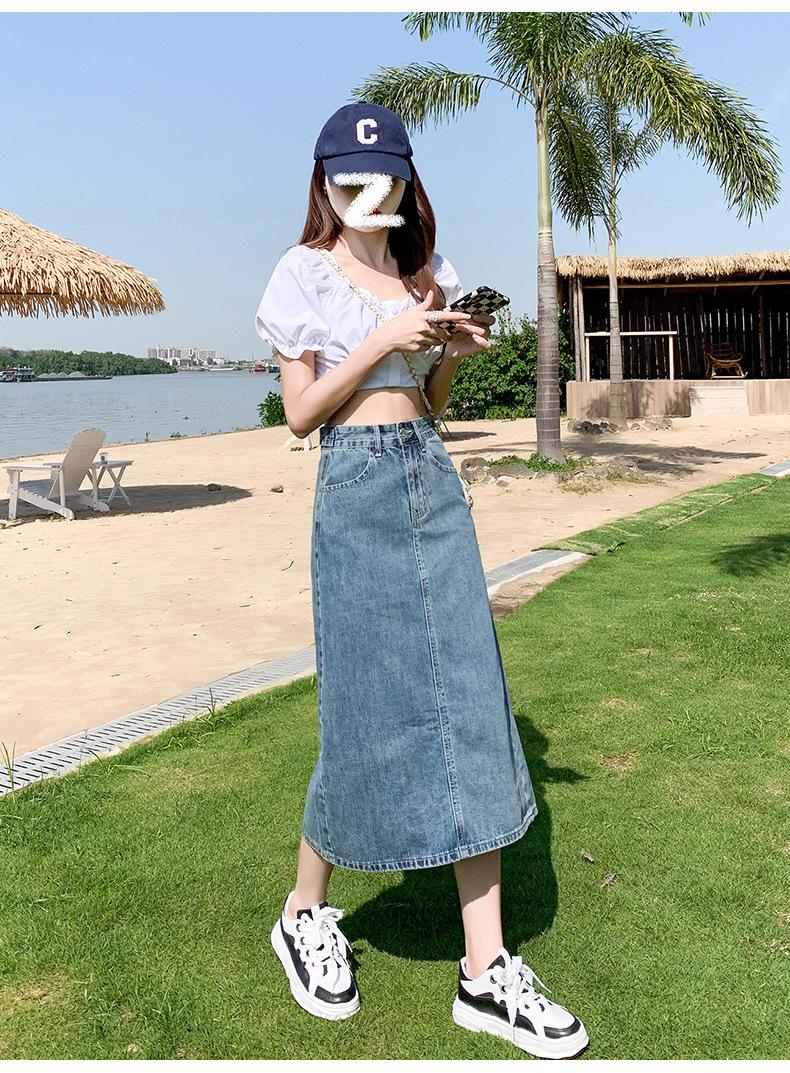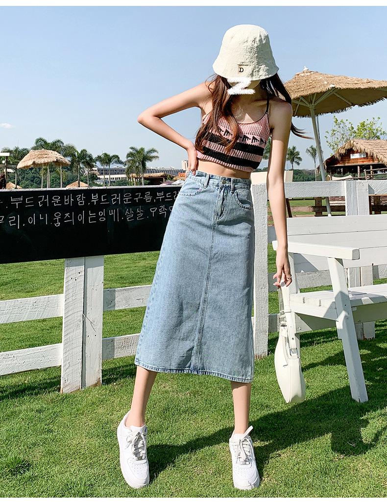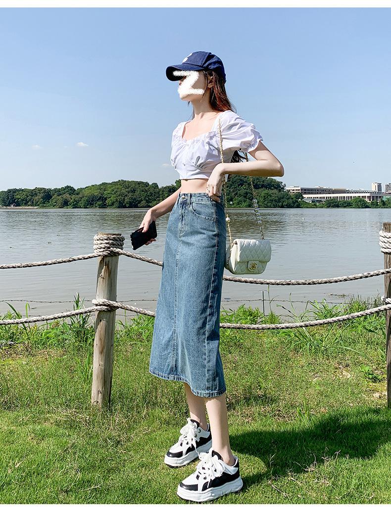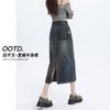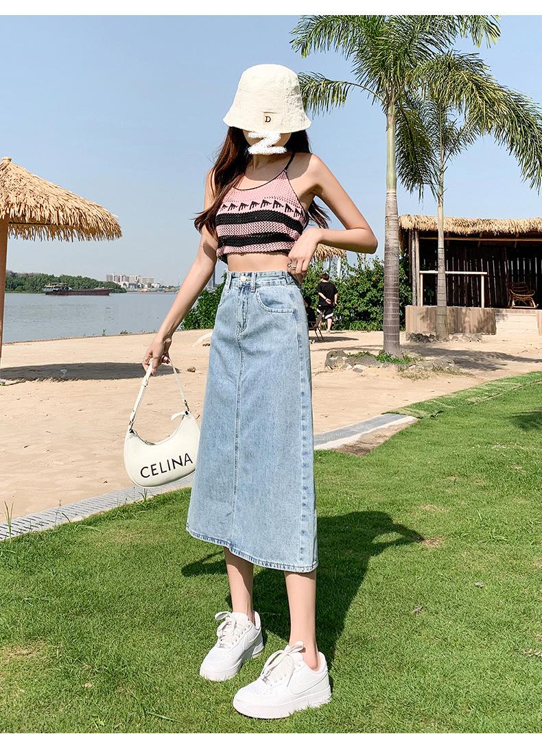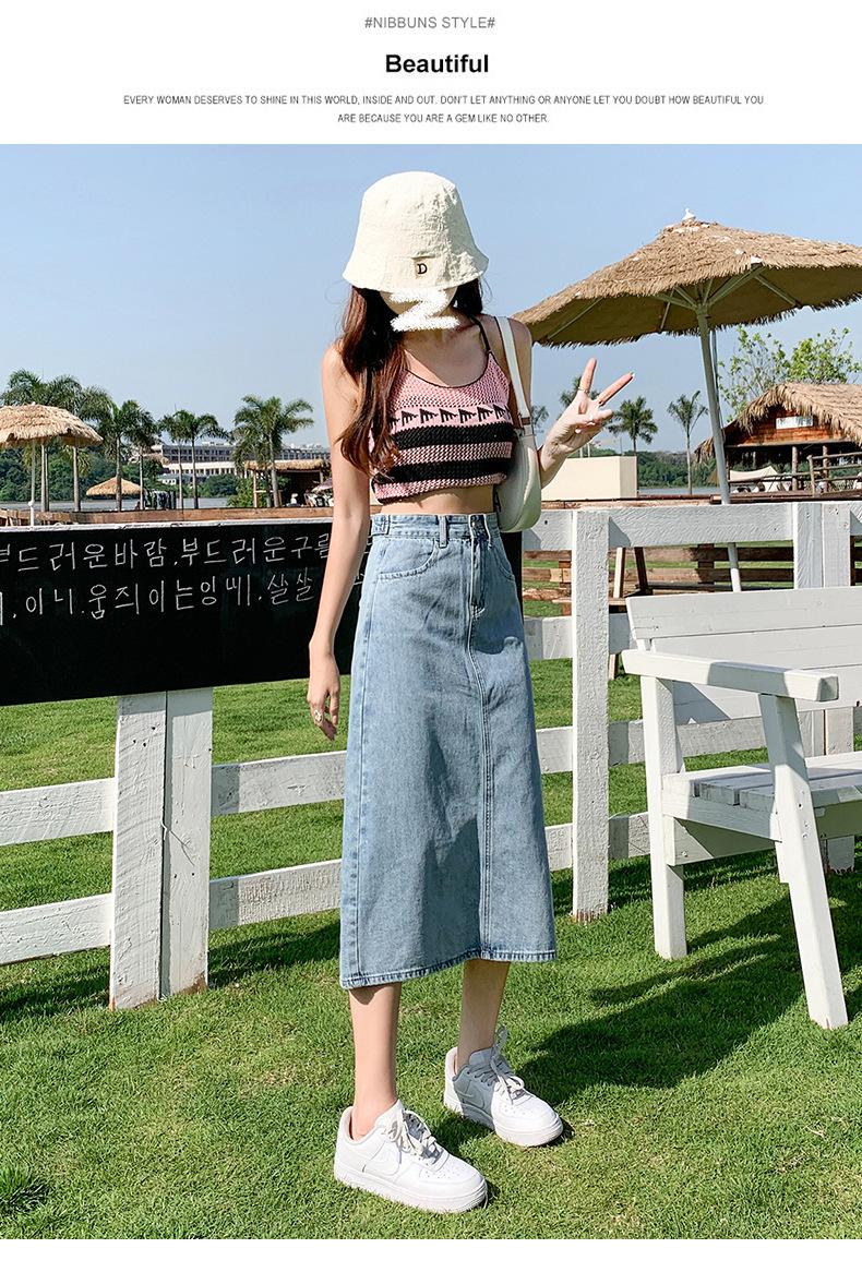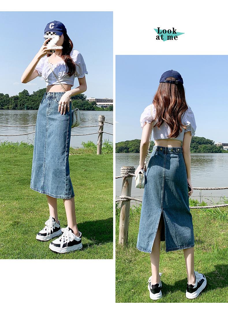 Falda de Mezclilla con Abertura para Mujer de Largo Medio 2024 Verano Nuevo Estilo Línea A Versátil Cintura Alta Ajustada a la Cadera