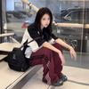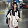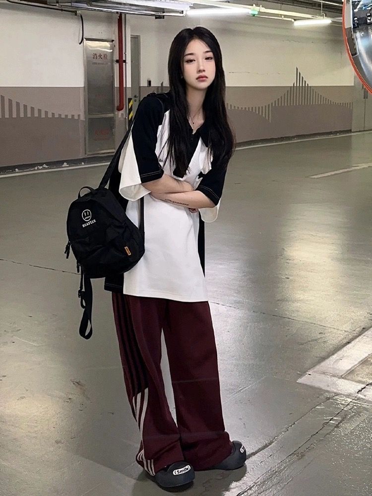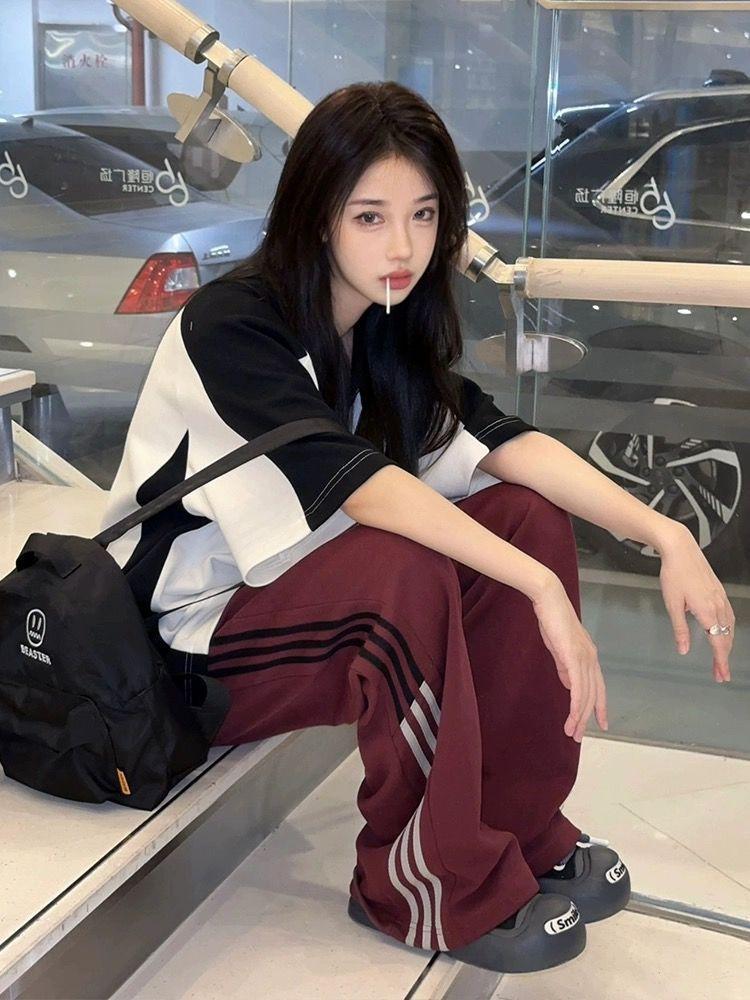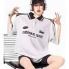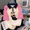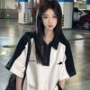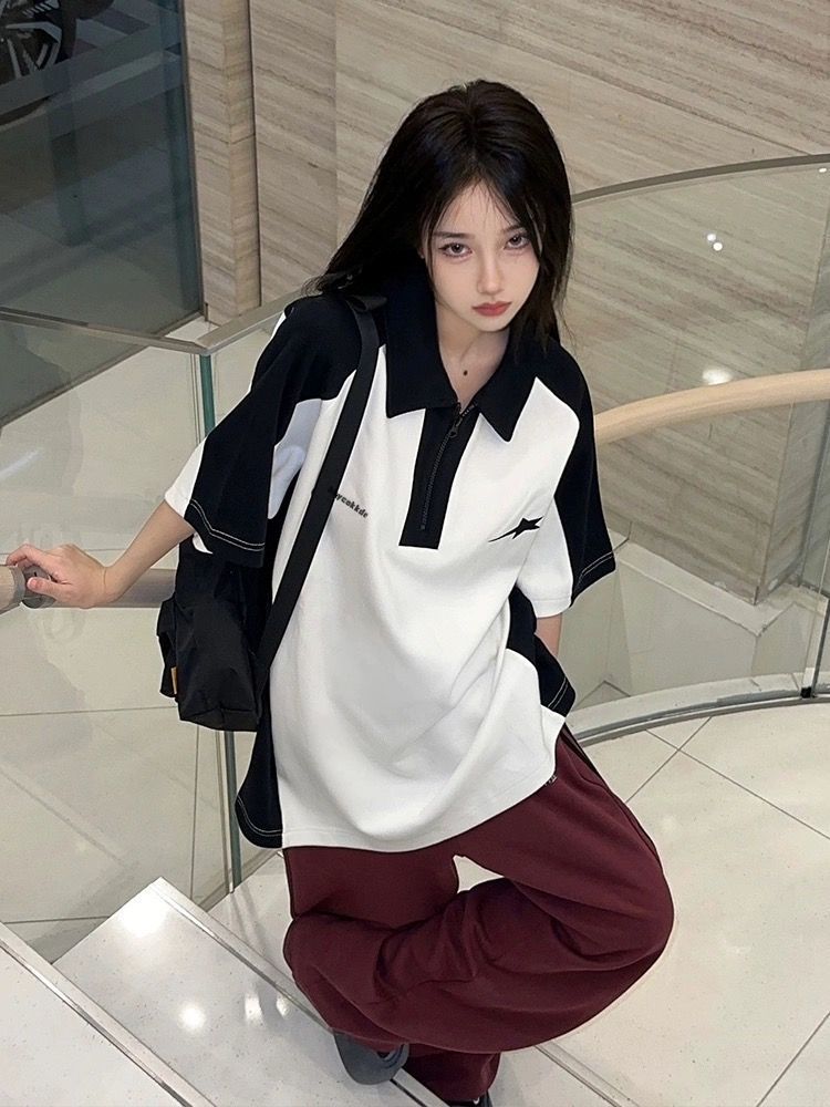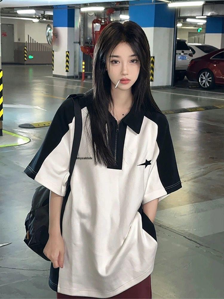 Camiseta Polo Retro Americana de Manga Corta para Mujer Verano Estrella Solapa Camiseta Pareja Manga Corta Holgada Empalme de Color en Contraste Top