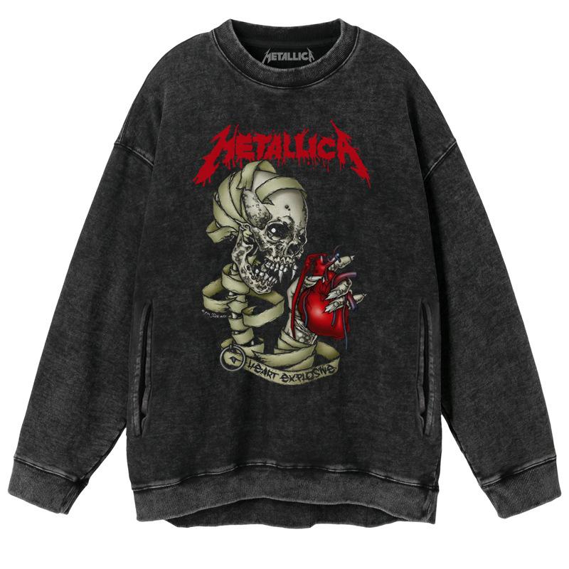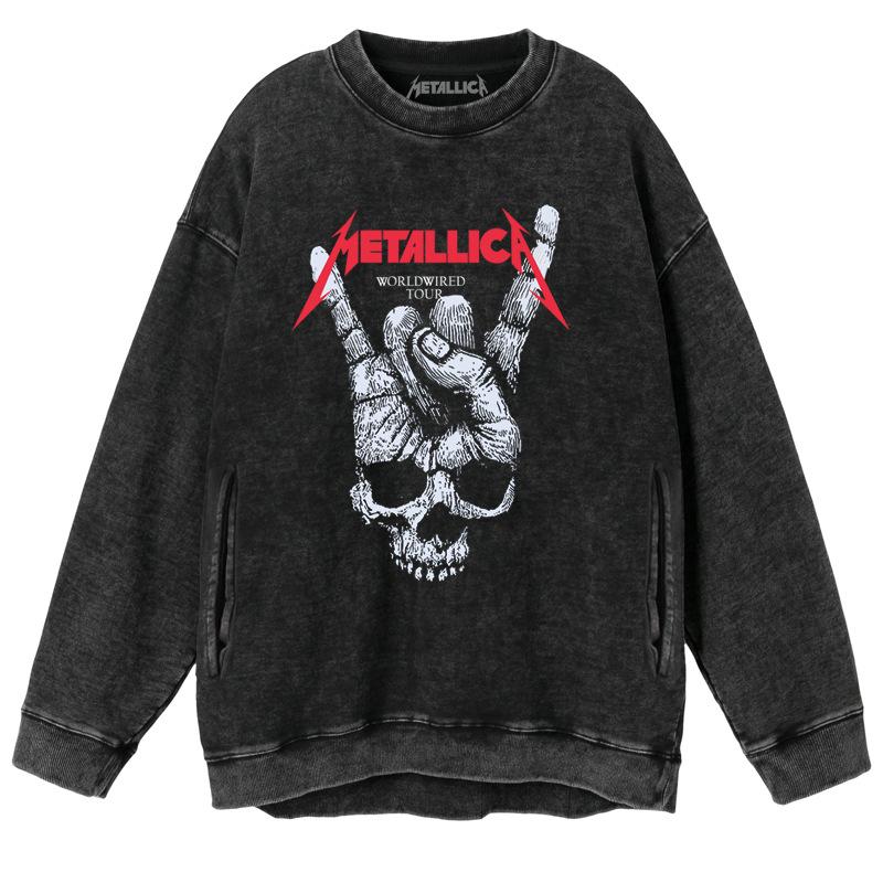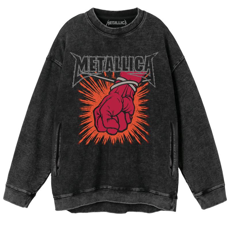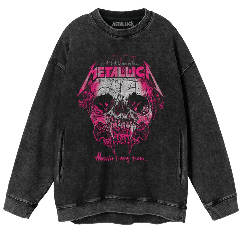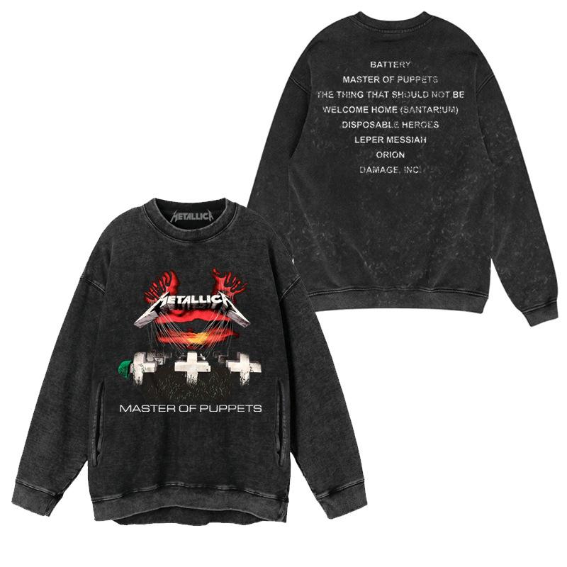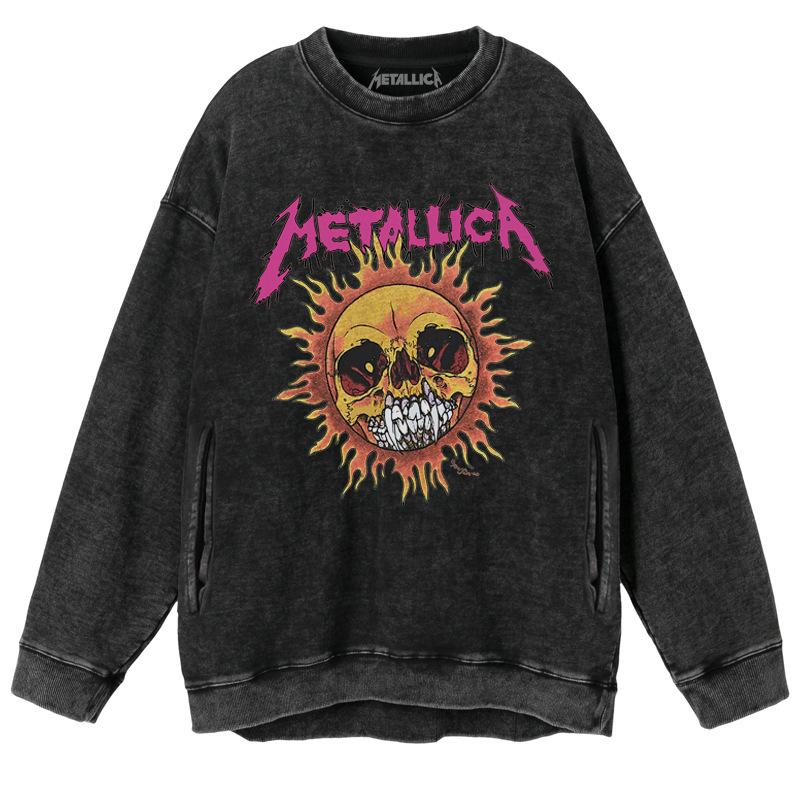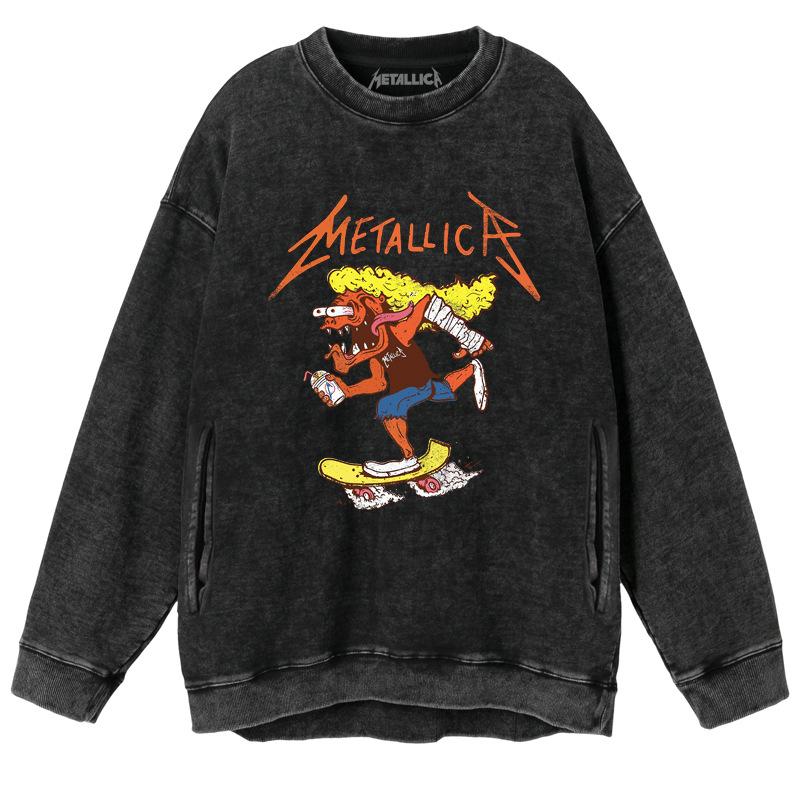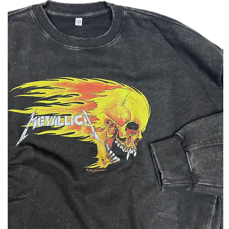 Suéter de cuello redondo para hombre con diseño de batik vintage desgastado y lavado de la banda de metal Metallica King, rock punk