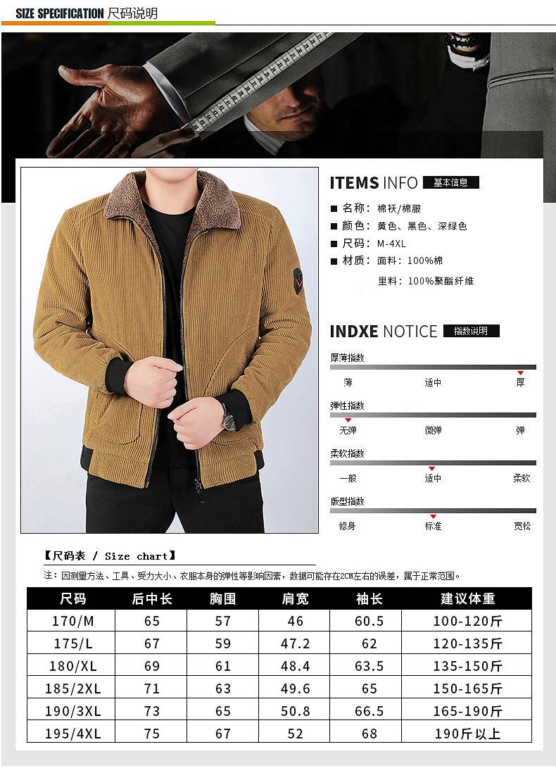 Chaqueta de algodón de pana nueva de invierno 2019, abrigo holgado de algodón de talla grande para personas de mediana edad y mayores, abrigo cálido de algodón para tiempo libre 9919