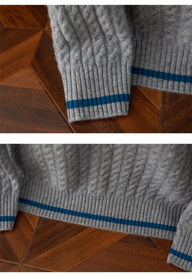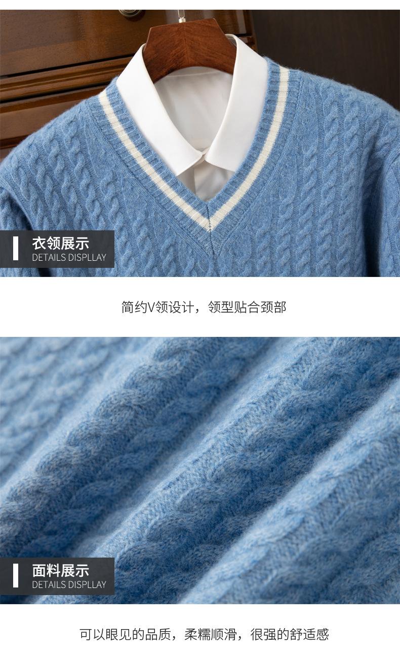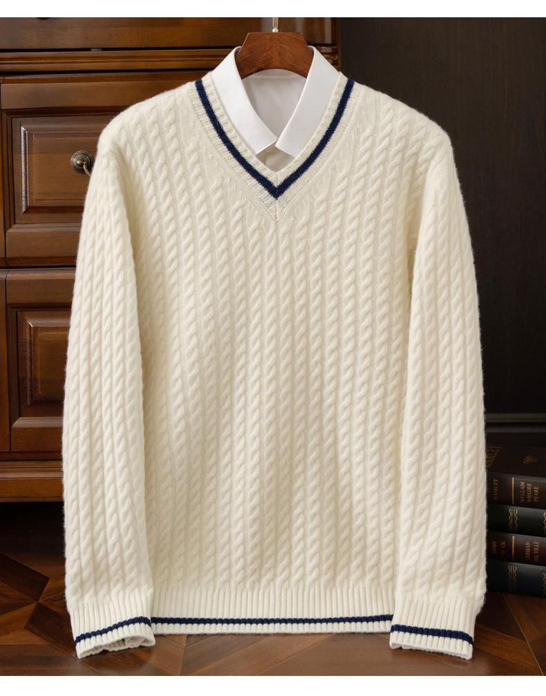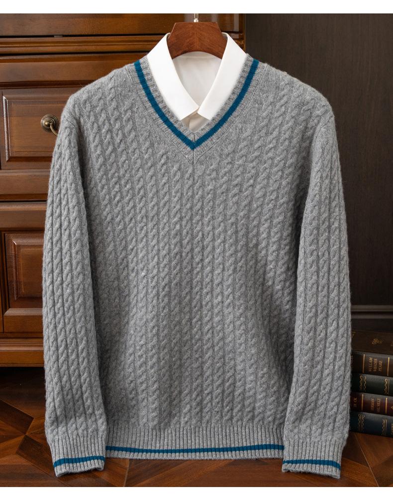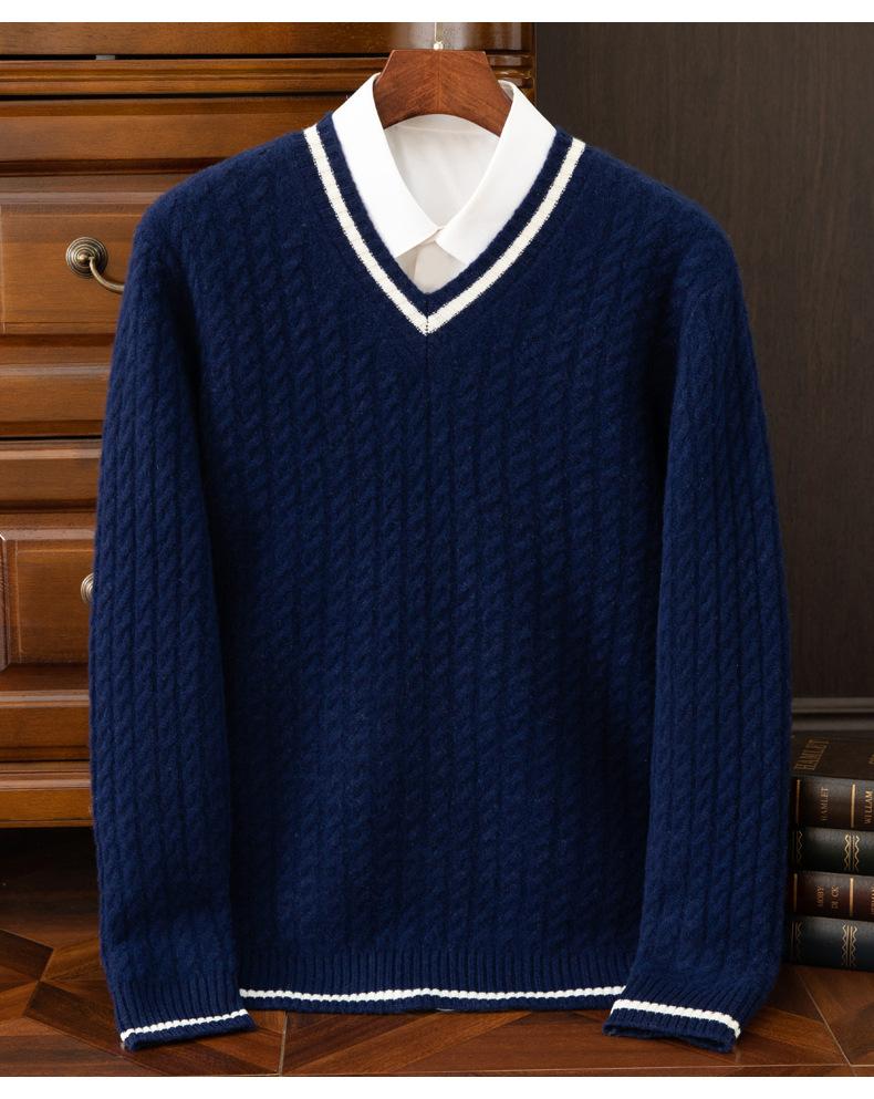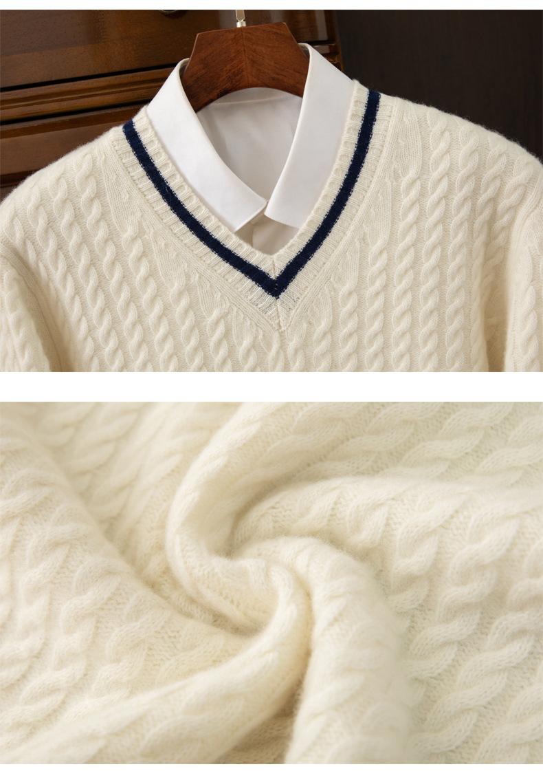 Otoño e Invierno Nuevo Tejido de Lana Pura Cuello en V Color Contraste Suéter Espesado Casual Negocios Flor Torcida Manga Larga Top Base