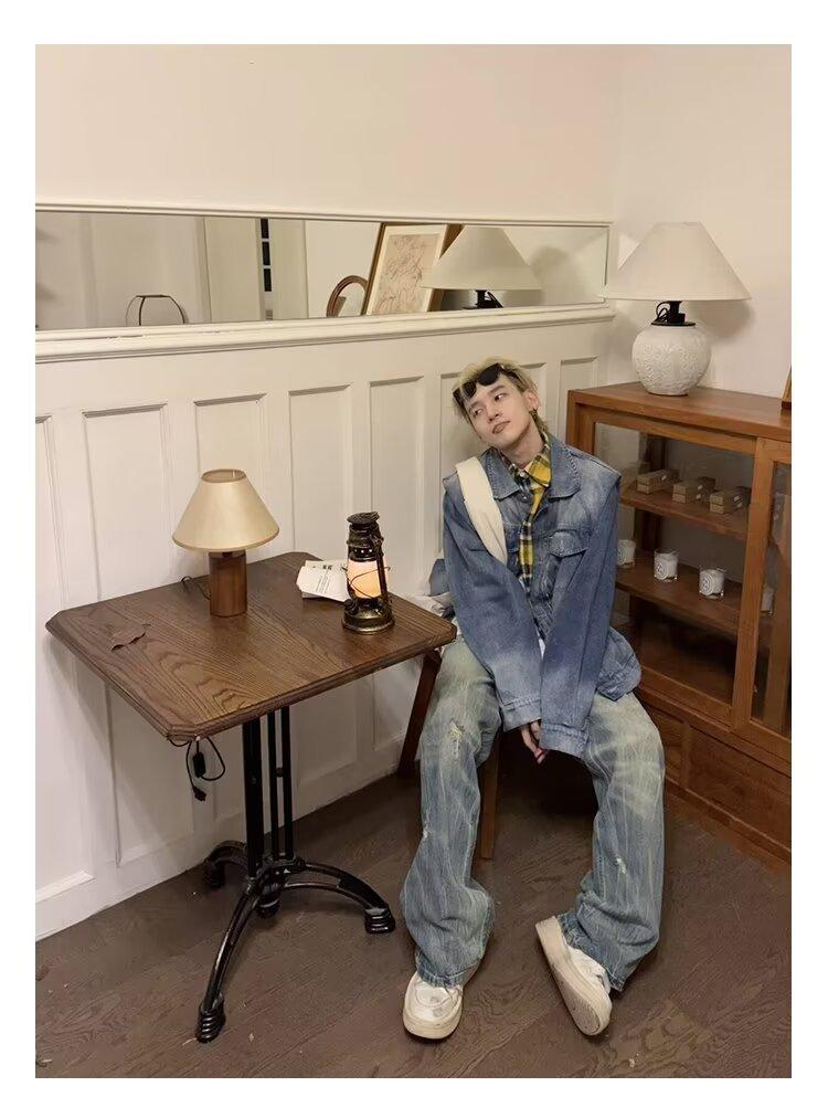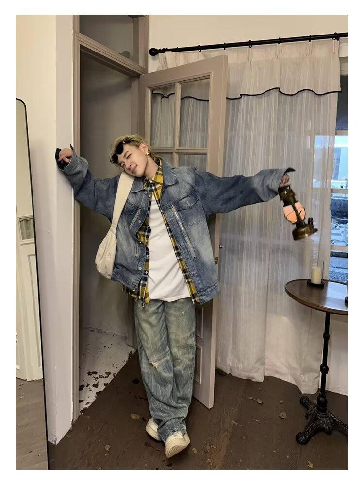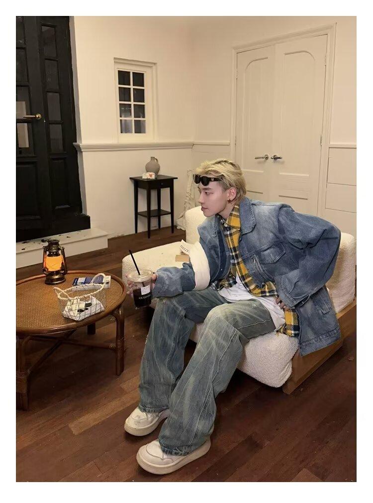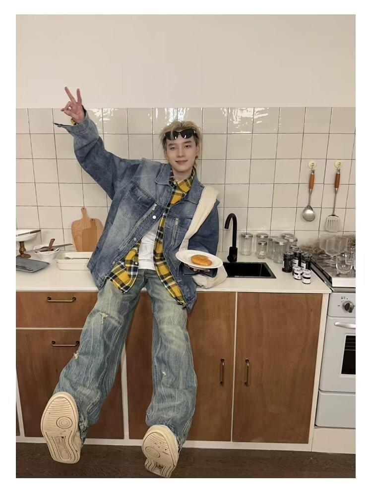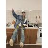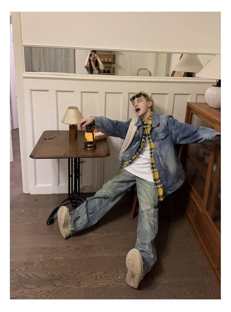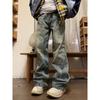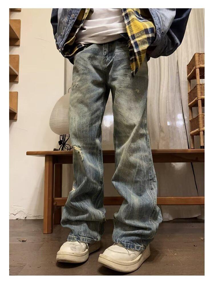 Pantalones vaqueros viejos lavados estilo americano retro holgados de pierna ancha y rectos