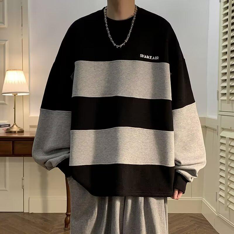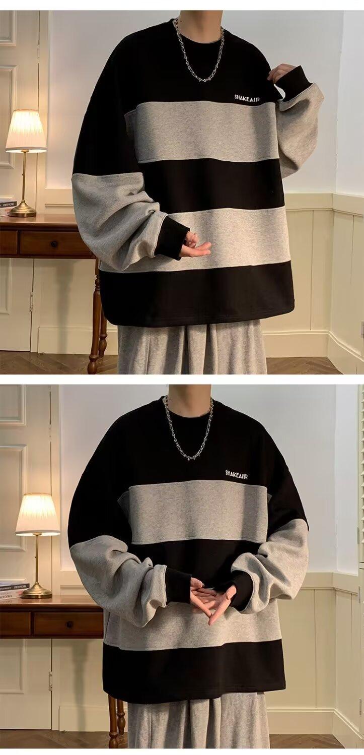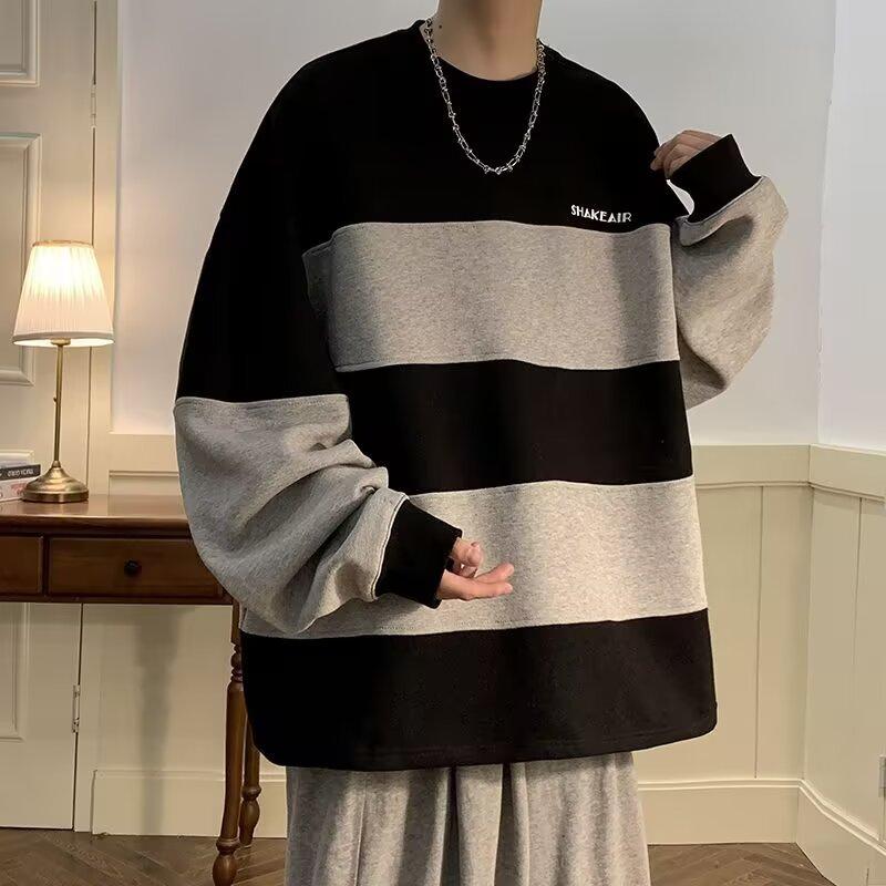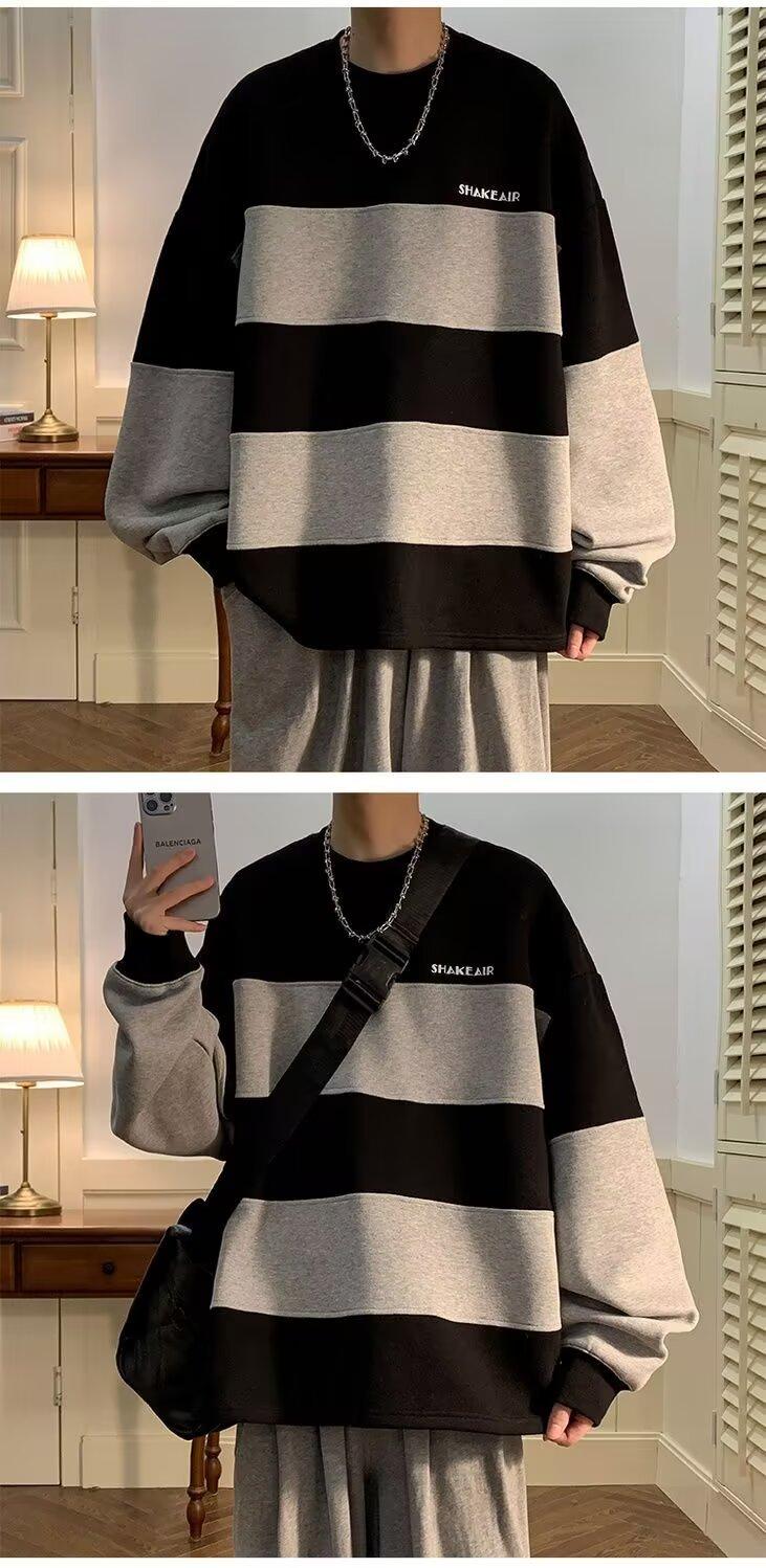 Sudadera de cuello redondo a rayas estilo coreano 2024, nueva sudadera de alta gama estilo americano, informal, de calle, de manga larga, con cuello redondo y costuras a rayas.