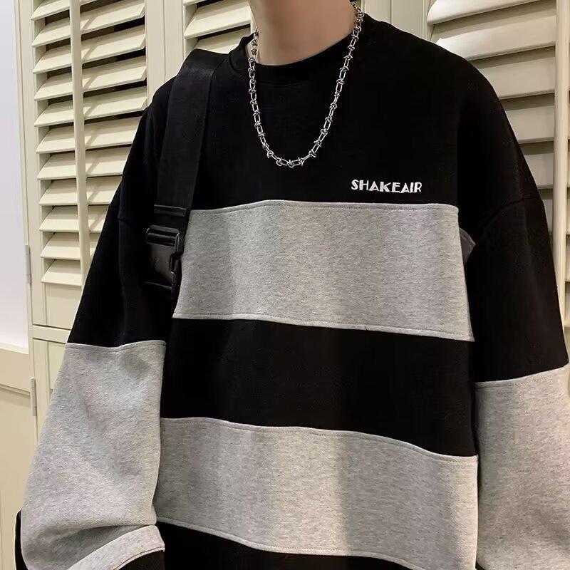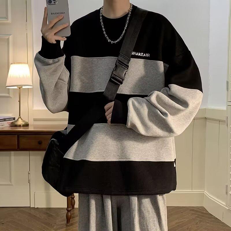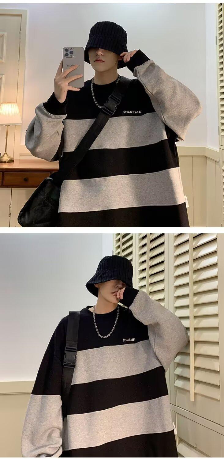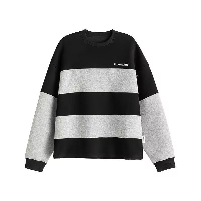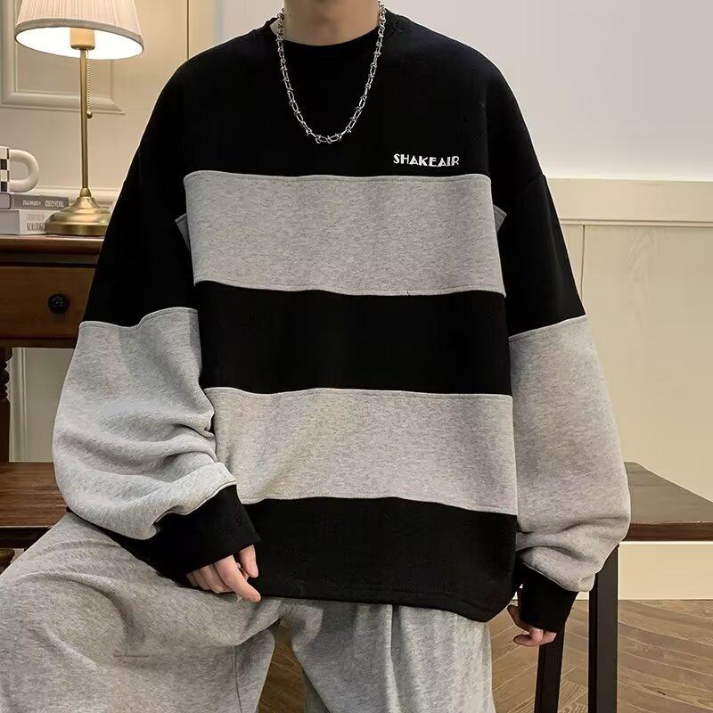 Sudadera de cuello redondo a rayas estilo coreano 2024, nueva sudadera de alta gama estilo americano, informal, de calle, de manga larga, con cuello redondo y costuras a rayas.