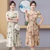 Vestido elegante con bloques de color para madres de mediana edad y ancianas, novedad de verano 2024, falda de cintura media con mangas cortas y estampado floral.