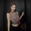 Camiseta vintage de manga corta a cuadros con cuello alto para mujer, diseño de verano, estilo nicho, sin espalda, con hombros descubiertos