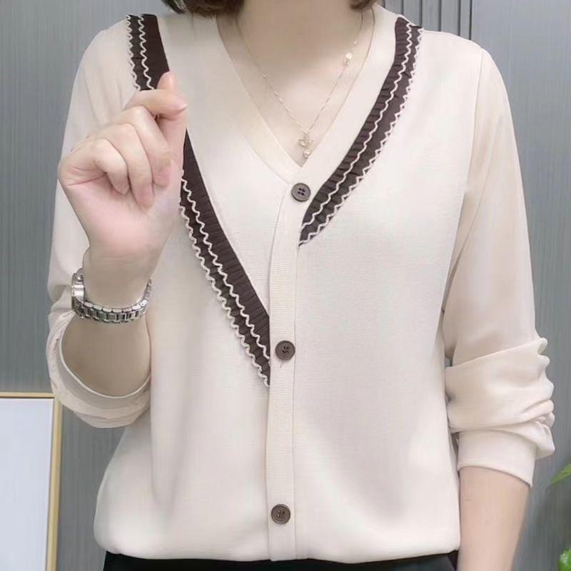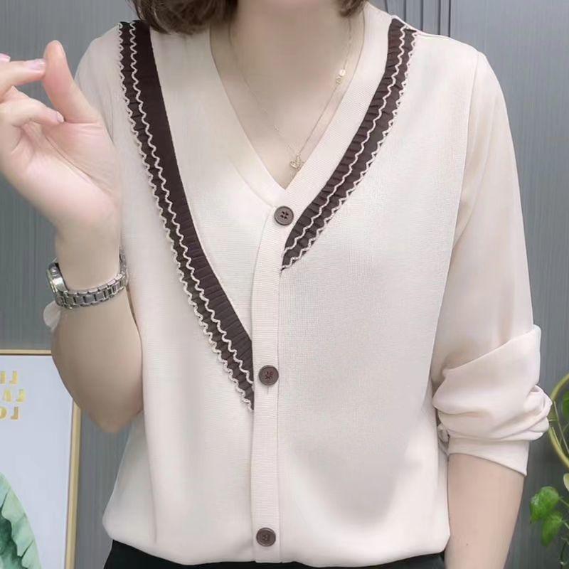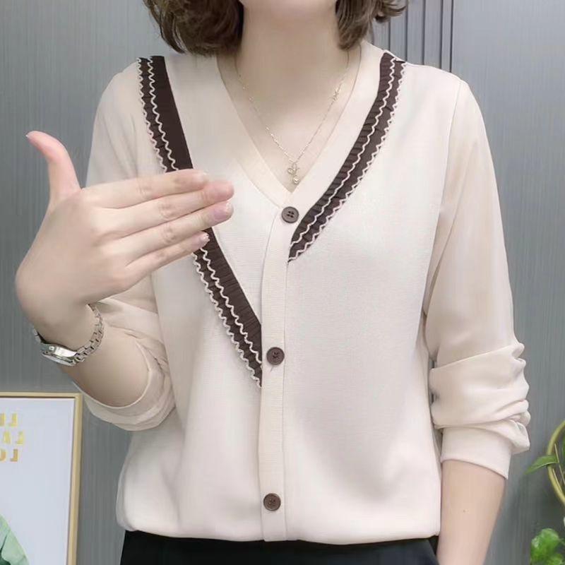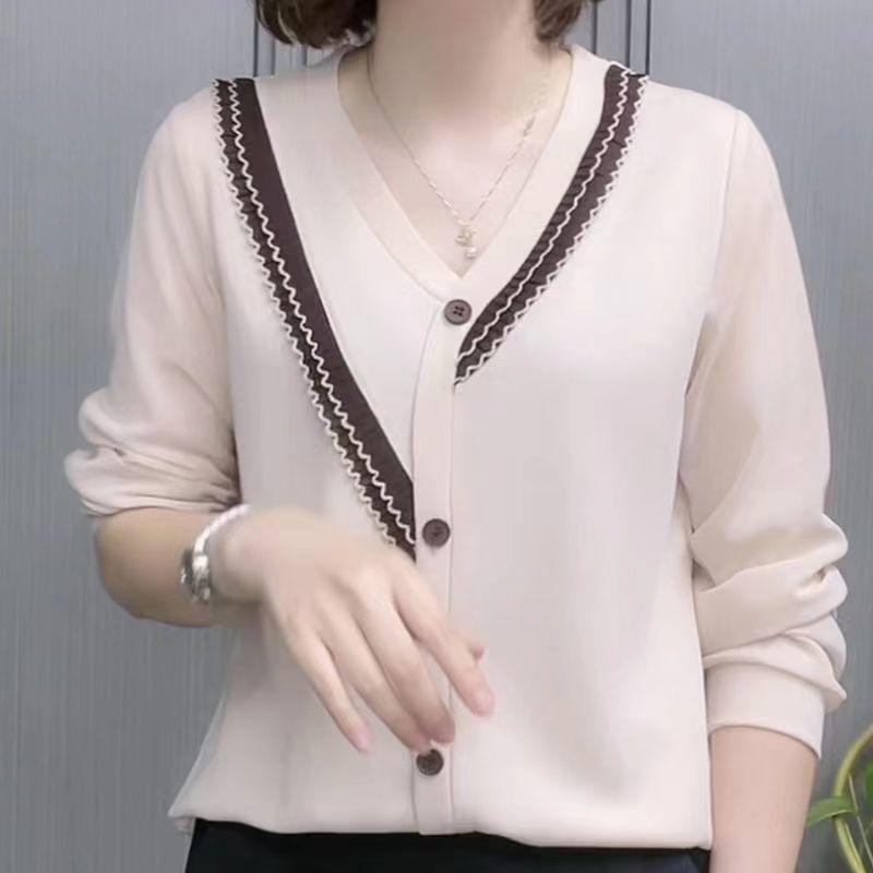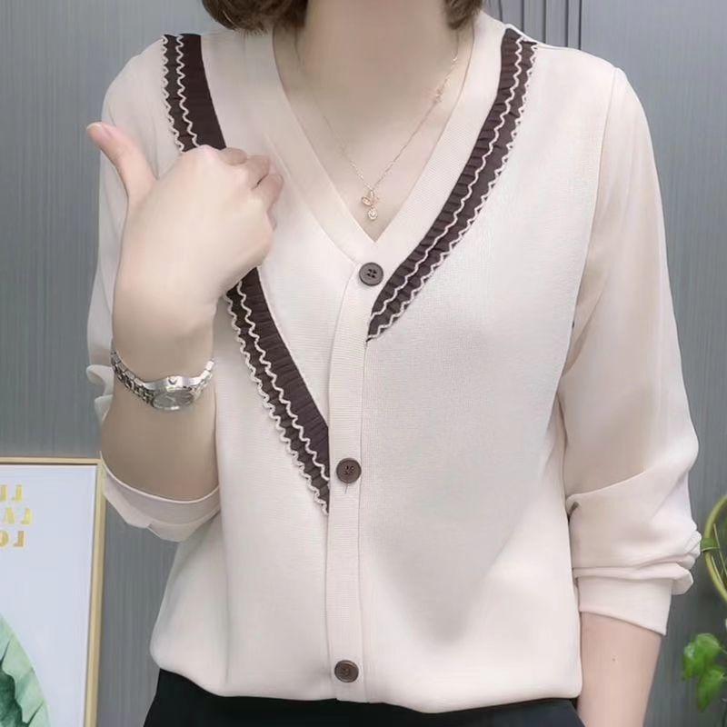 Camiseta de gasa estilo occidental, elegante, de primavera, con cuello en V, holgada y combinable para mujer