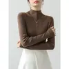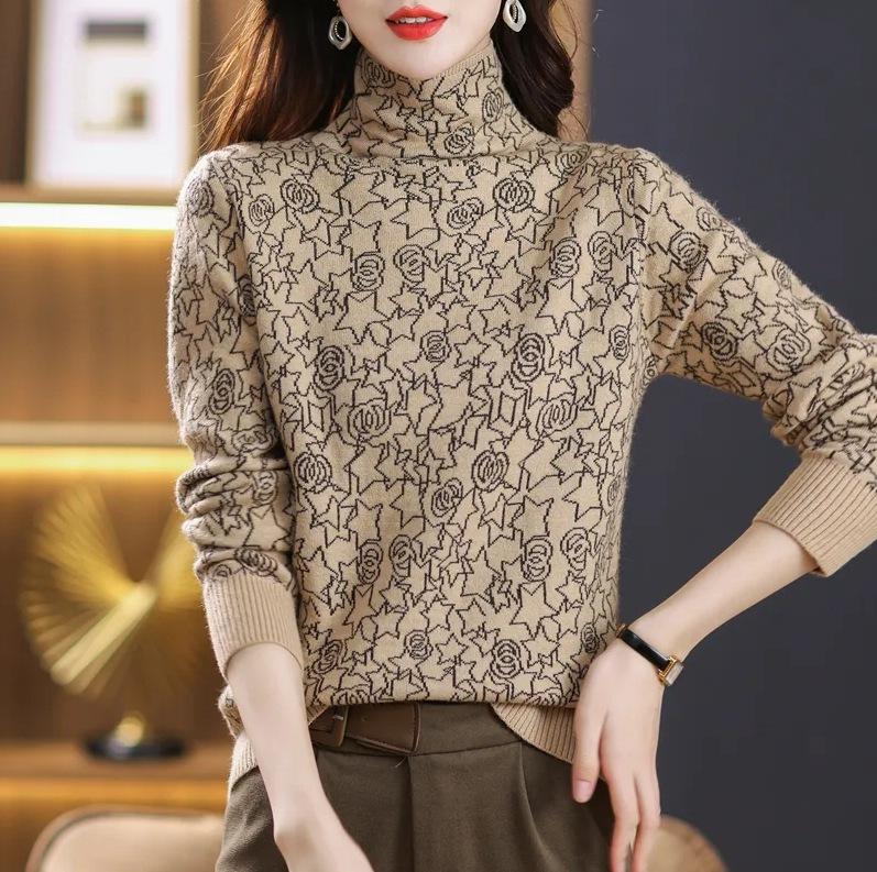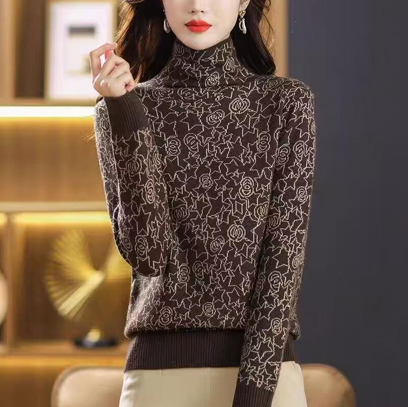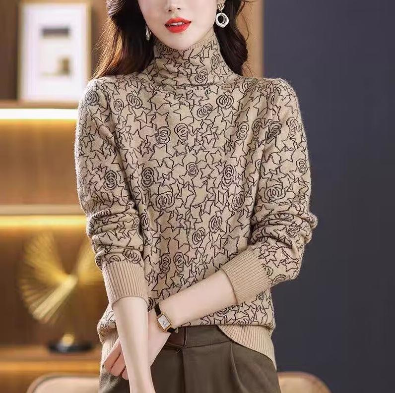Suéter Capa Base para Mujer, Estilo Nuevo Otoño e Invierno 2023, Elegante Tejido Jacquard, Corte Holgado, Cuello Alto, Top de Manga Larga
