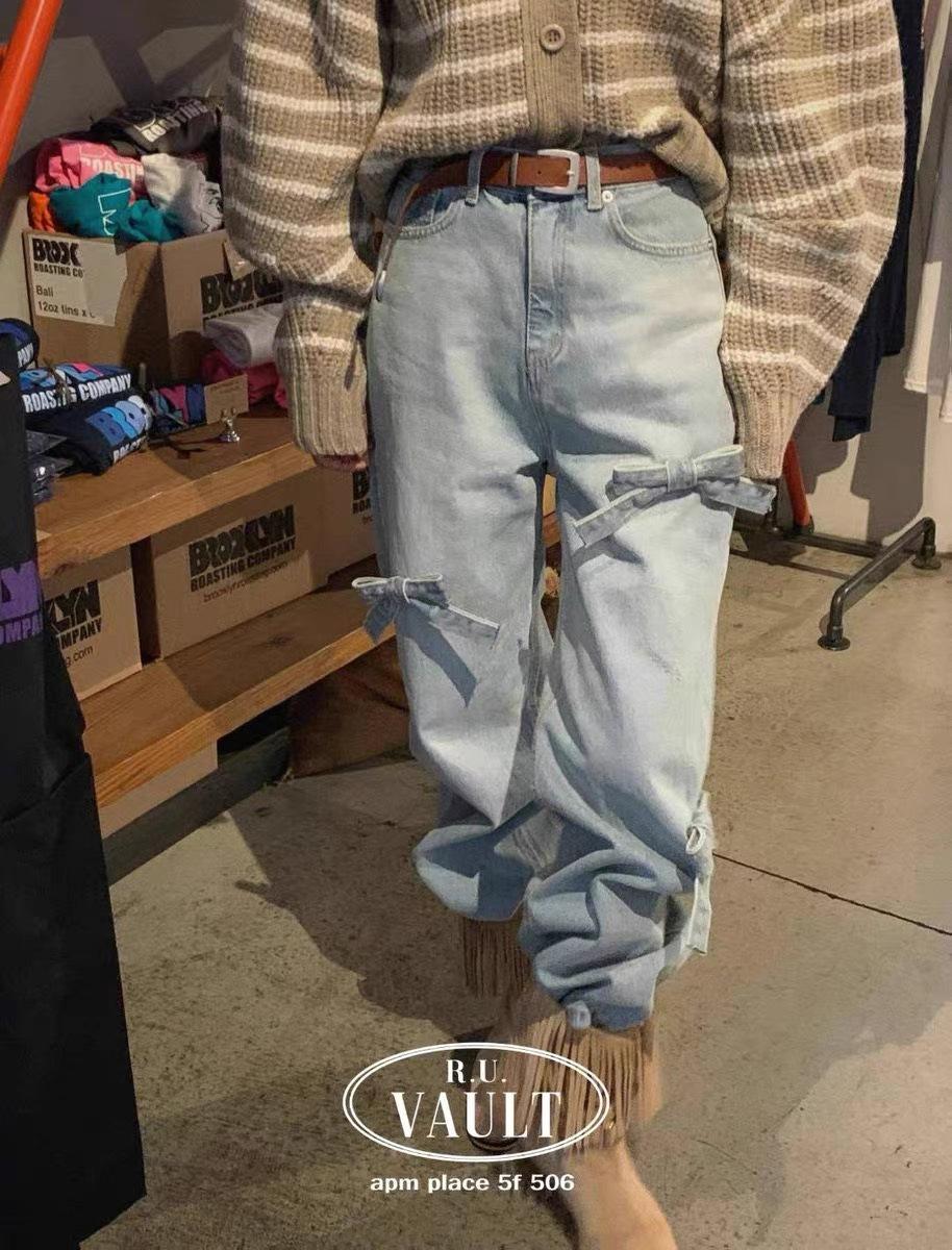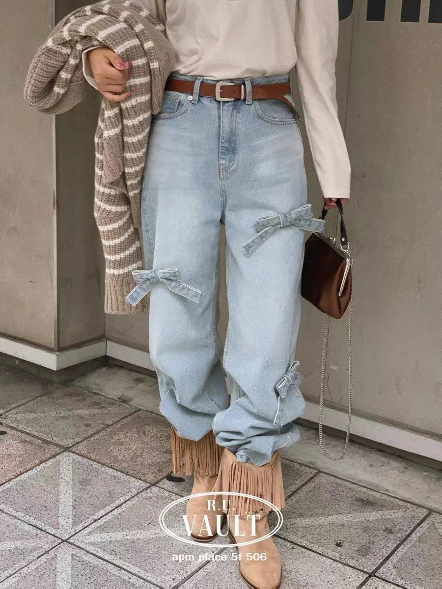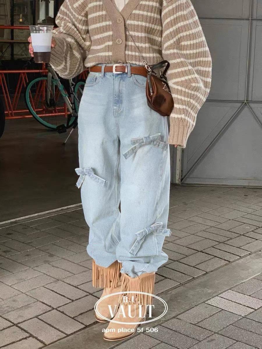 Ropa de mujer de Corea del Sur Dongdaemun otoño e invierno jeans casuales rectos de alta calidad retro desgastados con lazo