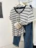 Camiseta de manga corta a rayas con escote en V y hombros descubiertos para mujer, verano 2024, nuevo diseño, camiseta holgada Sense Niche para personas pequeñas.