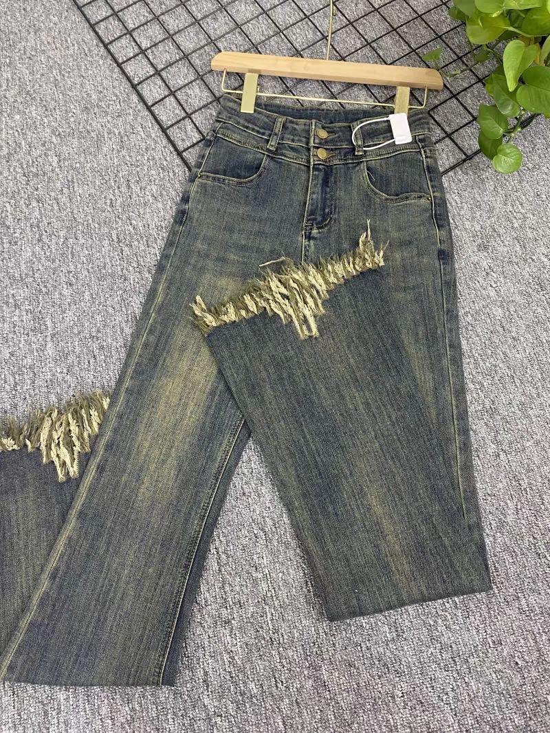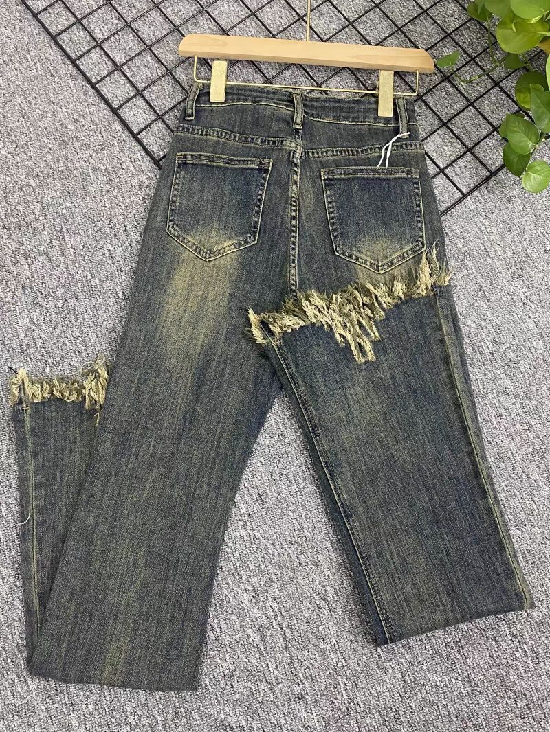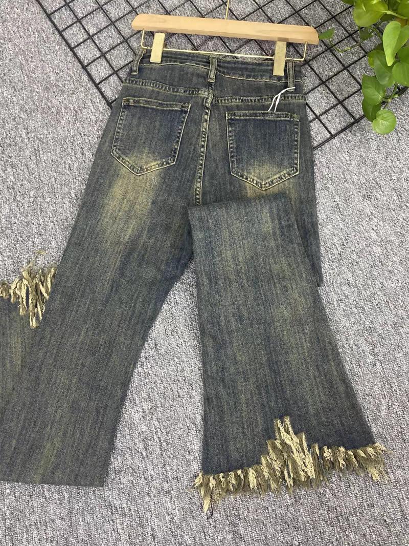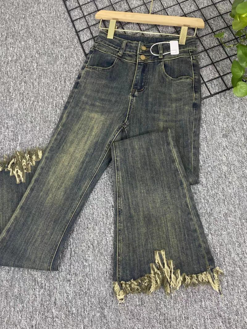 Pantalones vaqueros informales con microacampanados y bordes rugosos para mujer, otoño e invierno 2024, elásticos, de cintura alta, holgados, adelgazantes, con diseño de herradura.