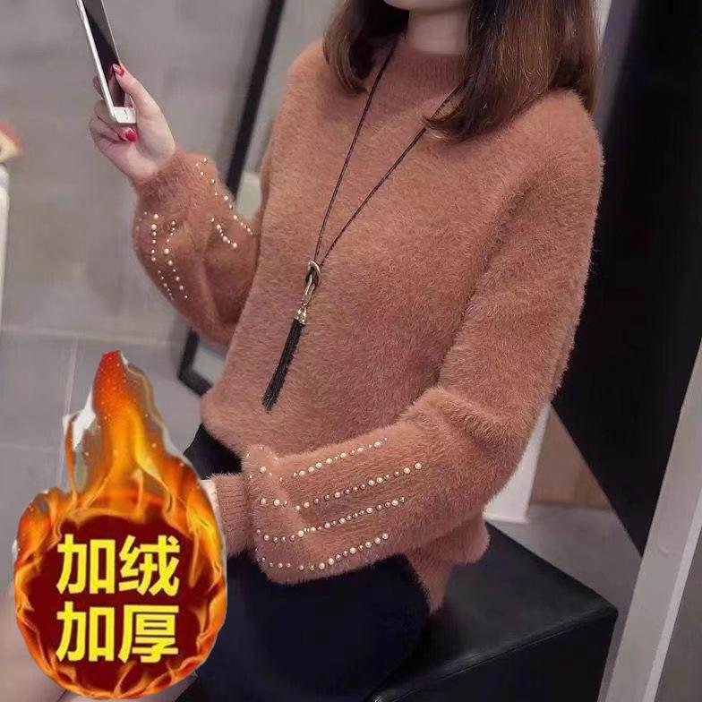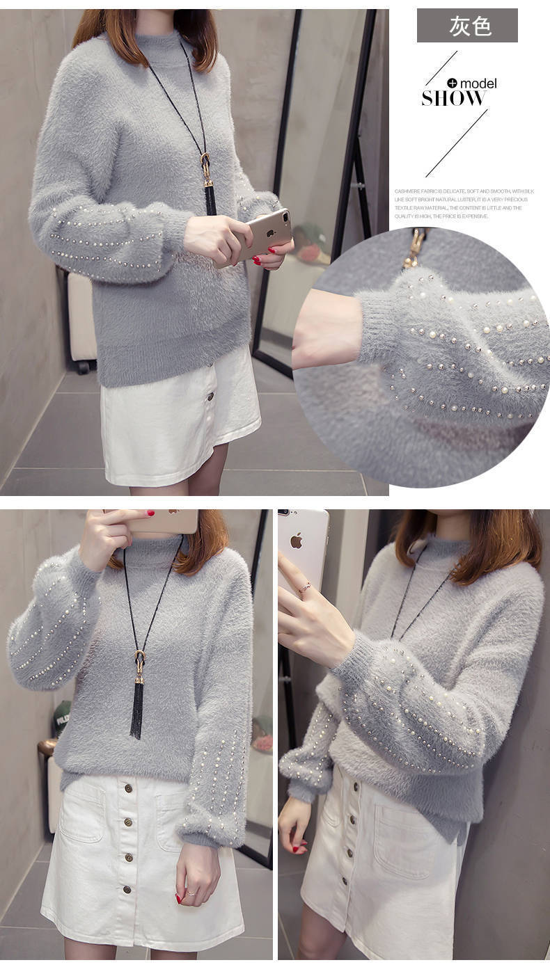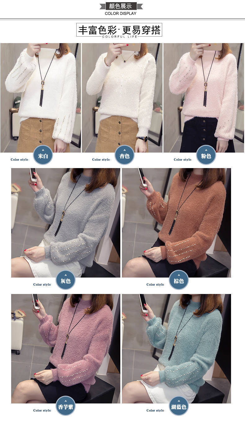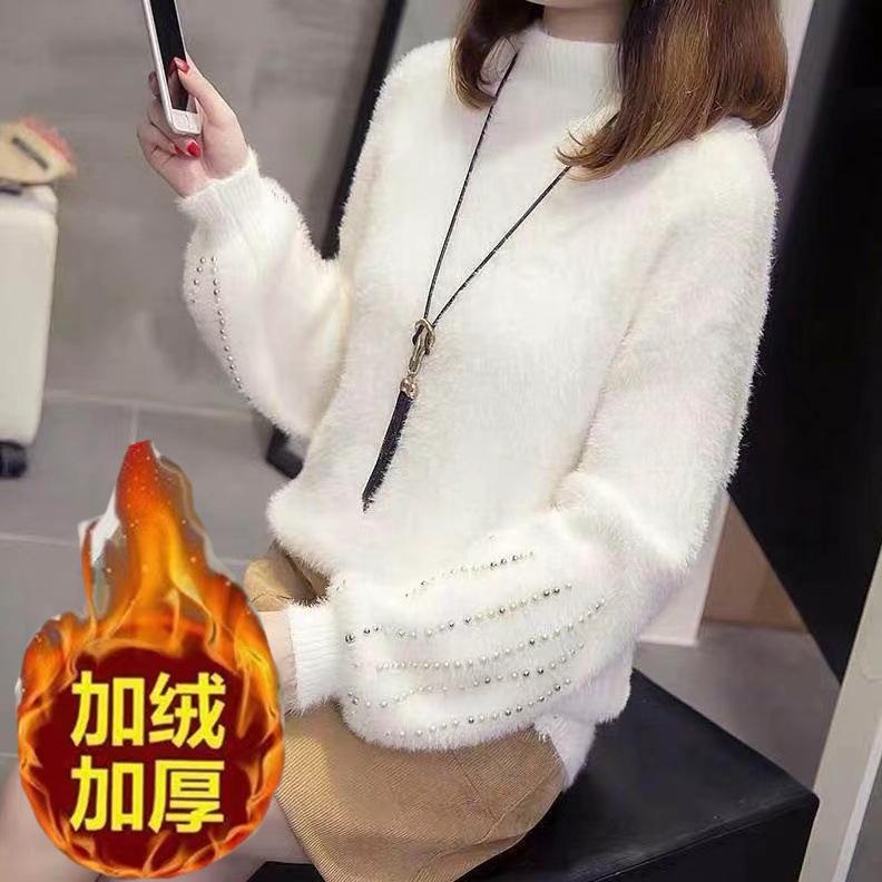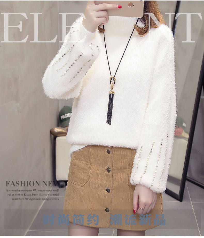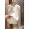 Suéter de Otoño e Invierno de Terciopelo de Visón Imitación Blanco para Mujer Estilo Coreano Holgado Manga Farol Color Base Camisa Suéter Grueso con Cuentas