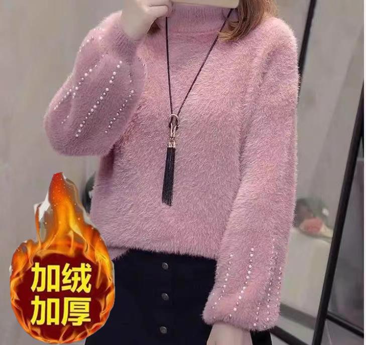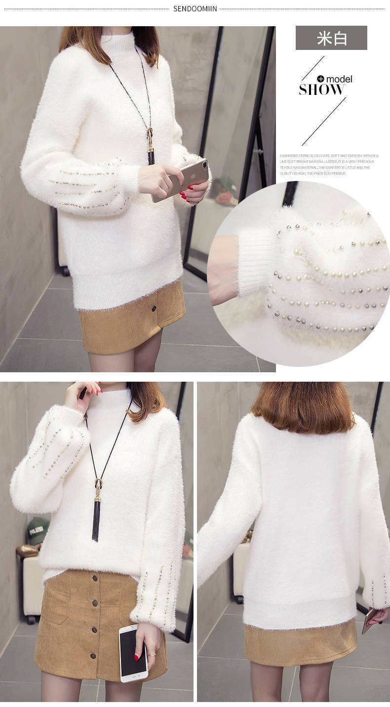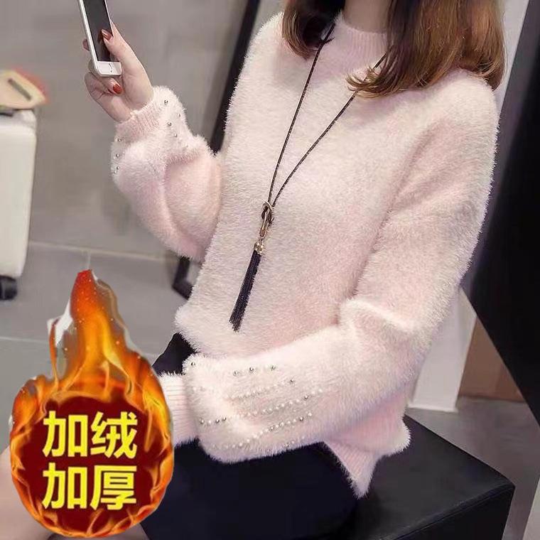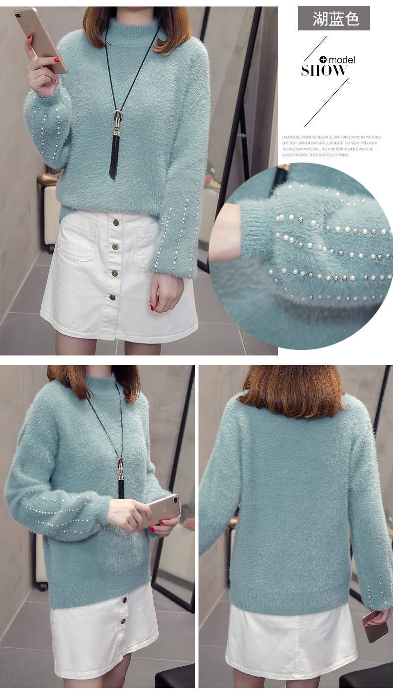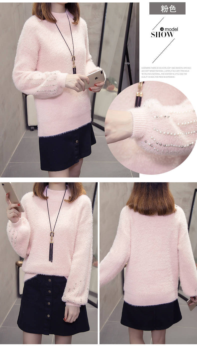 Suéter de Otoño e Invierno de Terciopelo de Visón Imitación Blanco para Mujer Estilo Coreano Holgado Manga Farol Color Base Camisa Suéter Grueso con Cuentas