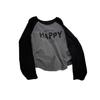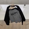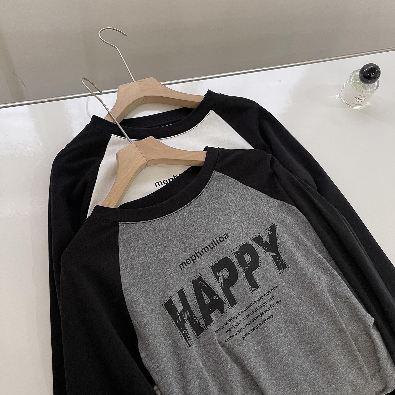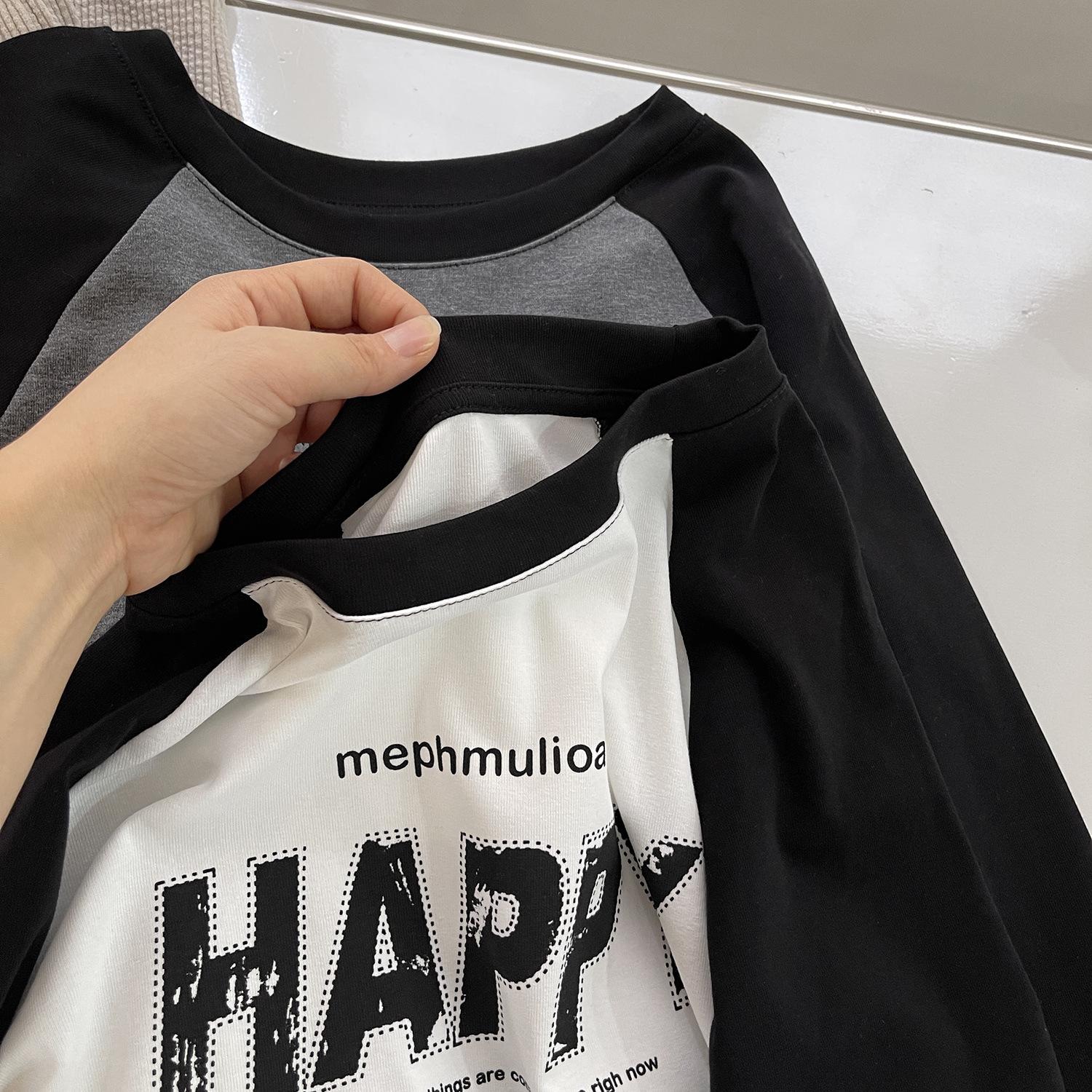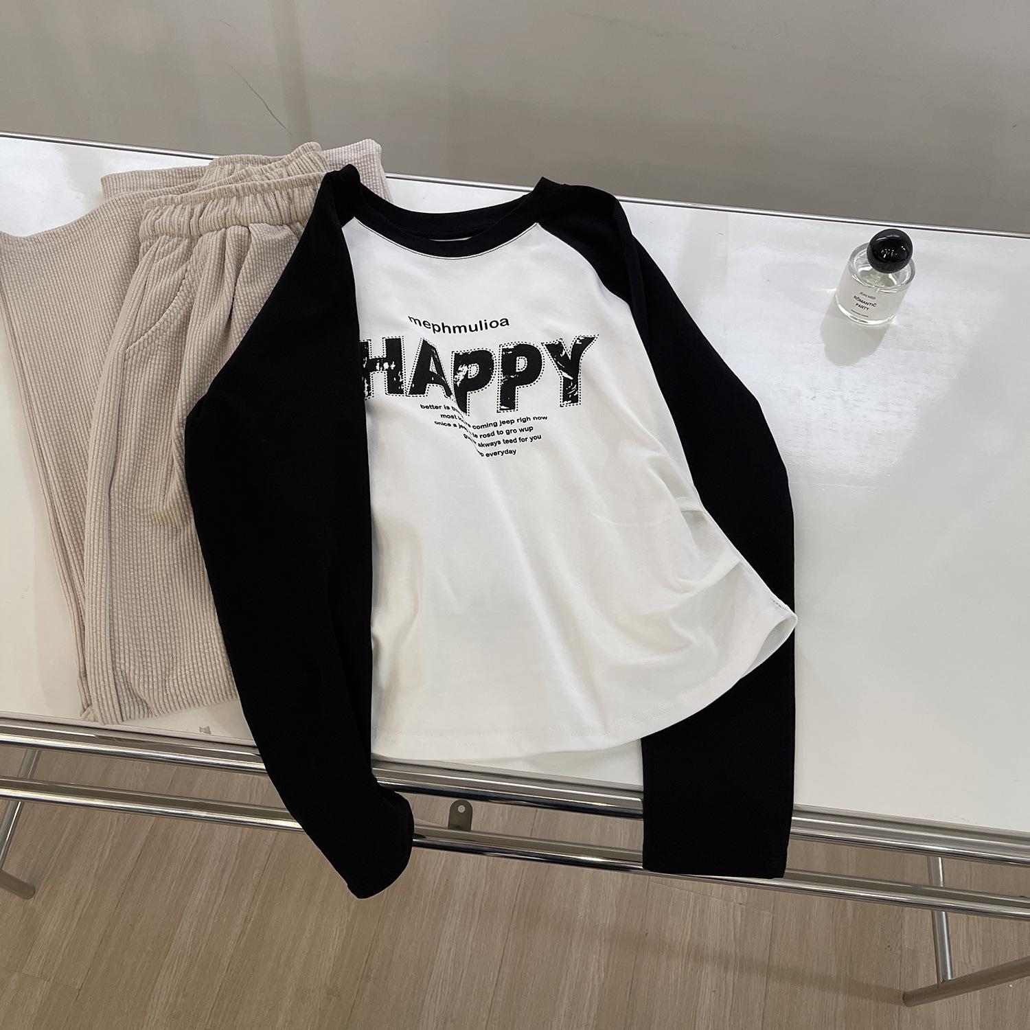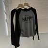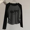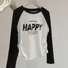 Camiseta corta de manga larga estilo coreano con cintura ajustada, plisada, en contraste, mangas raglán, estampada con letras, para mujer, corte entallado, adelgazante, básica, otoño