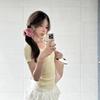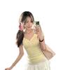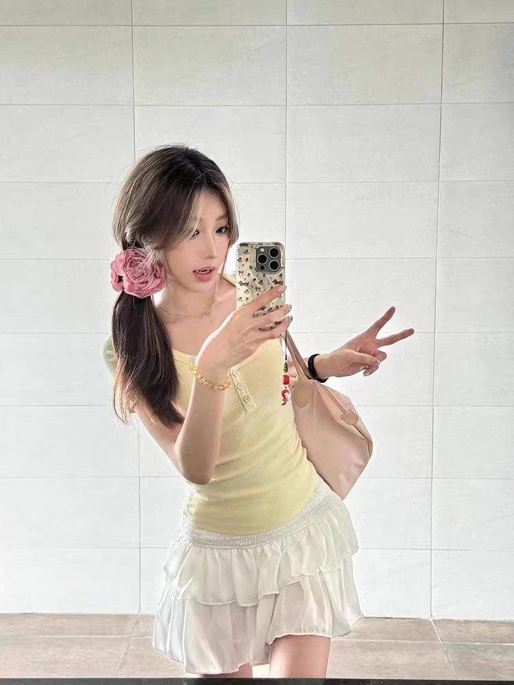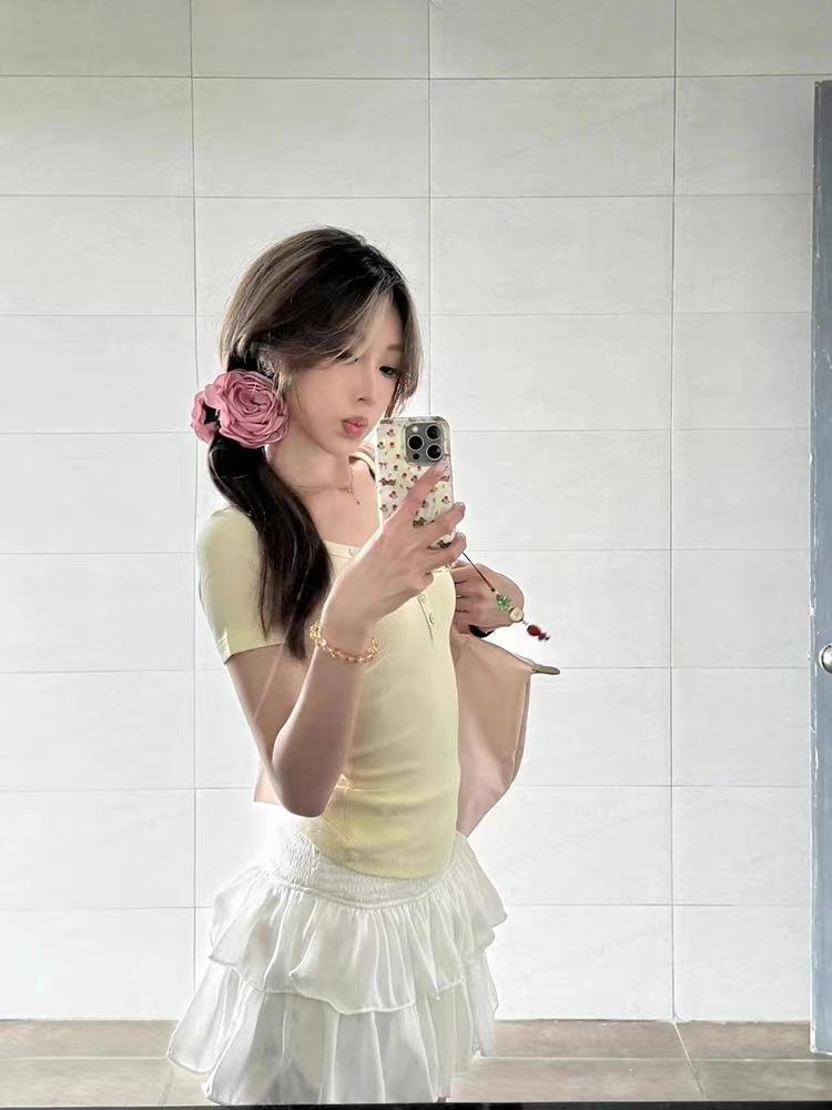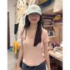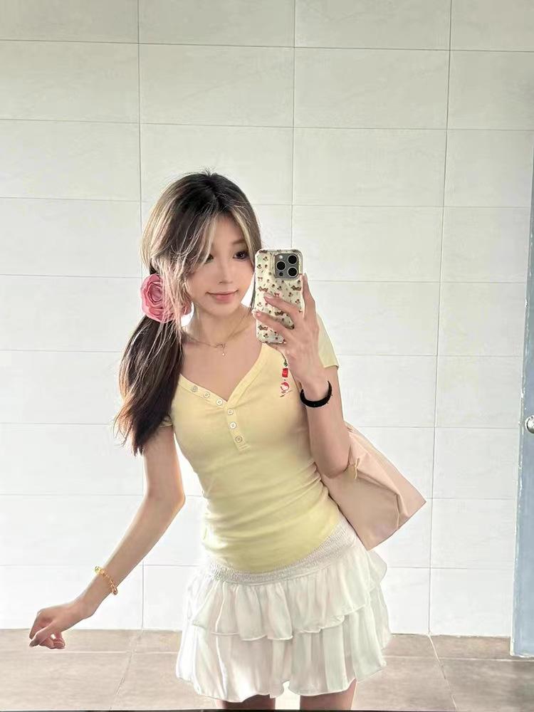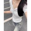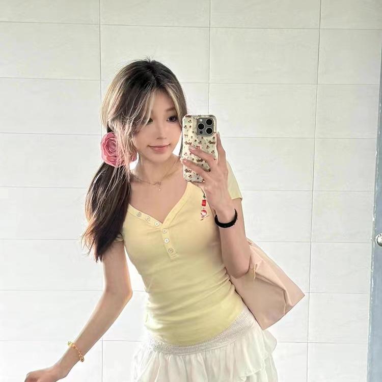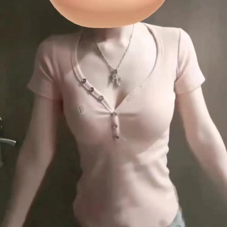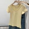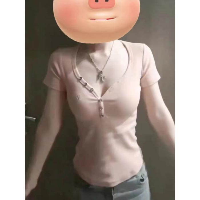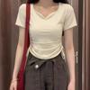 Camiseta de manga corta con escote en V y hombros descubiertos estilo americano para mujer, estilo elegante y moderno, estilo dulce y sexy. Nueva tendencia de moda.