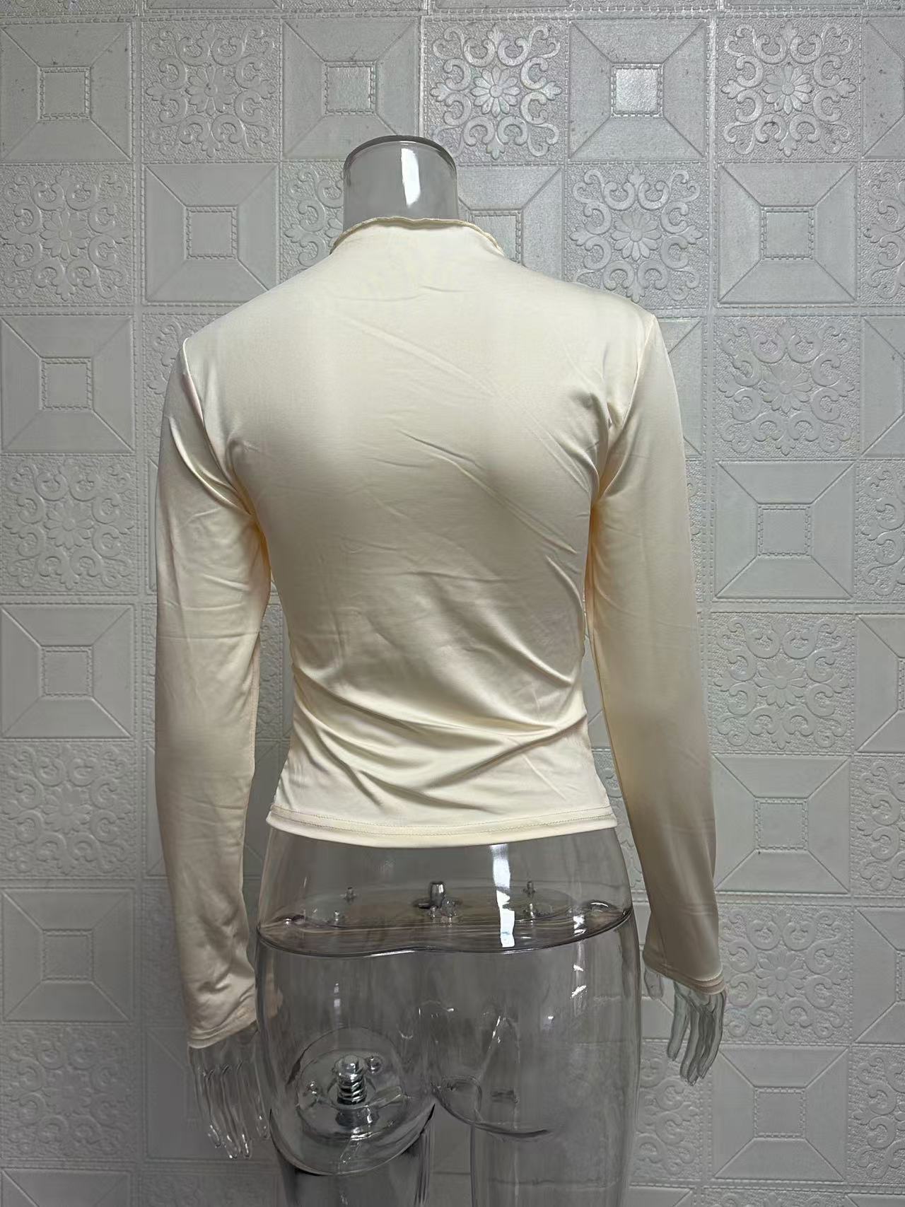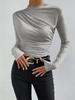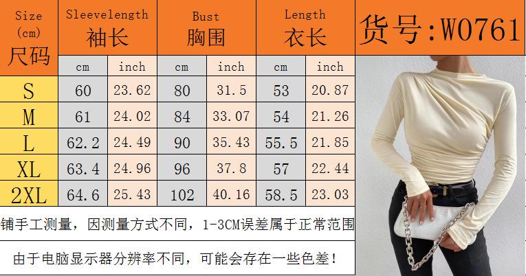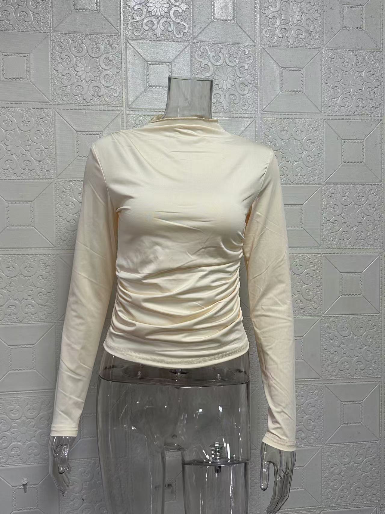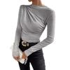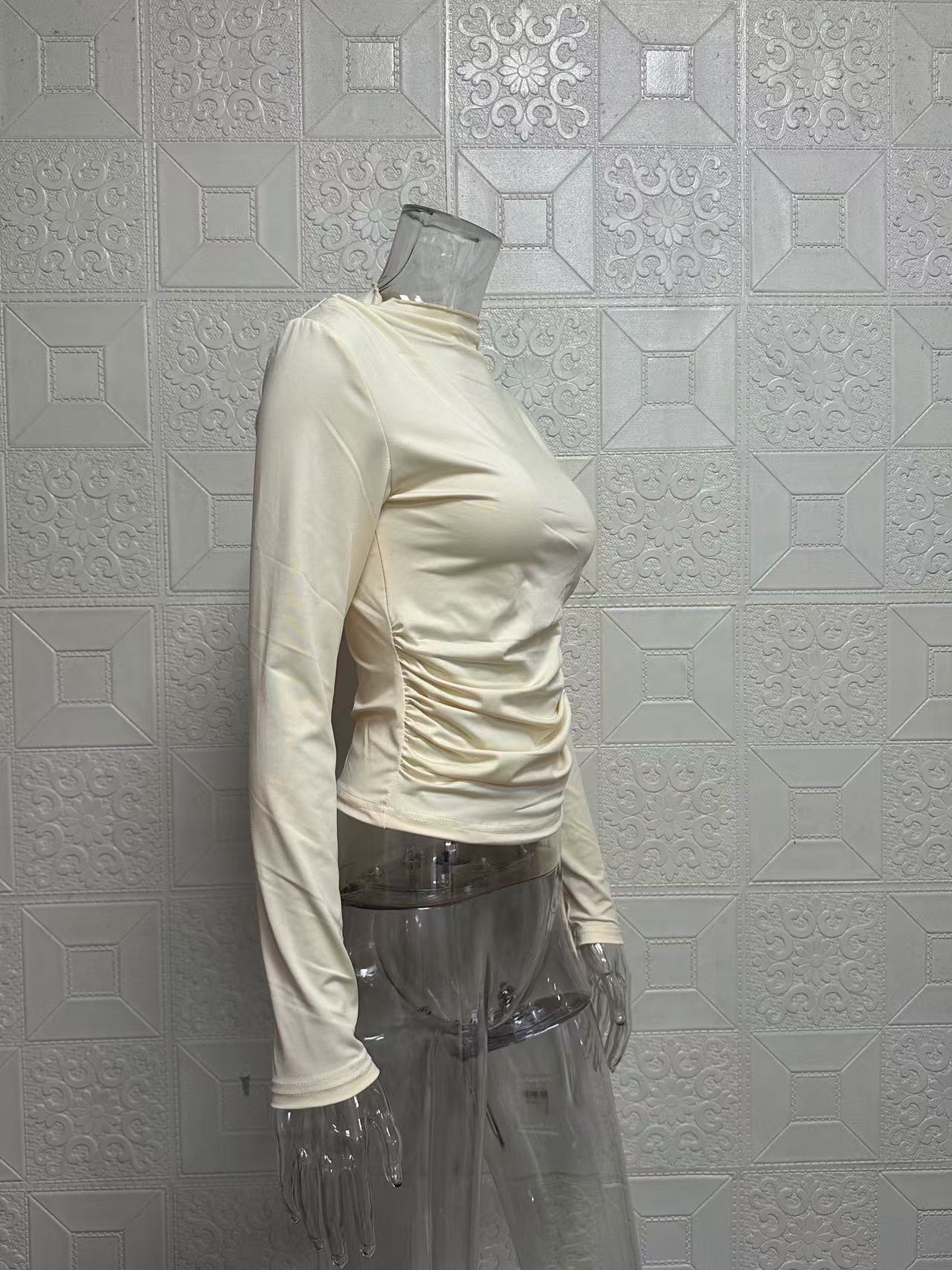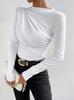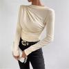 Verano 2025 Transfronterizo Europeo y Americano Color Puro Cuello Redondo Ajustado Camiseta Básica Versátil Diseño Plisado Top de Manga Larga para Mujer