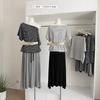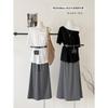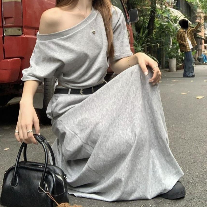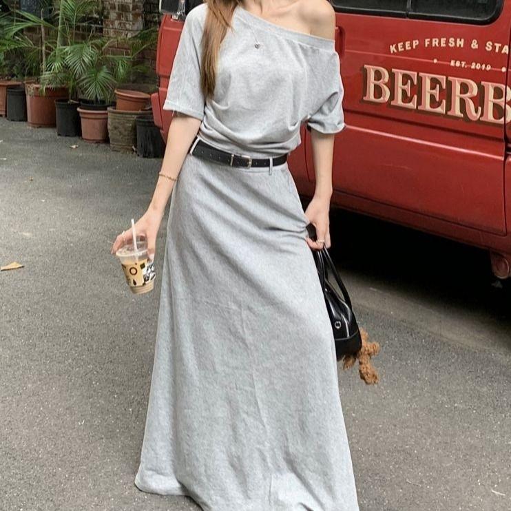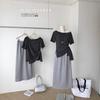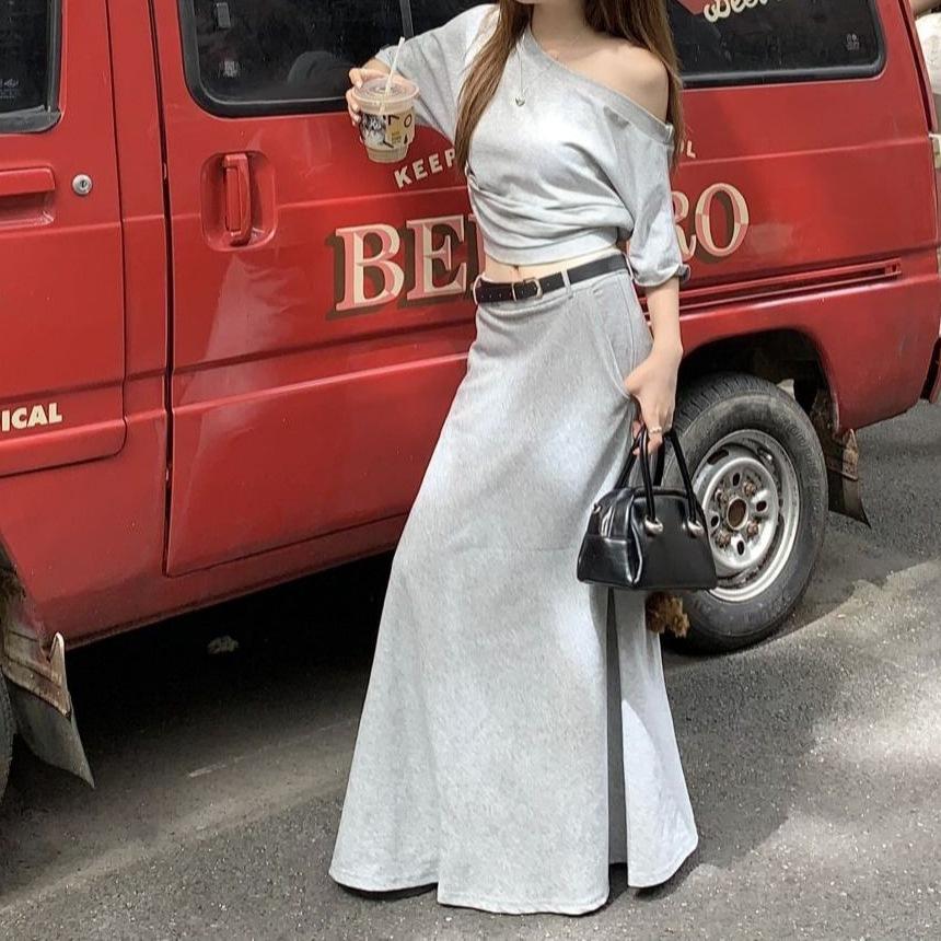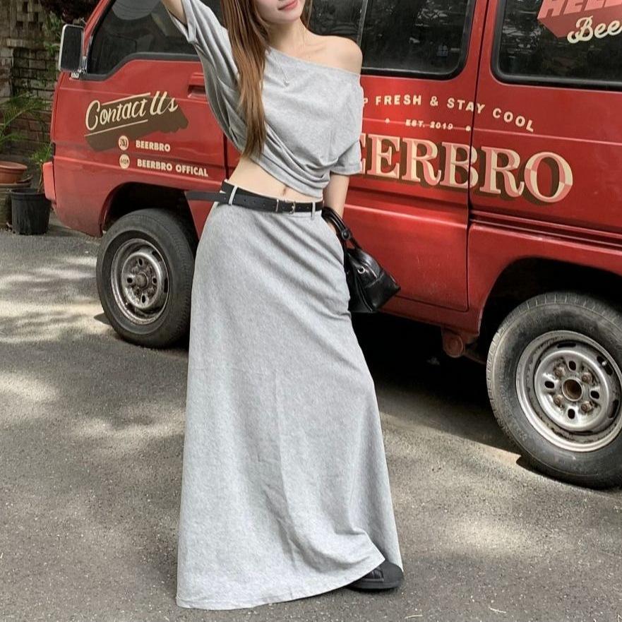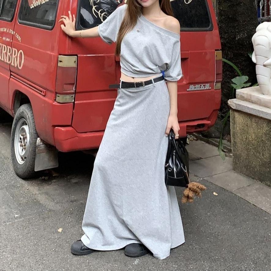 Traje Casual de Verano para Mujer Camiseta Gris de Hombro Inclinado Corta 2025 Falda Drapeada Coreana de Cintura Alta Conjunto de Dos Piezas