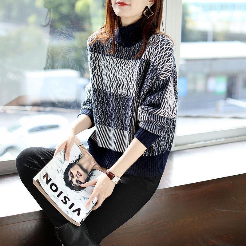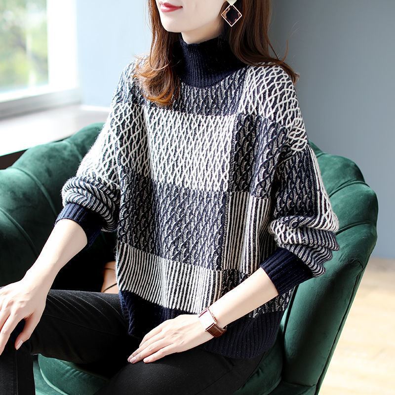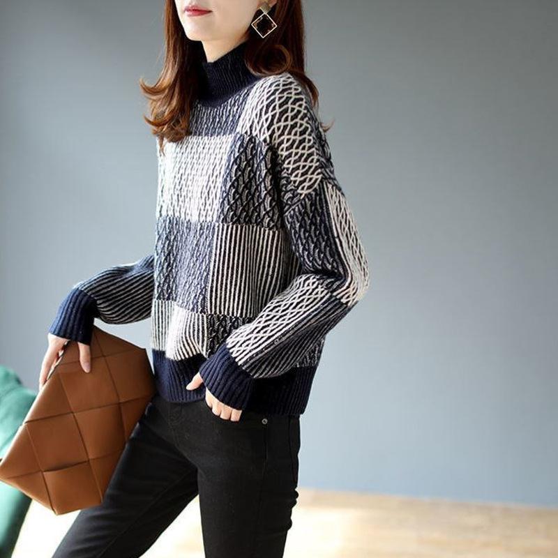 Suéter holgado y elegante a cuadros de estilo coreano para mujer, suéter ajustado de otoño e invierno, suéter informal de cuello semialto para mujer