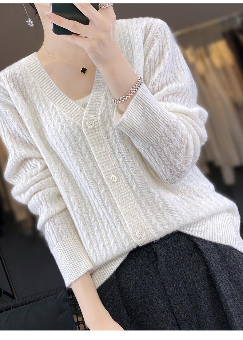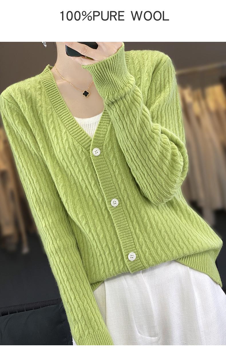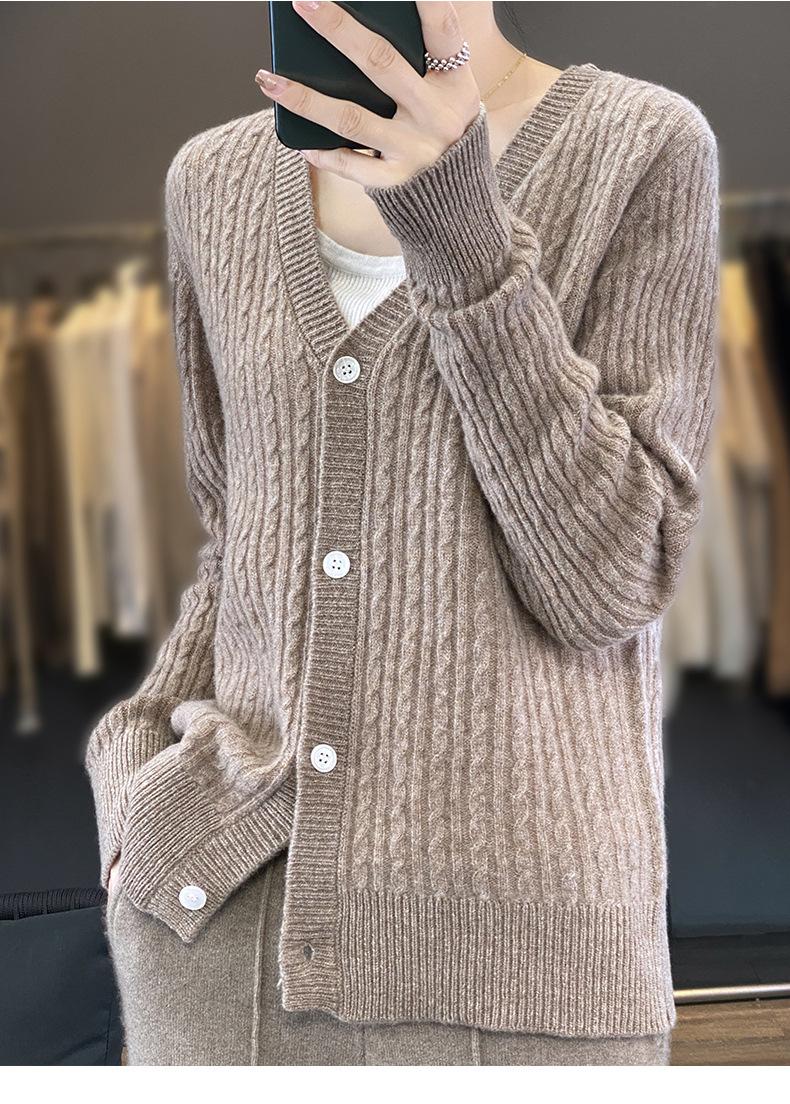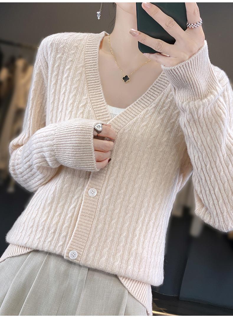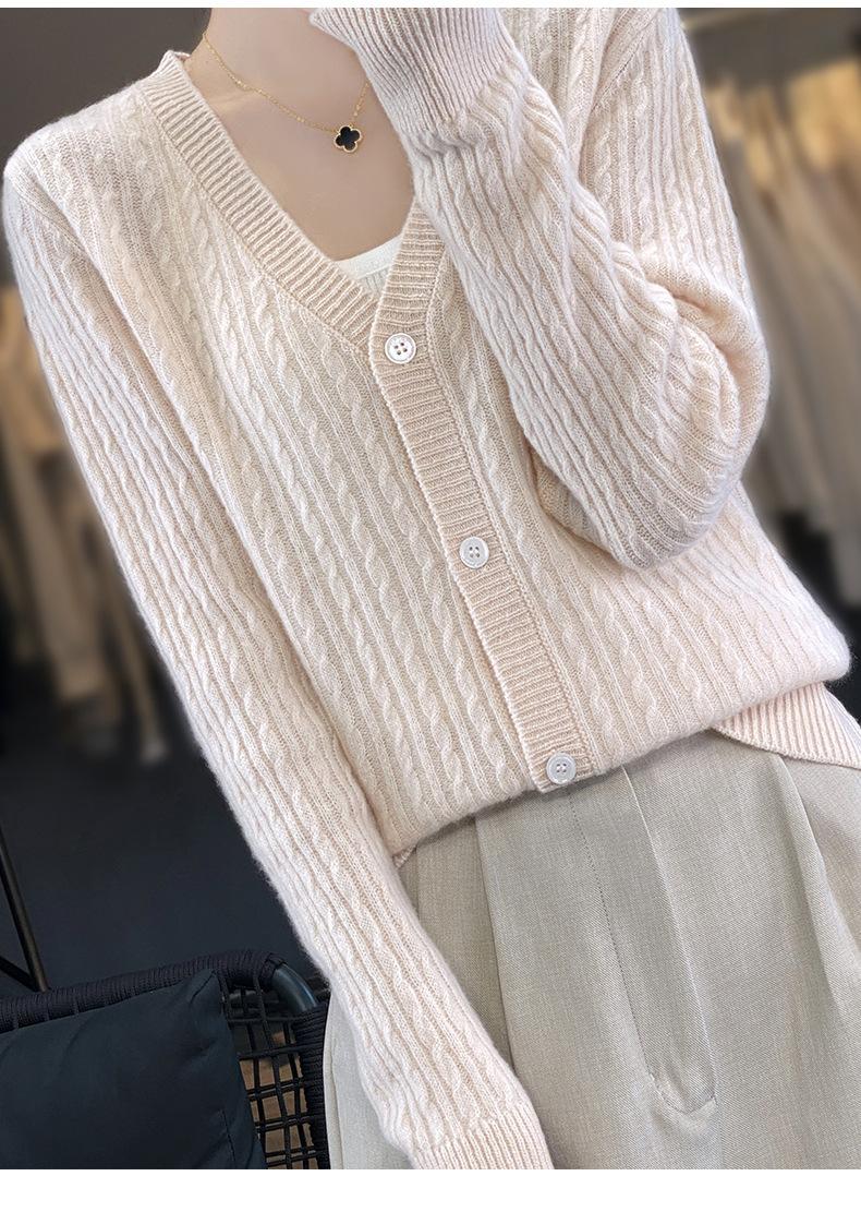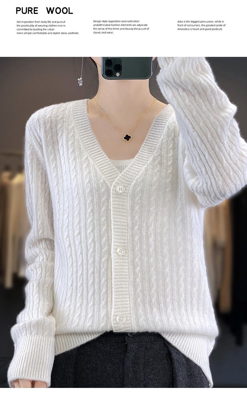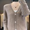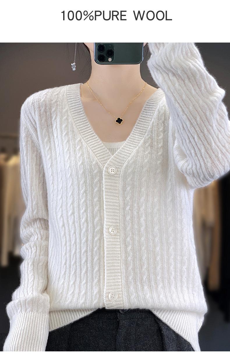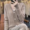 Otoño Nuevo Cárdigan de Flores Trenzadas para Mujer Cuello en V Elegante Color Sólido Combinable Suelto Tejido de Lana Pura Suéter Chaqueta