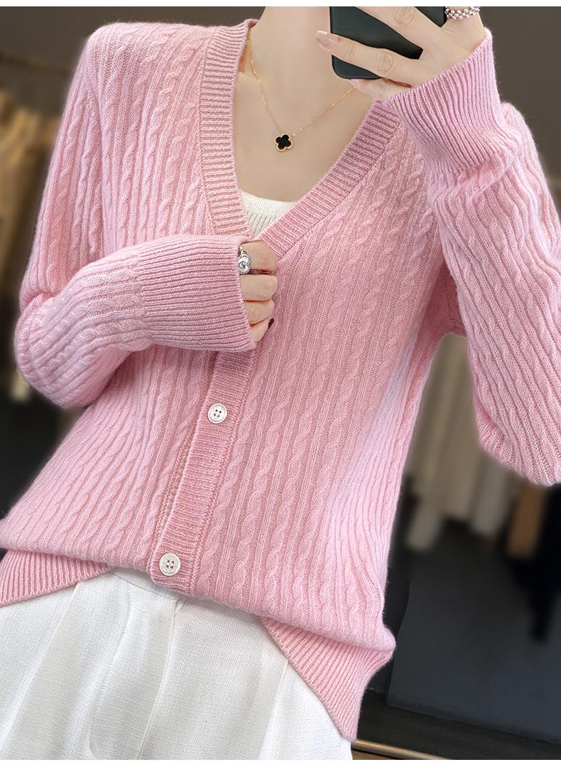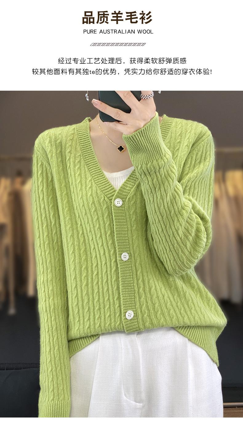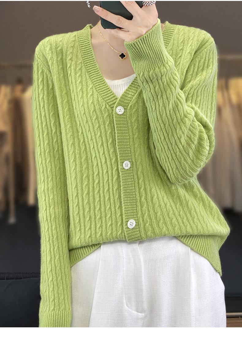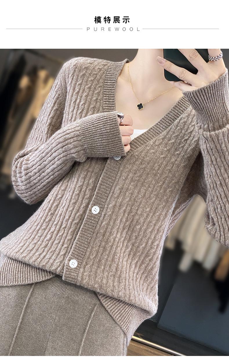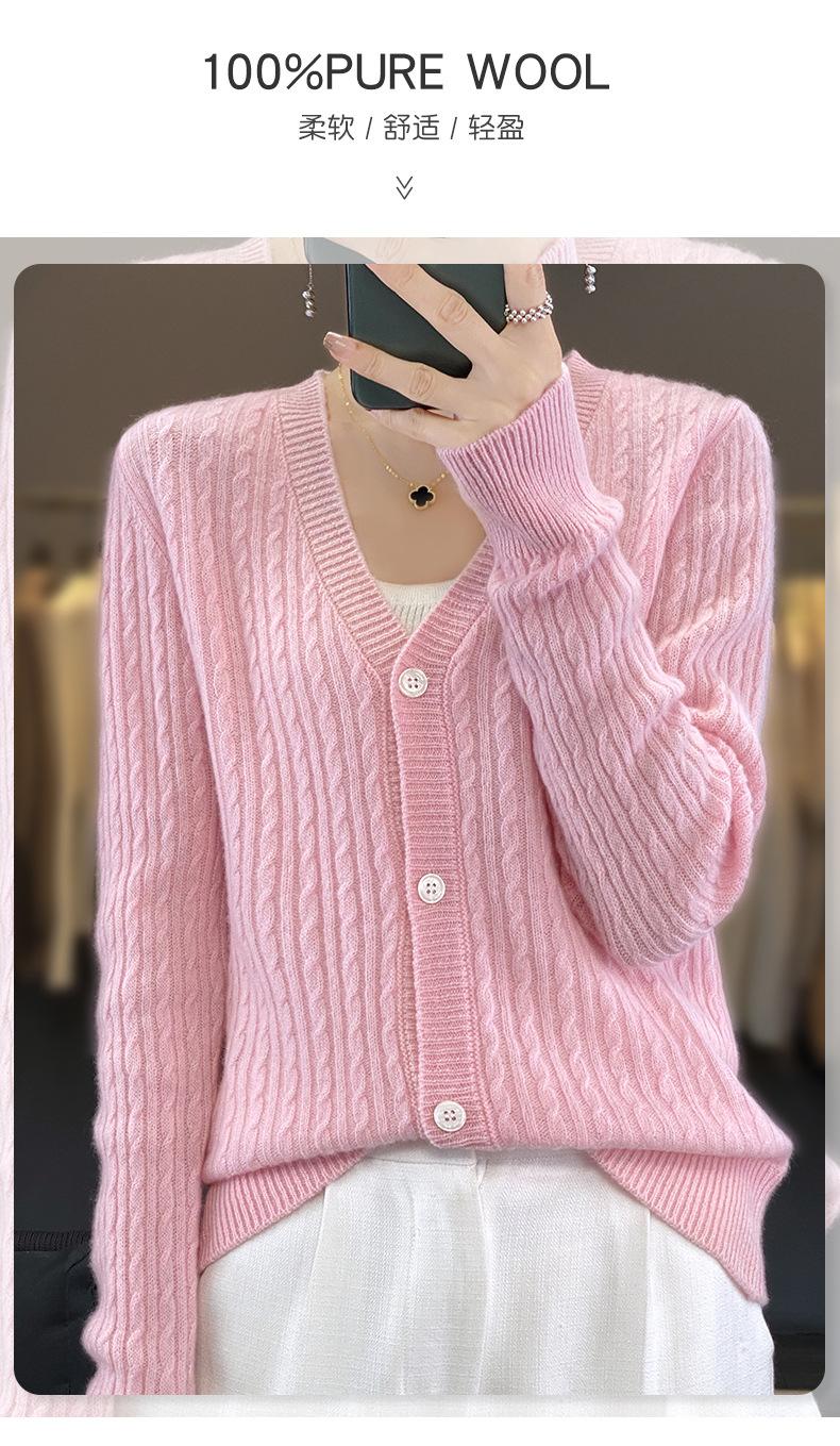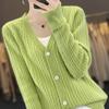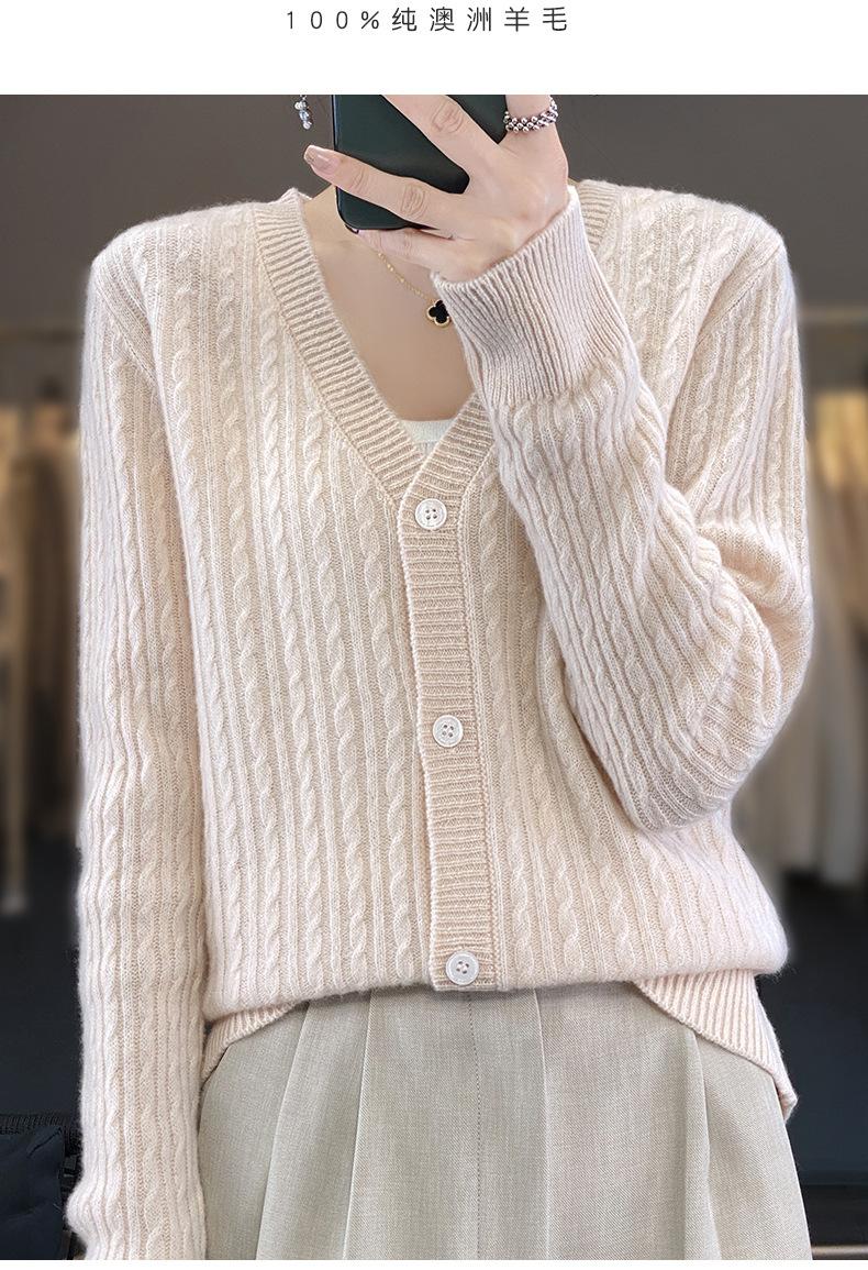 Otoño Nuevo Cárdigan de Flores Trenzadas para Mujer Cuello en V Elegante Color Sólido Combinable Suelto Tejido de Lana Pura Suéter Chaqueta
