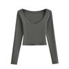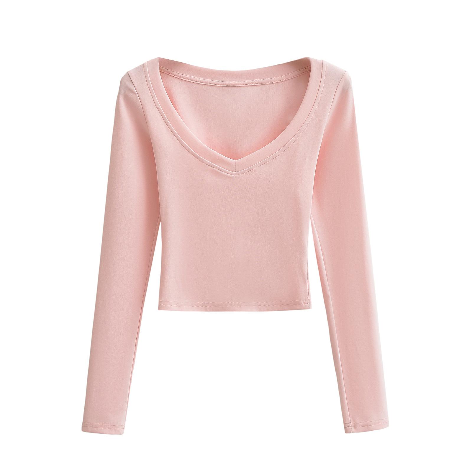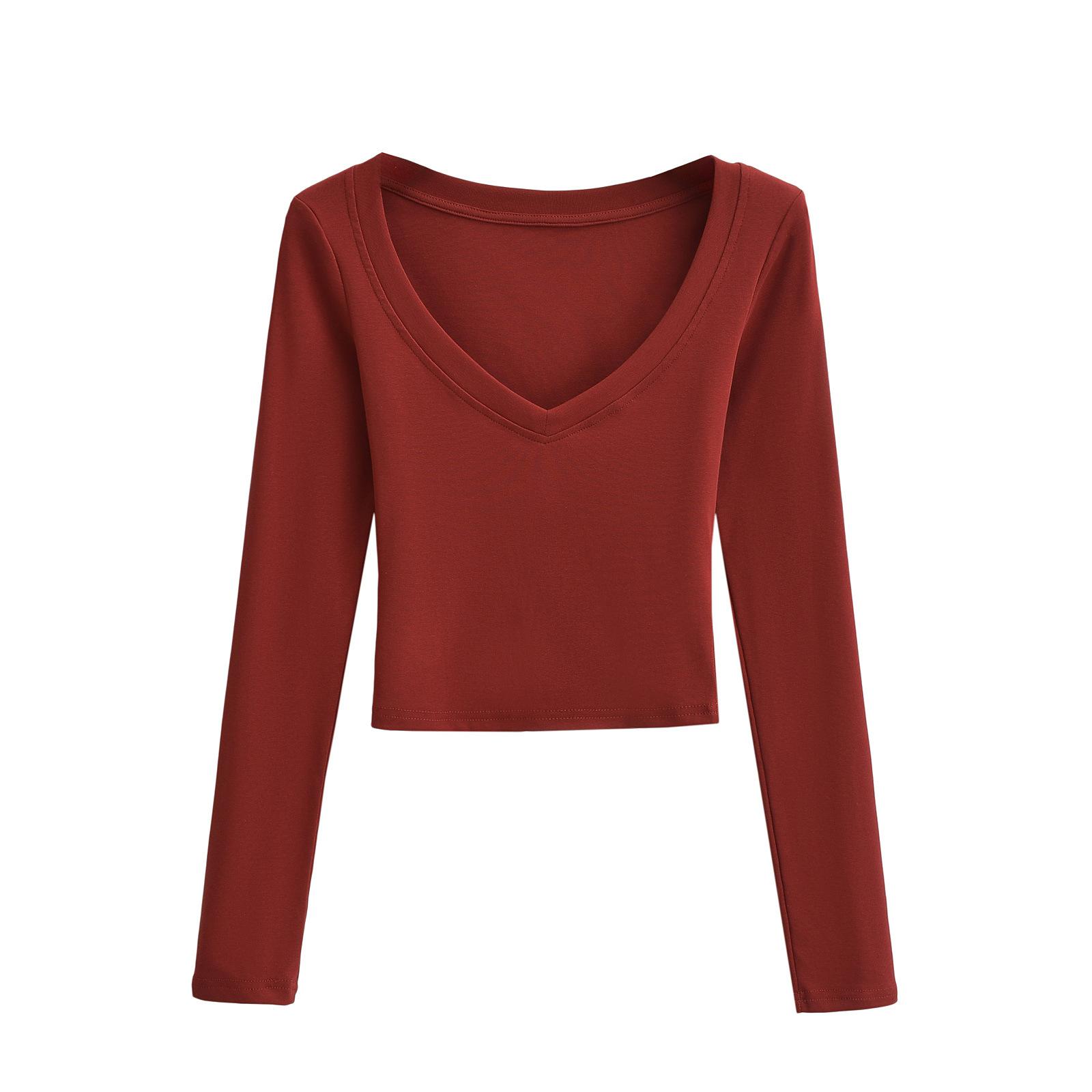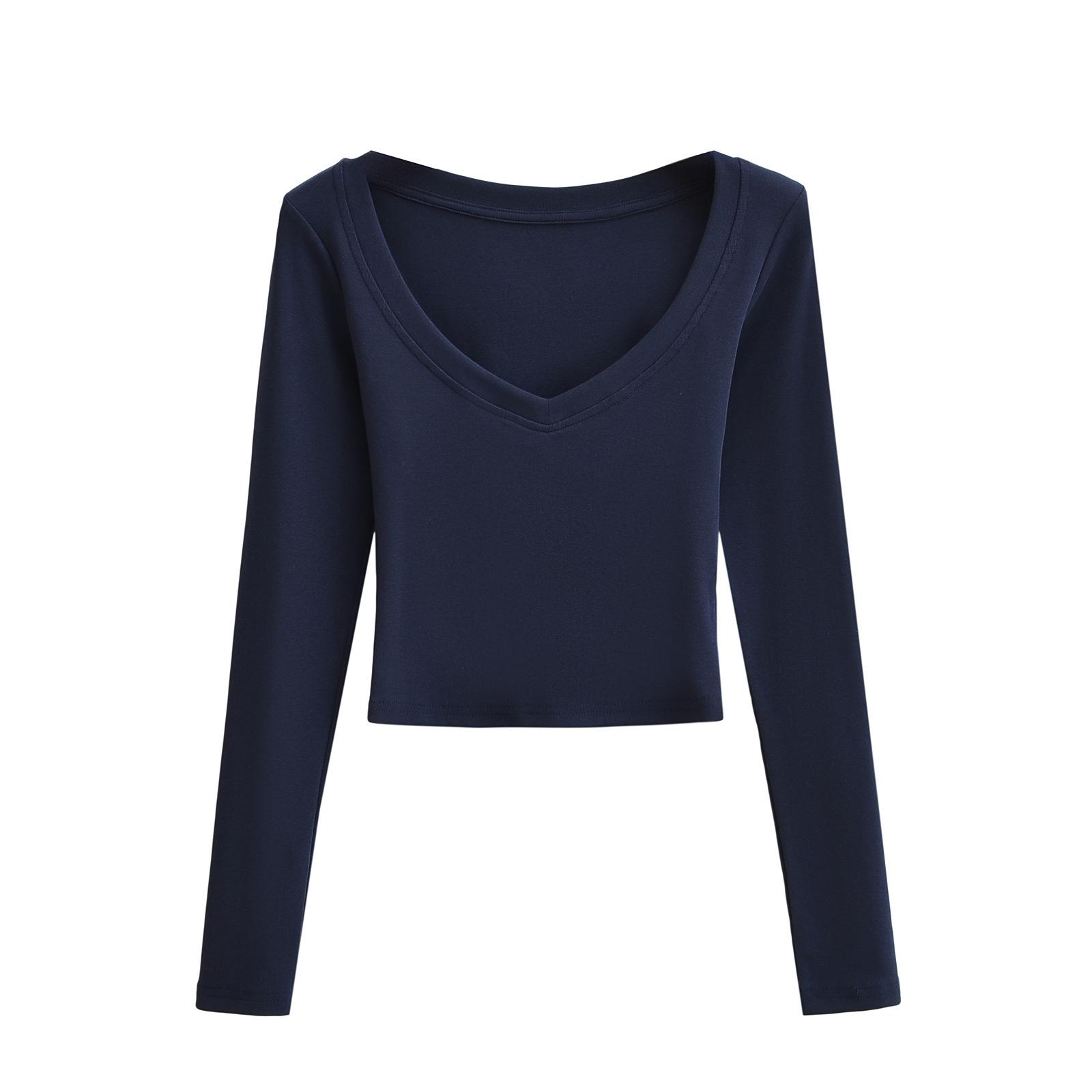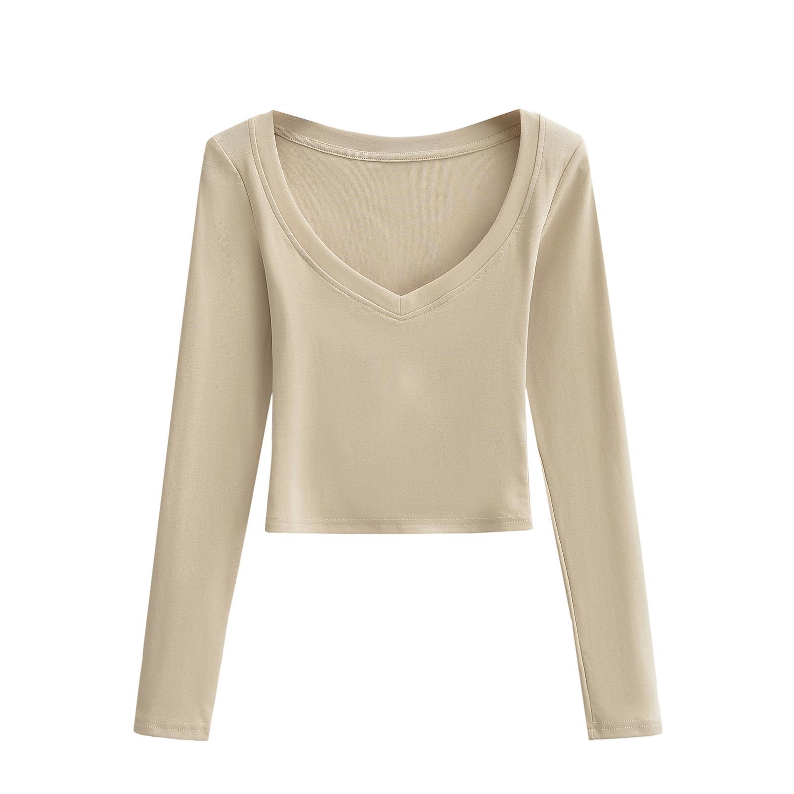 Camiseta de manga larga sencilla de color liso con escote en V profundo y corte entallado para mujer de Spice Girls, otoño de 2024