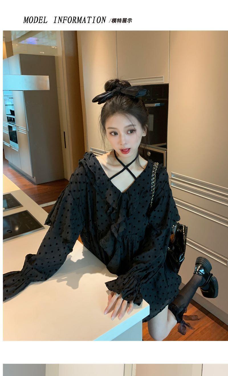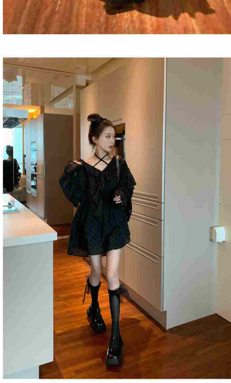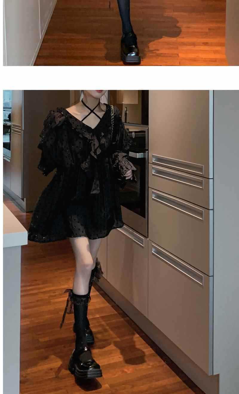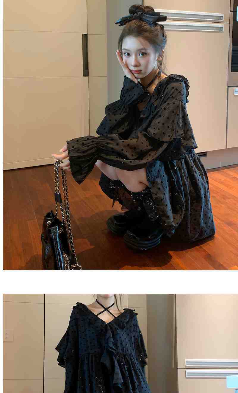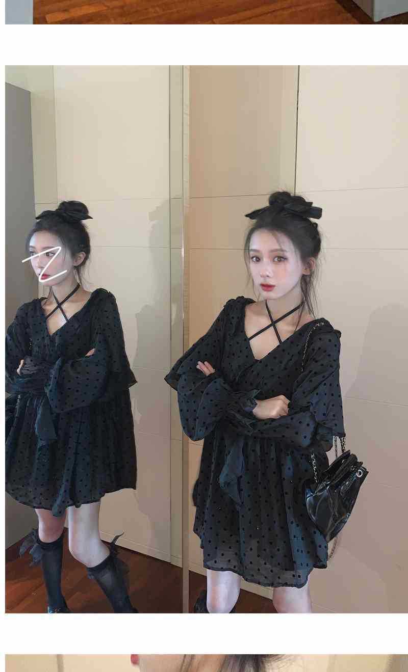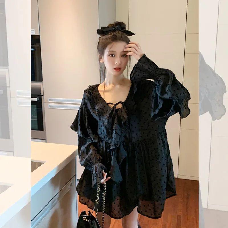 Diseño de cuello en V estilo francés pollae falda pequeña negra con volantes vestido de primavera nuevo dulce y picante cintura manga larga para mujer