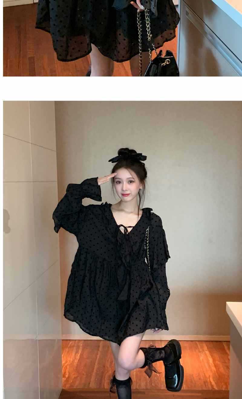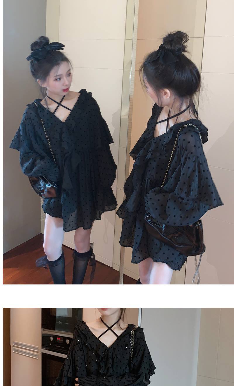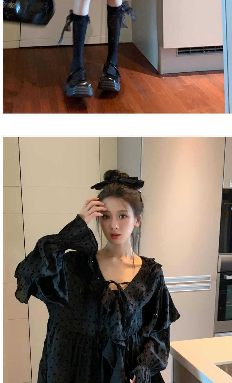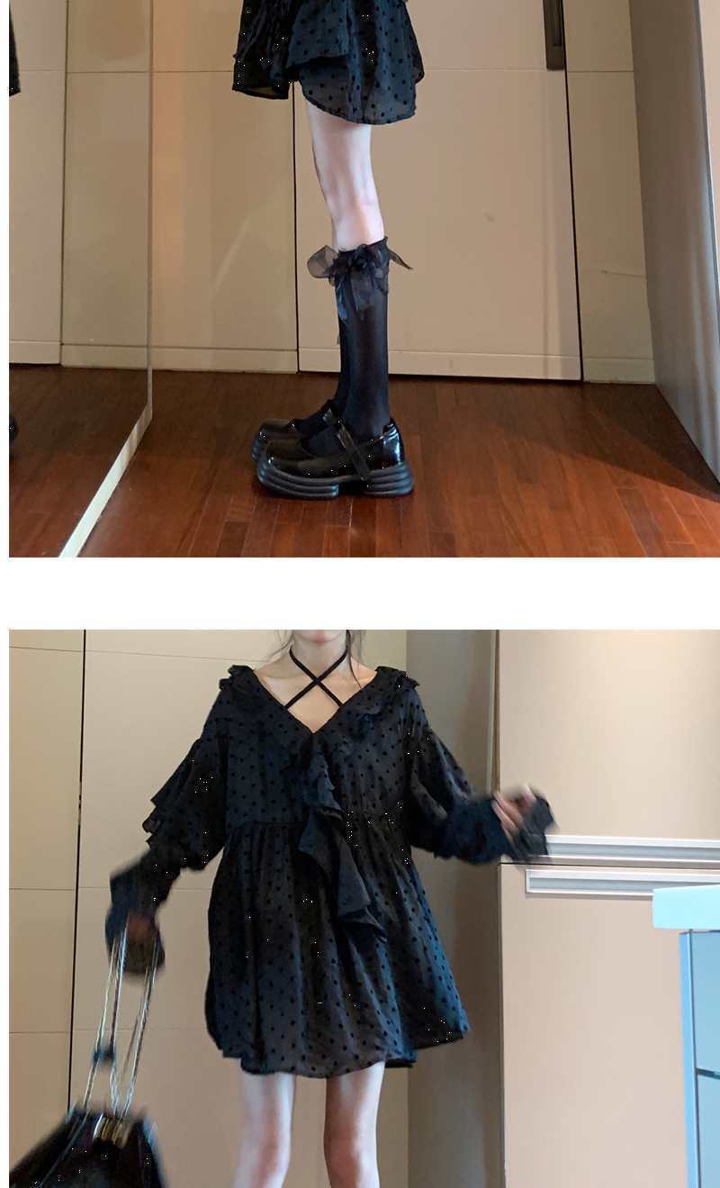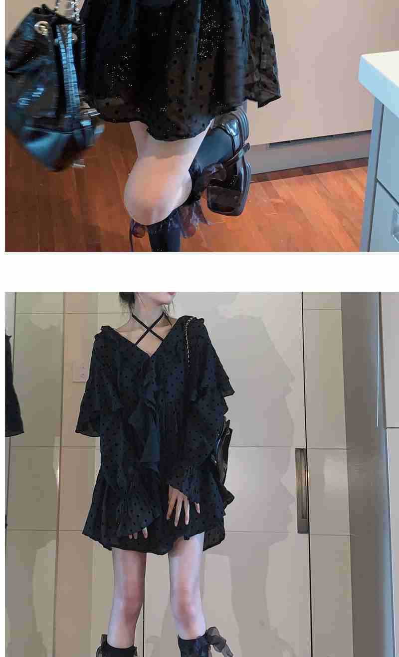 Diseño de cuello en V estilo francés pollae falda pequeña negra con volantes vestido de primavera nuevo dulce y picante cintura manga larga para mujer