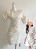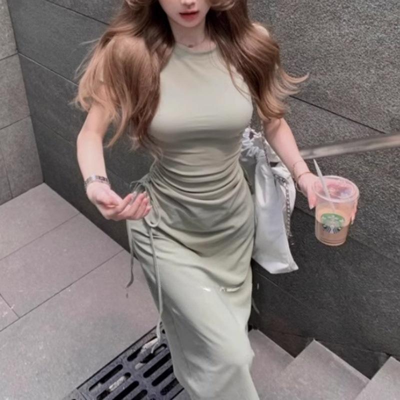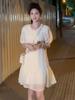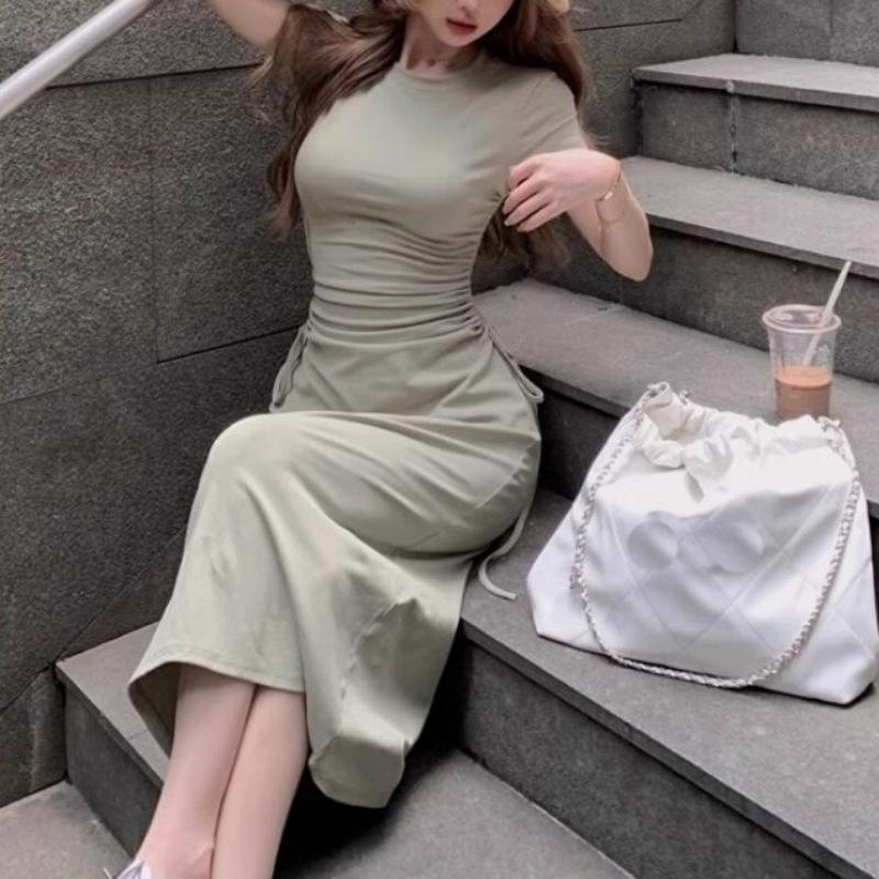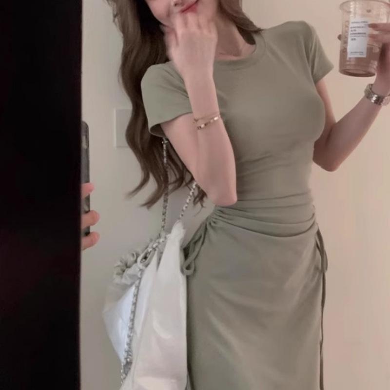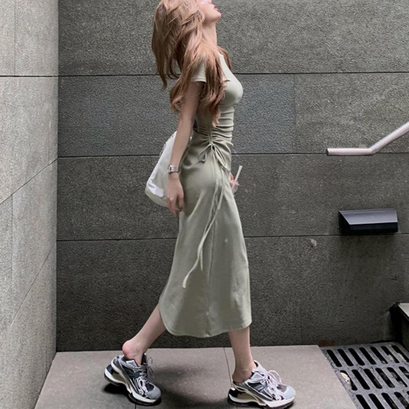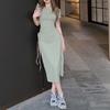 Vestido elegante de estilo francés verde de manga corta para mujer, nuevo vestido de verano con cintura con cordón y falda hasta la rodilla de longitud media.