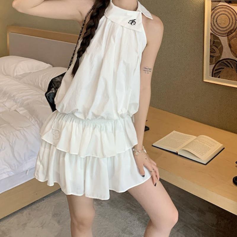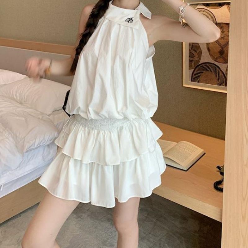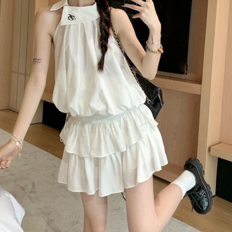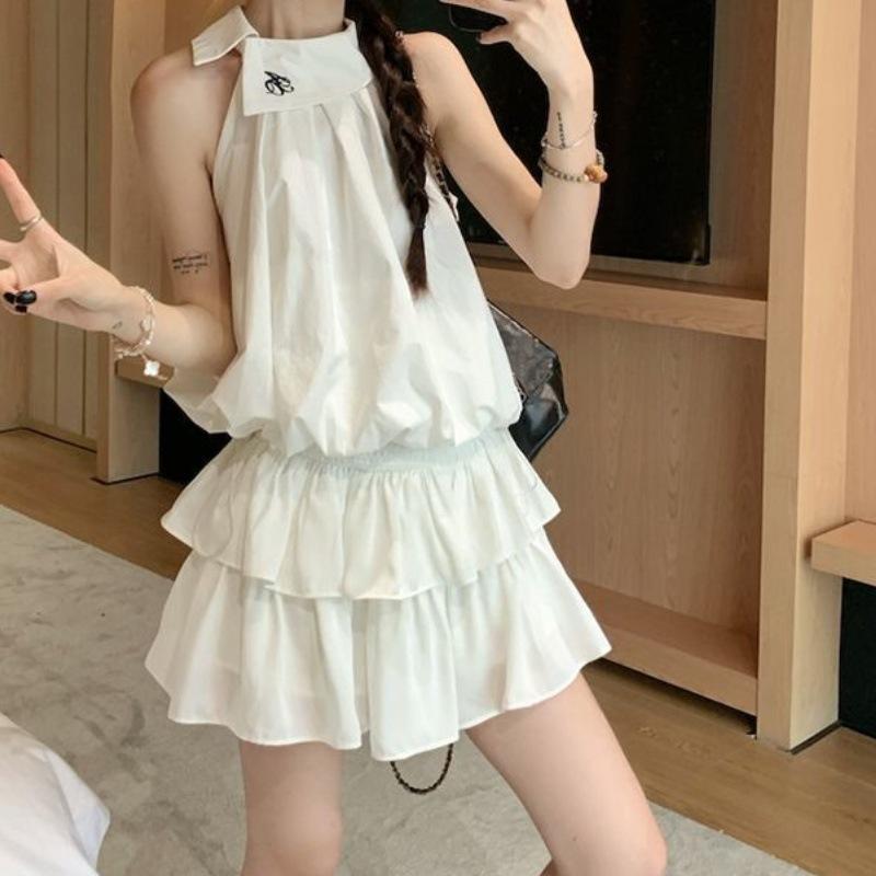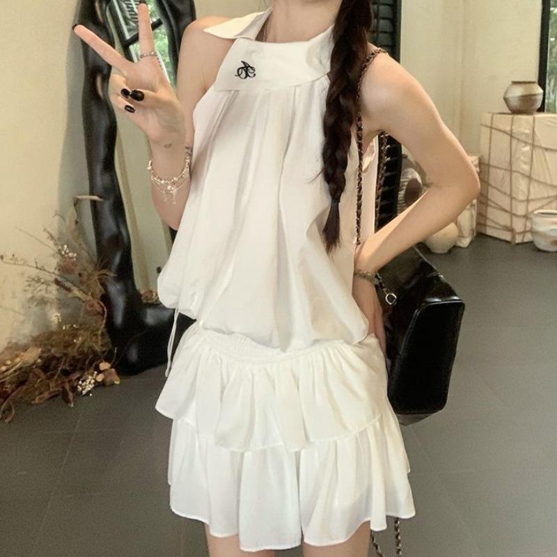 Traje de Chica Sexy Cordón Halter Chaleco sin Mangas Falda Pastel Blanca de Verano para Mujer 2025 Nuevo Conjunto de Dos Piezas