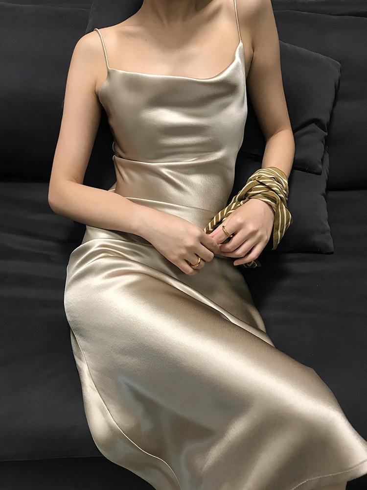 Vestido Pesado de Seda de Alta Calidad Cuello Oscilante Ajustado Elegante Diosa Abanico Seda de Morera Tirantes para Mujer Elegante de Alta Gama Vestido Largo