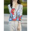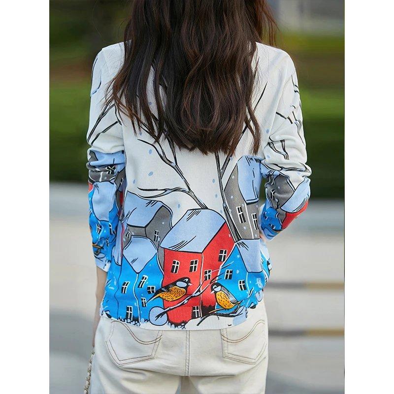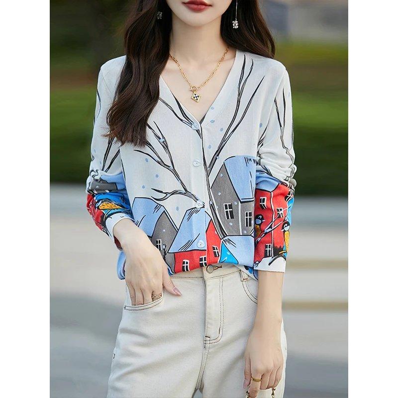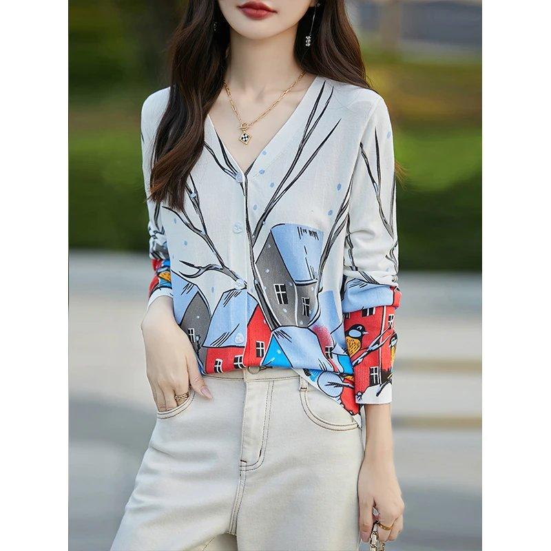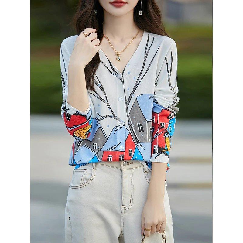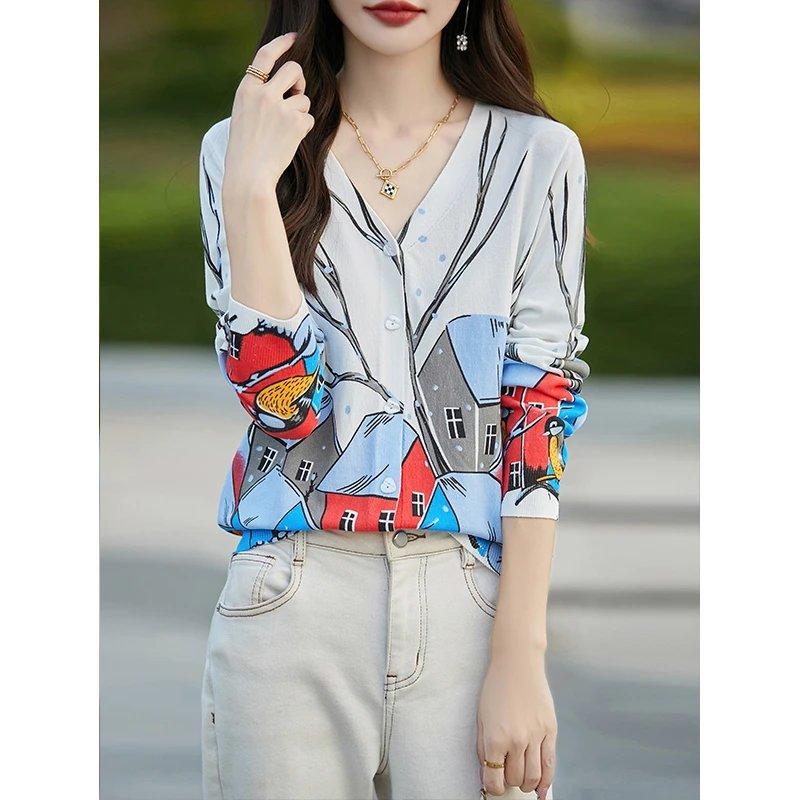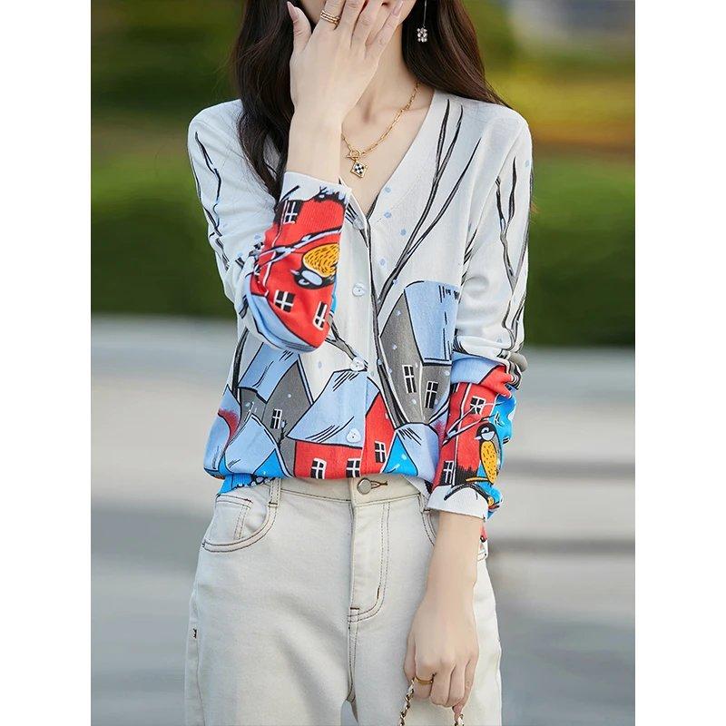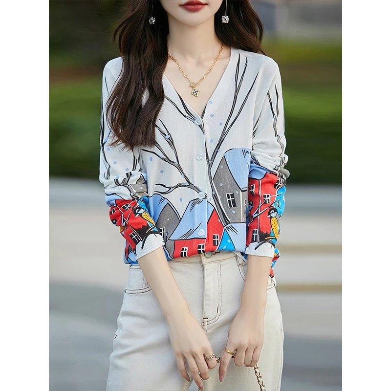Cárdigan de Seda de Hielo Estampado para Mujer Estación Europea Primavera y Otoño 2025 Nueva Chaqueta de Moda Tejido de Punto Suelto de Manga Larga