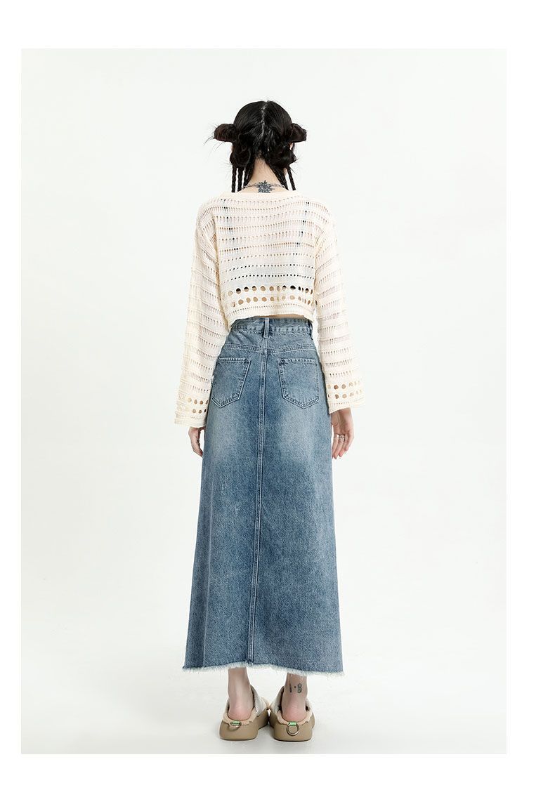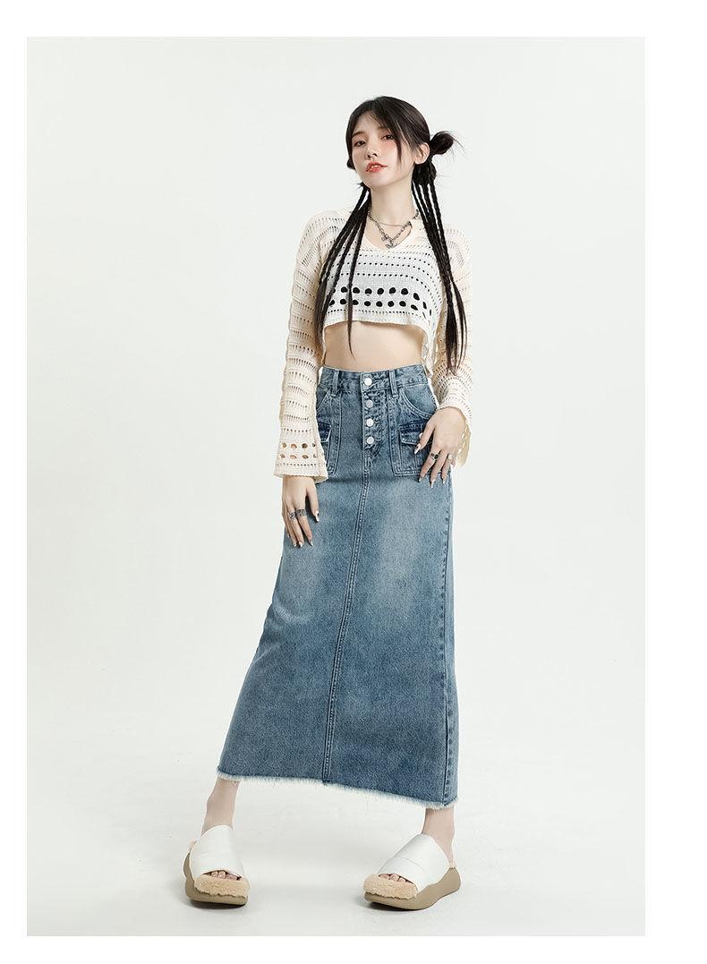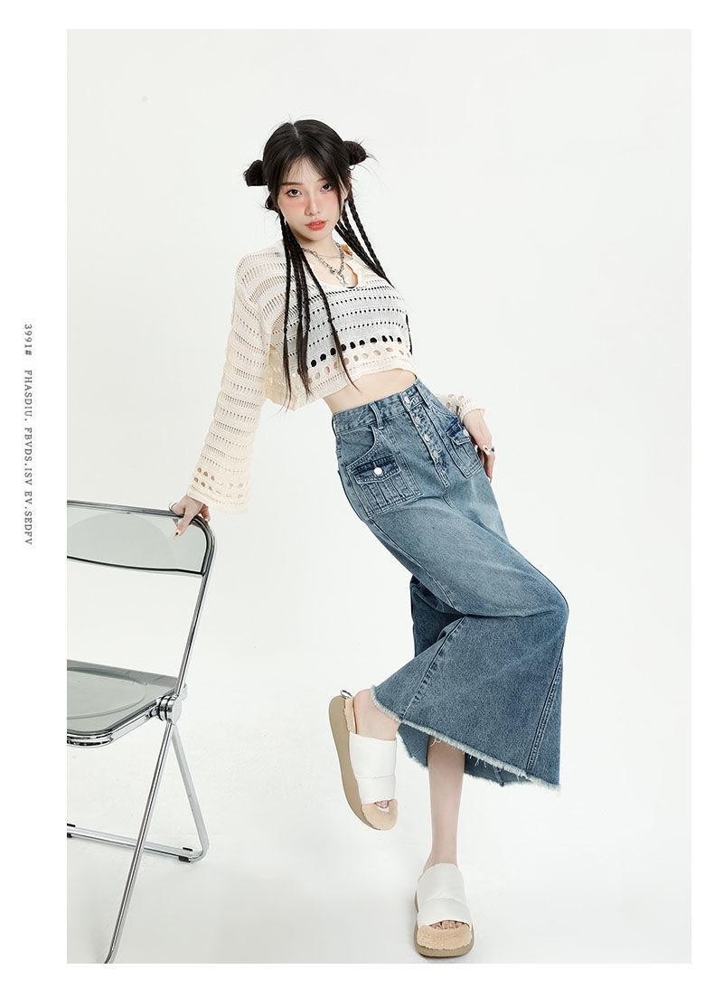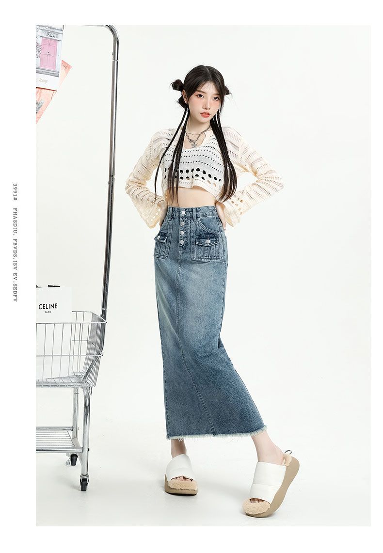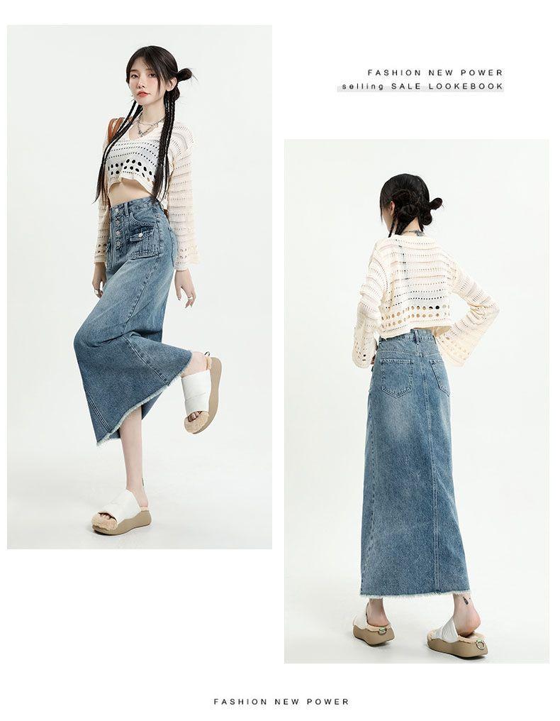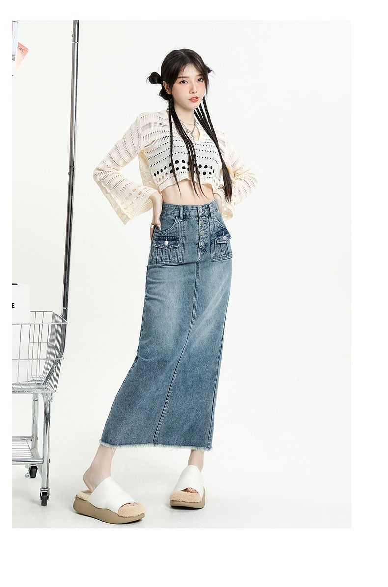 Falda americana de cintura alta, estilo A, estilo retro, azul, para mujer, primavera y verano, longitud media, estilo 2024, falda vaquera con rebabas