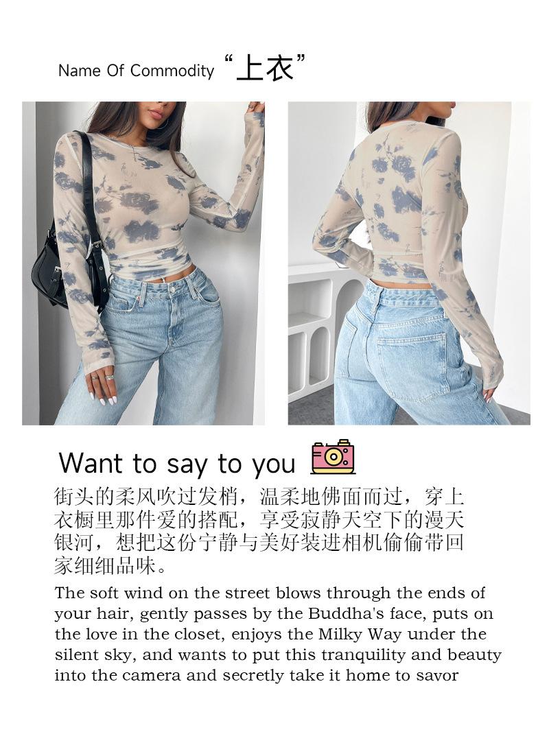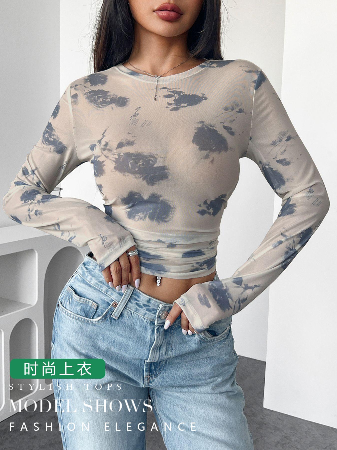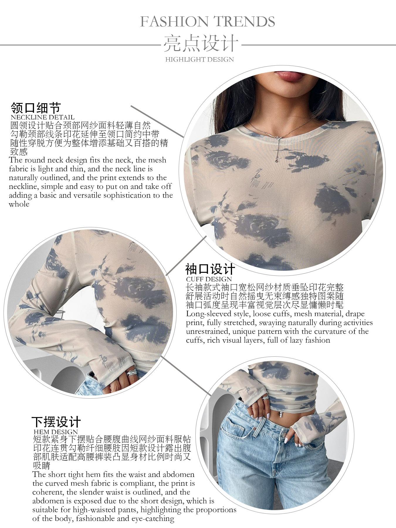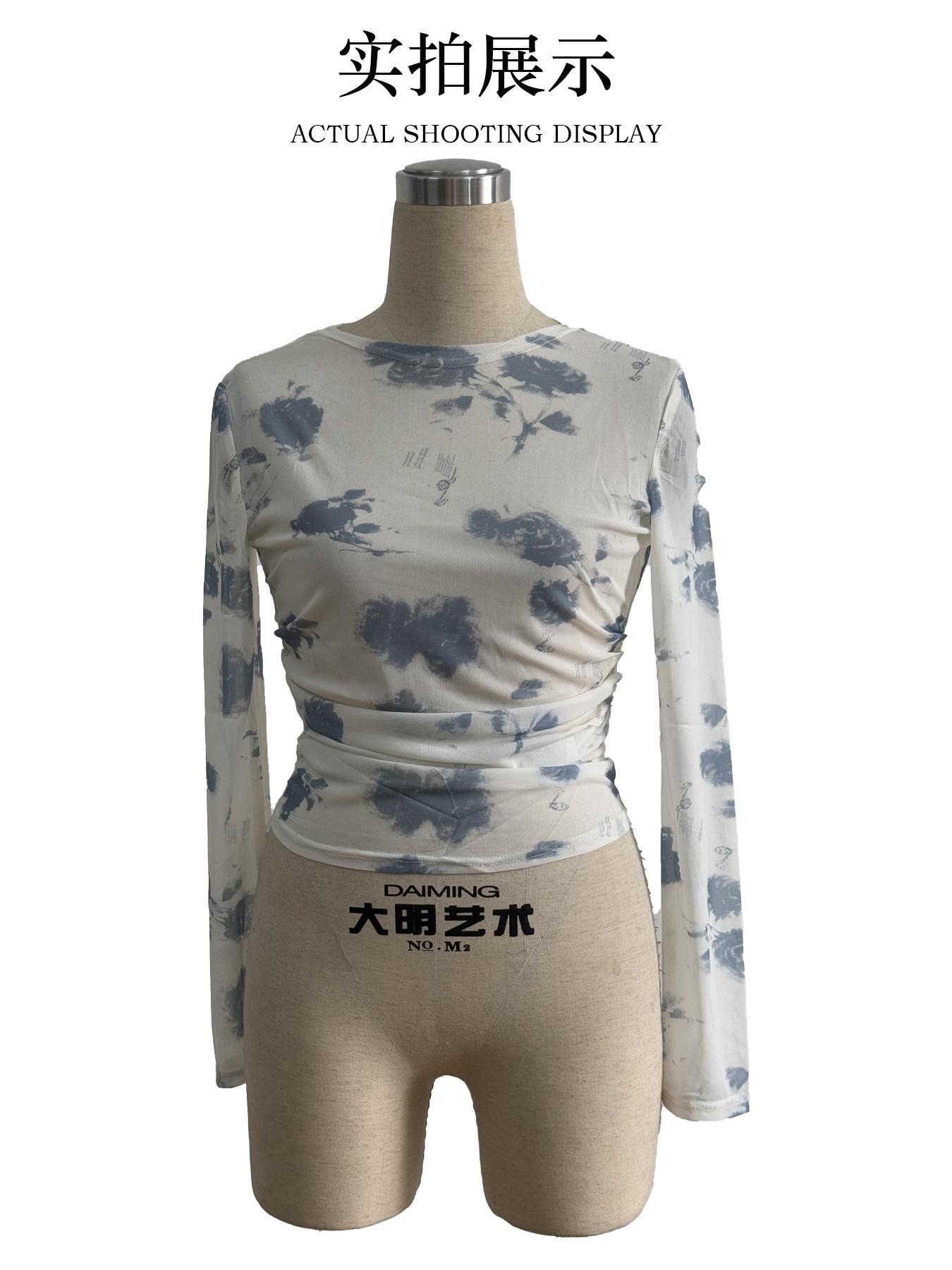 Europeo y Americano Transfronterizo 2025 Nuevo Otoño e Invierno Elegante Tops Cortos Laterales Plisados con Estampado Floral de Malla para Mujer