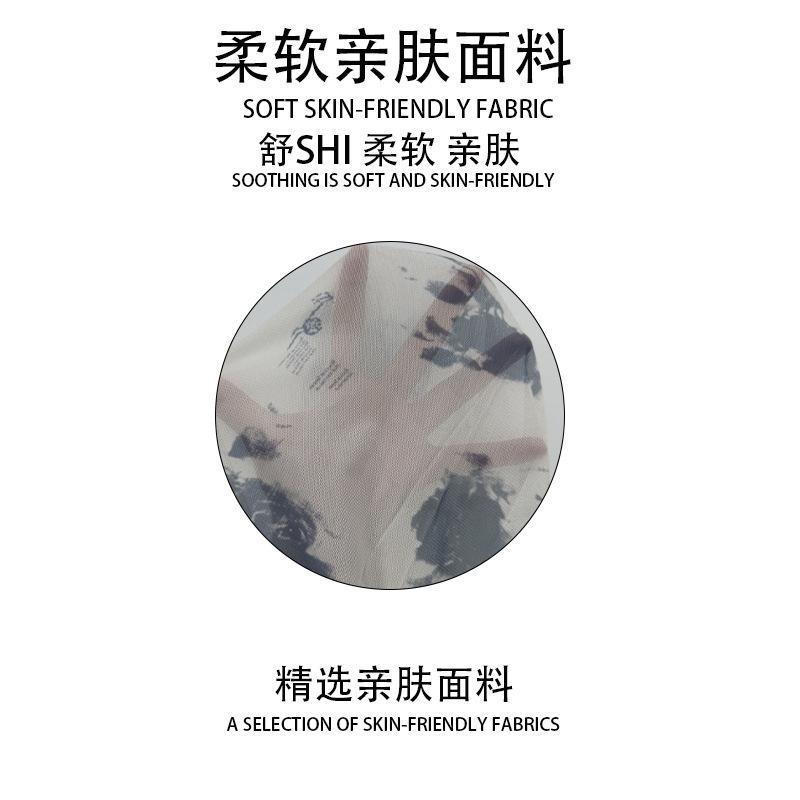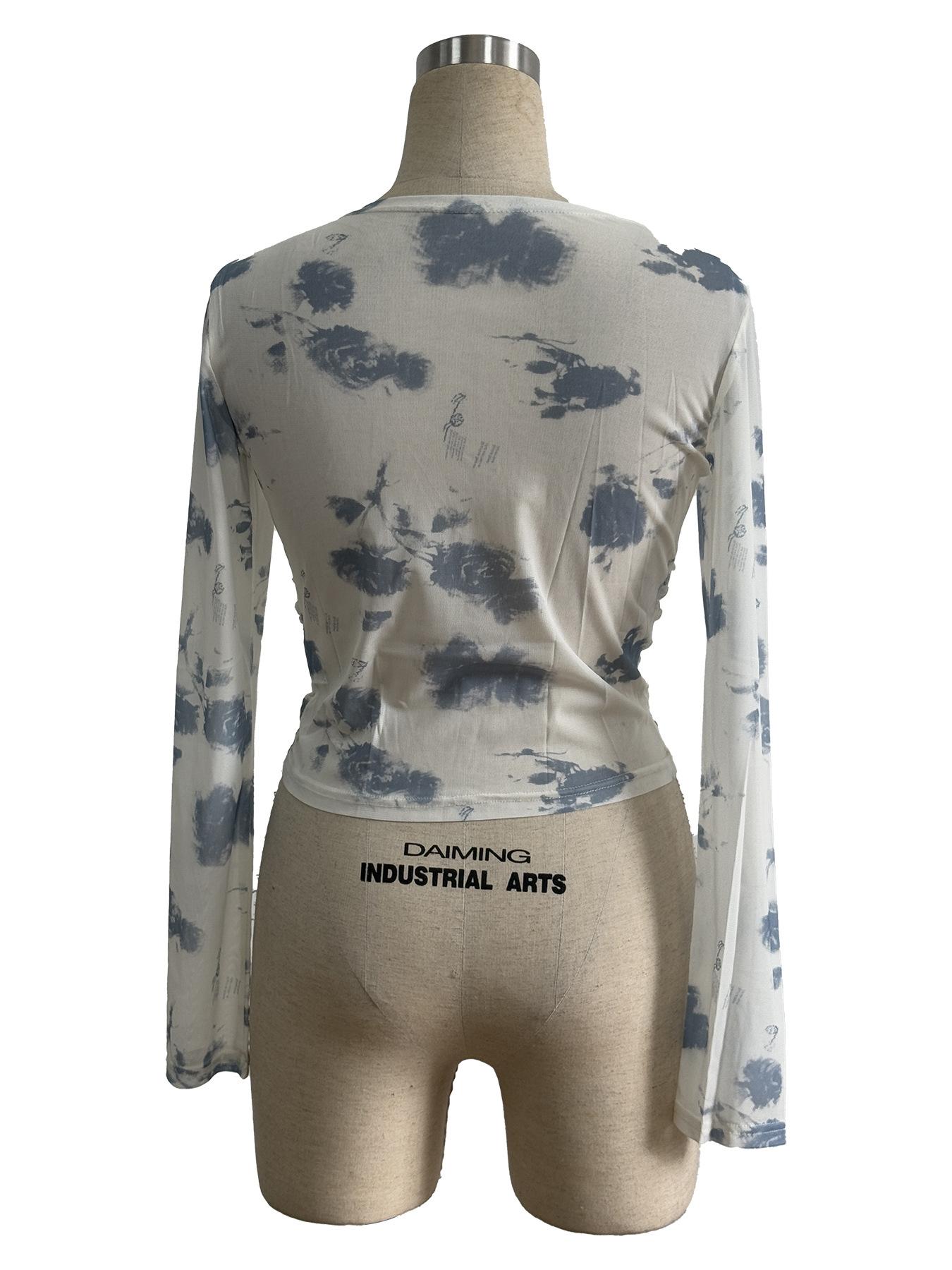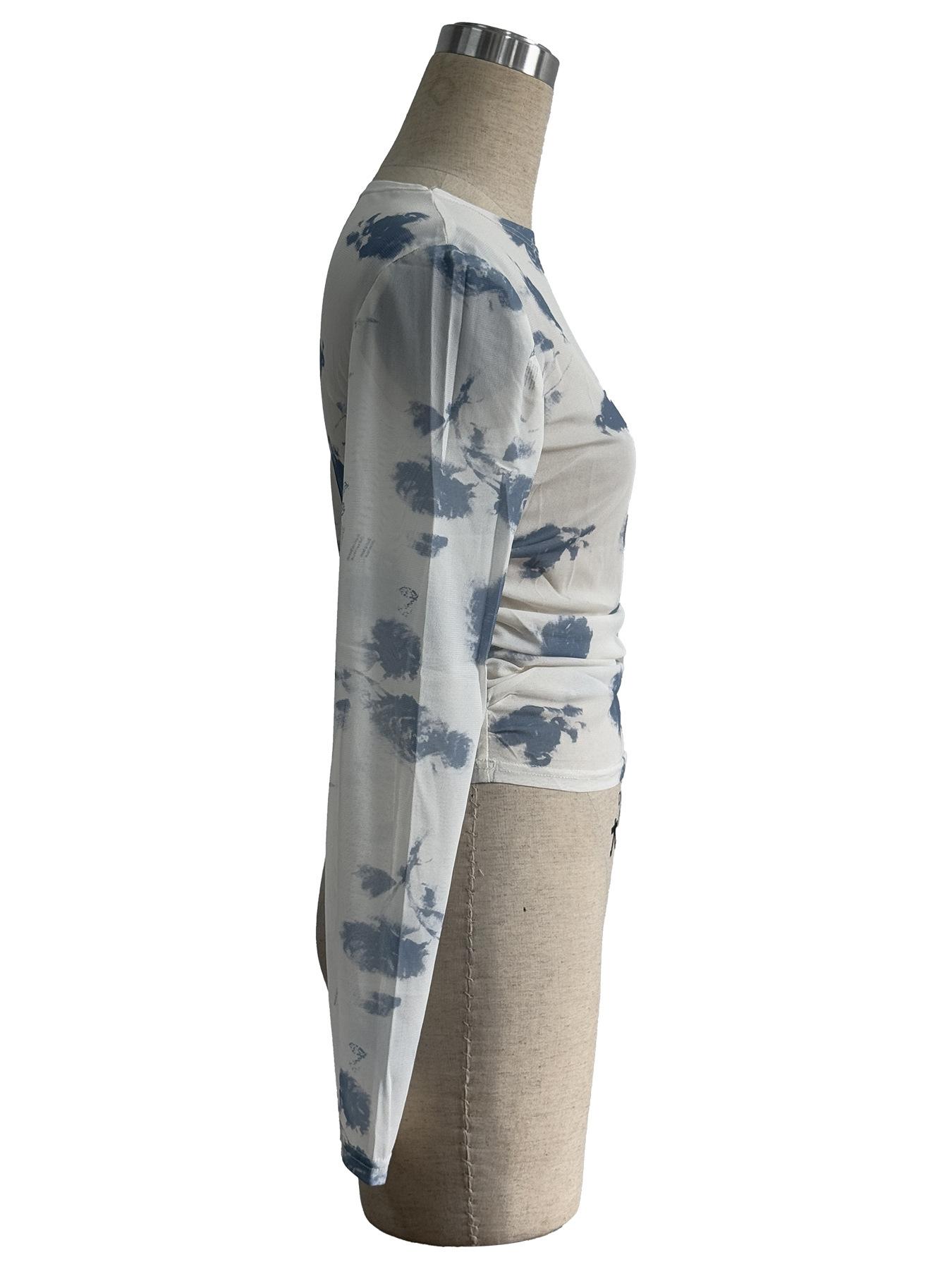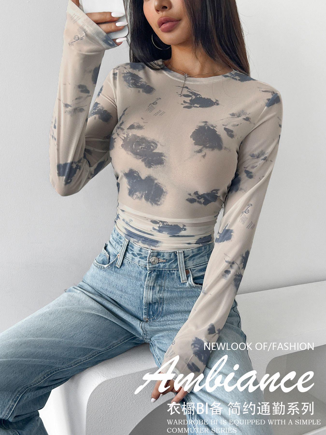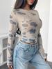 Europeo y Americano Transfronterizo 2025 Nuevo Otoño e Invierno Elegante Tops Cortos Laterales Plisados con Estampado Floral de Malla para Mujer