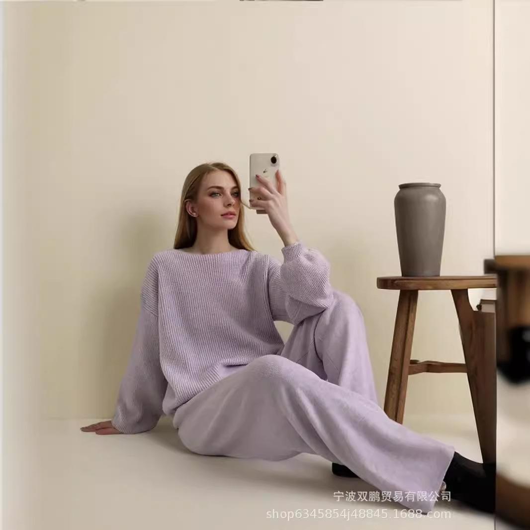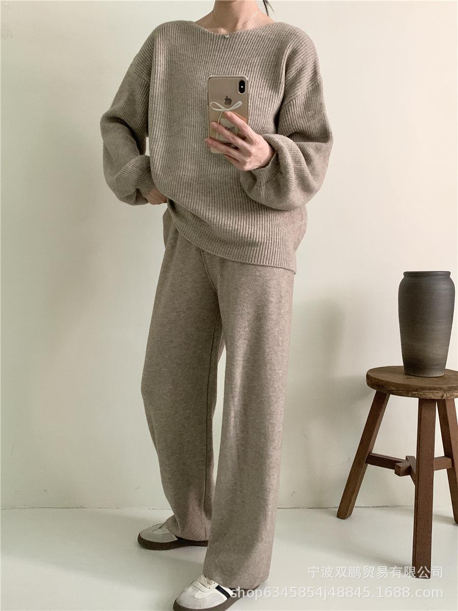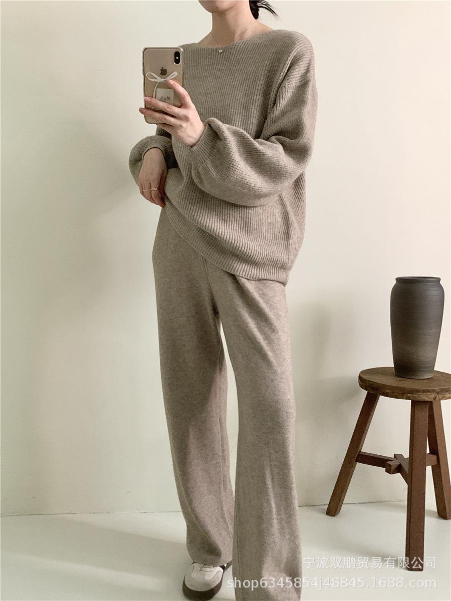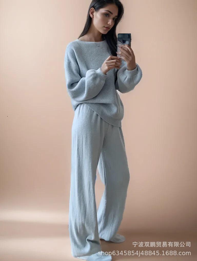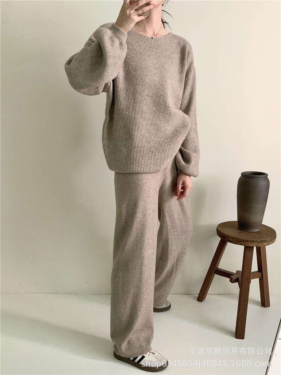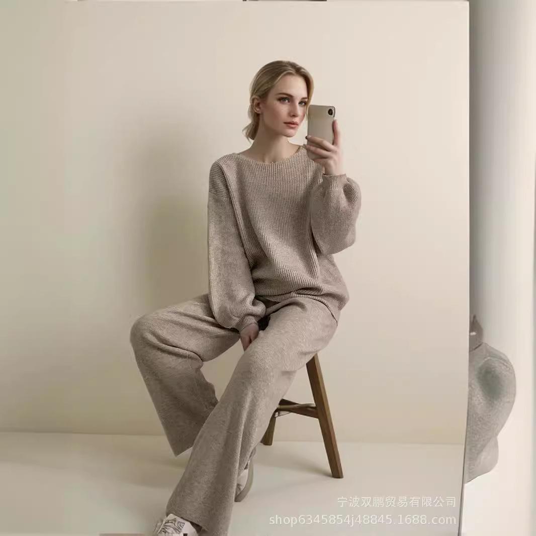 Traje de punto holgado de estilo europeo y americano transfronterizo de gran venta para mujer 2025 Otoño e Invierno Nuevo Suéter de cuello redondo + Pantalón de pierna ancha Foto real