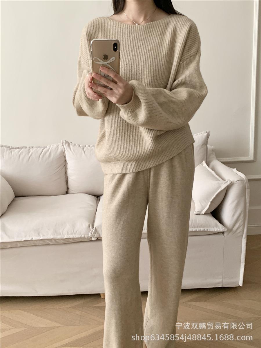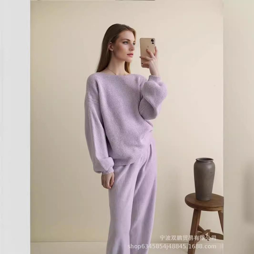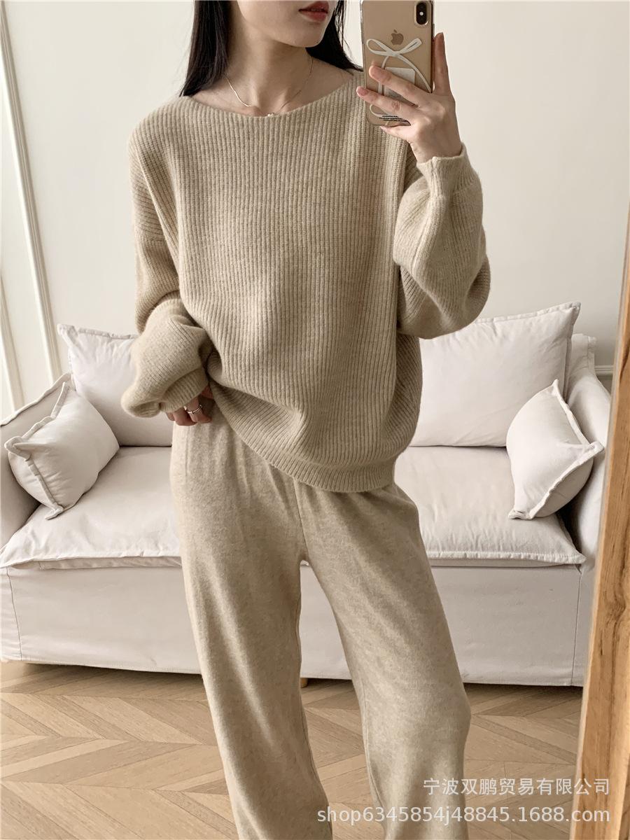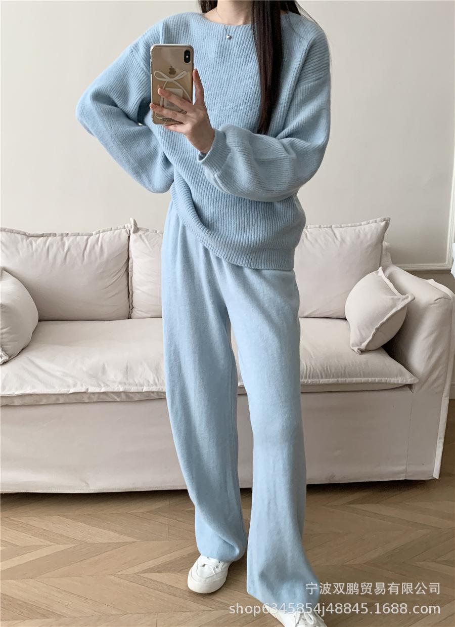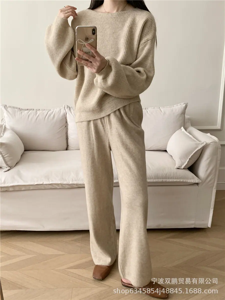 Traje de punto holgado de estilo europeo y americano transfronterizo de gran venta para mujer 2025 Otoño e Invierno Nuevo Suéter de cuello redondo + Pantalón de pierna ancha Foto real